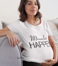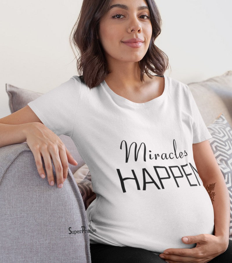 Miracles Happen Christian Maternity T Shirt is stylish for mama to be and very comfortable to wear. This bible scripture maternity t shirt is designed to show off your blessings from the Lord. Wear this pregnancy t shirt to carry the promise of God in you and your little one life. The children are a gift from God.