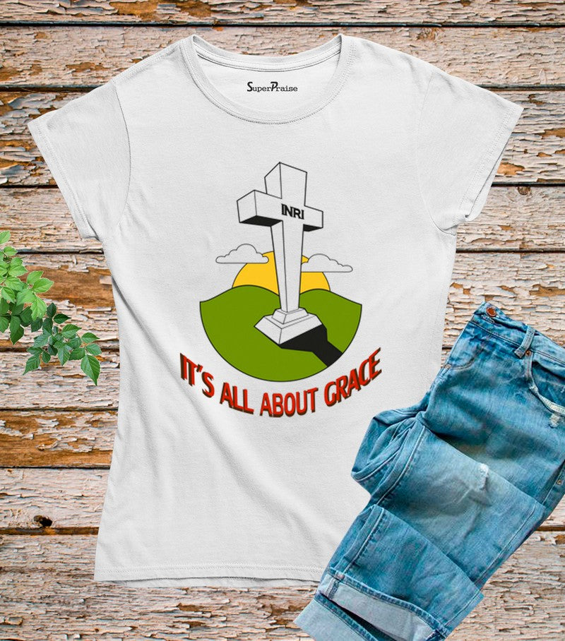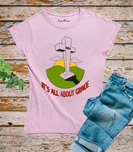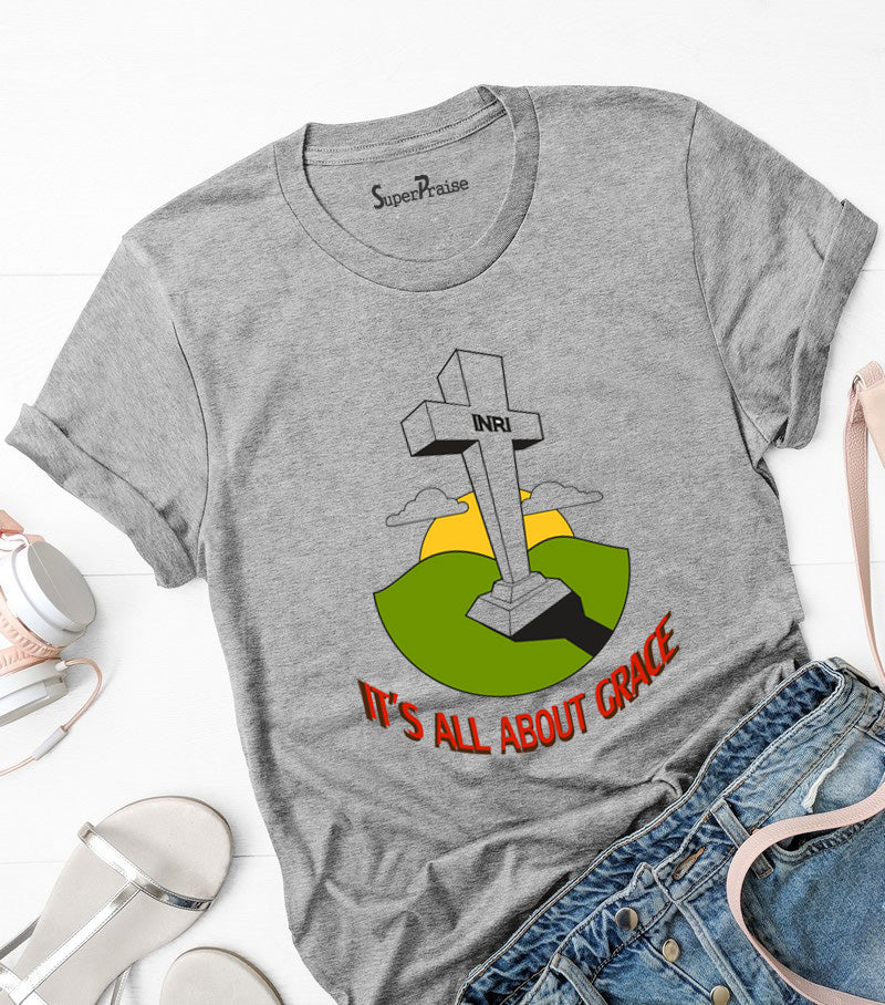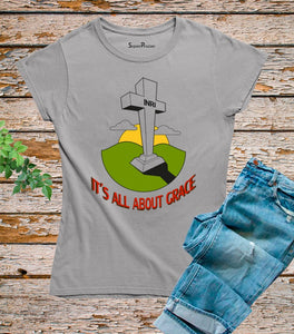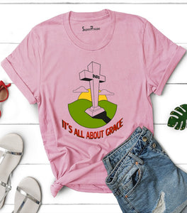 It's All About Grace T Shirt is stylish and comfortable to wear while spreading the gospel. This printed bible scripture tee is a way to let people know that you belong to Jesus Christ and proclaim the love of God without saying a word.