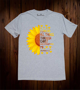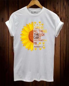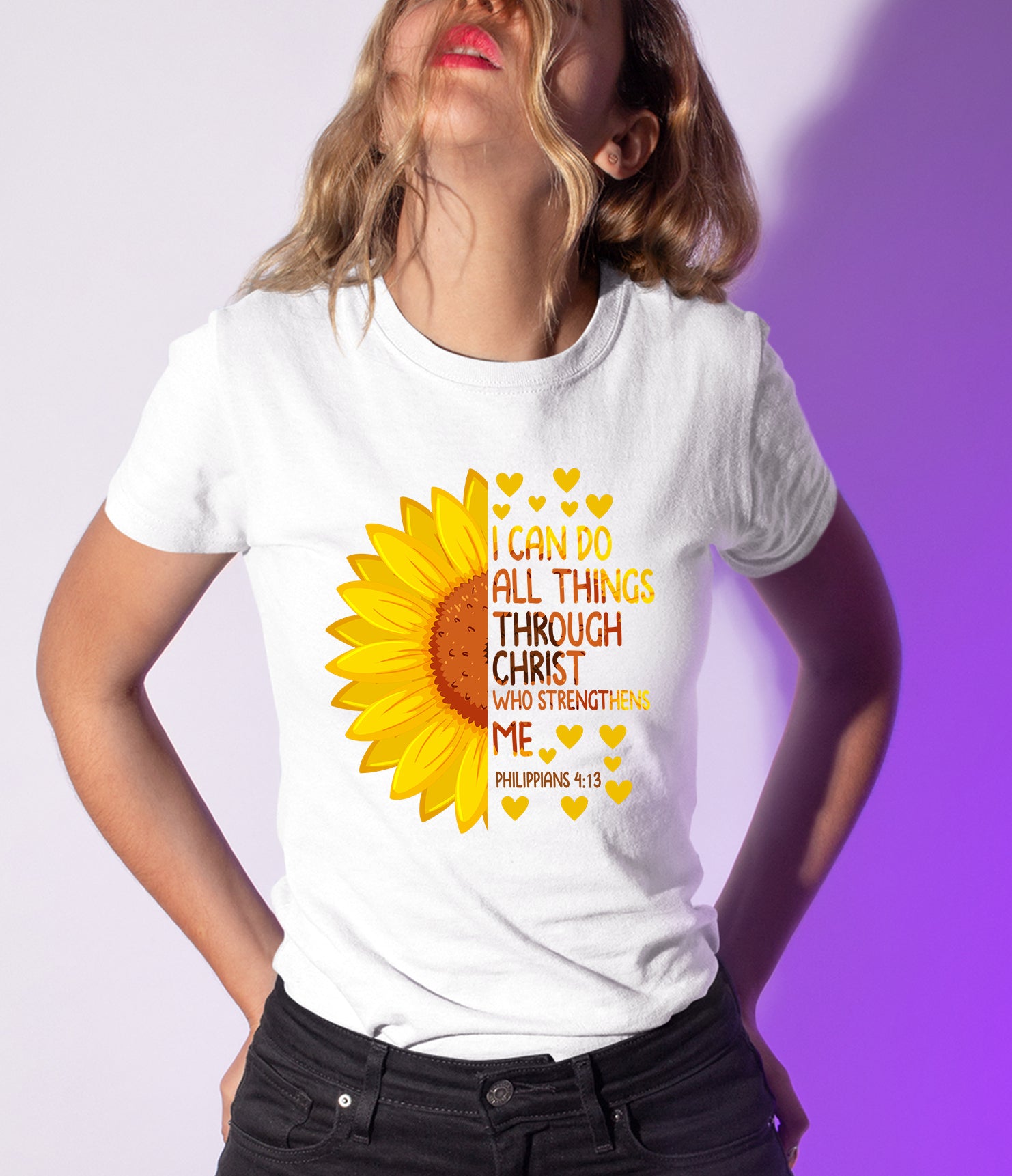 This I Can Do All Things Through Christ Sunflower T Shirt is the perfect addition to your wardrobe. Made with high-quality materials, this shirt features a beautiful sunflower design and the empowering message "I Can Do All Things Through Christ." Show off your faith while also staying stylish and comfortable.