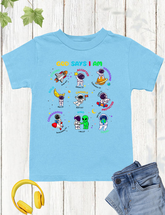 God Says I am Strong Accepted Handsome Bold Capable Protected Kind Loyal Kids tee