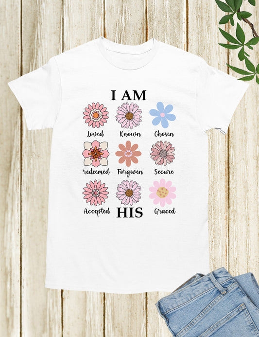 I AM HIS Loved Known Chosen Redeemed Forgiven Secure Accepted Graced Christian Vintage Distressed Flowers Shirt