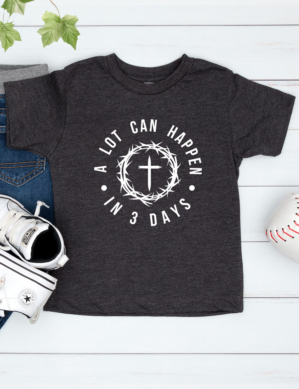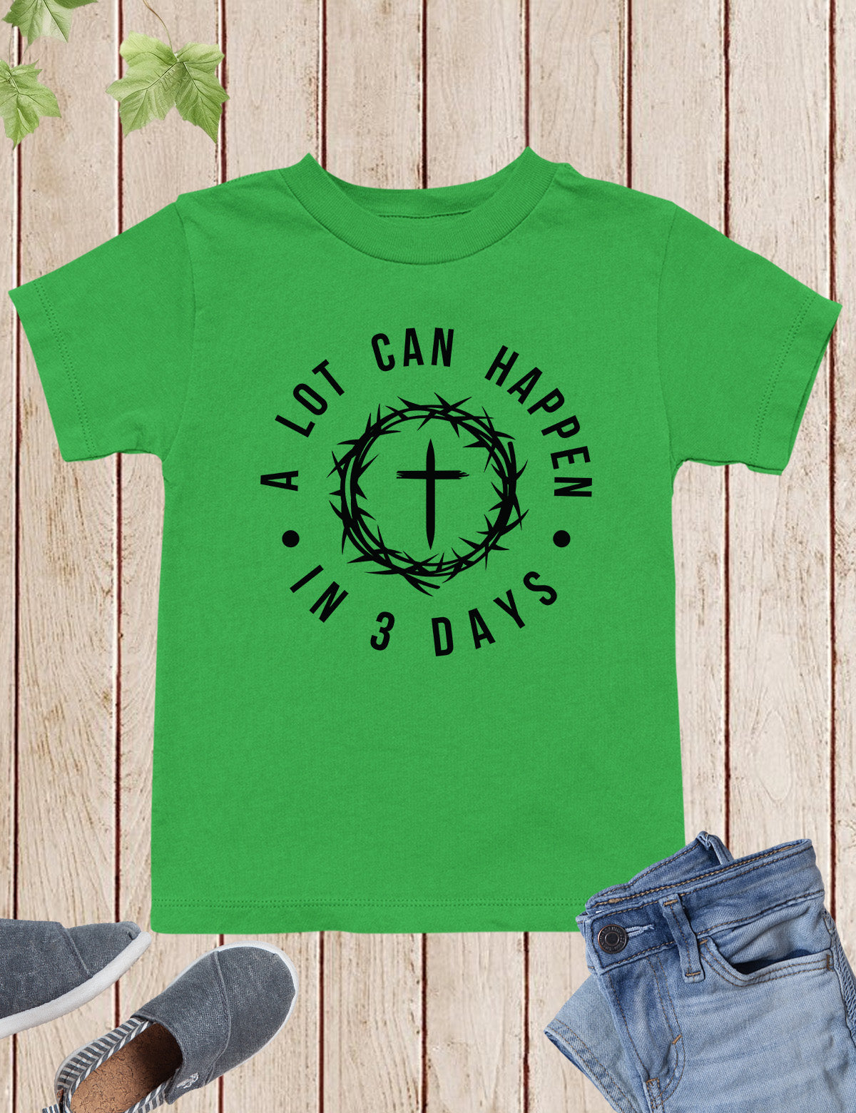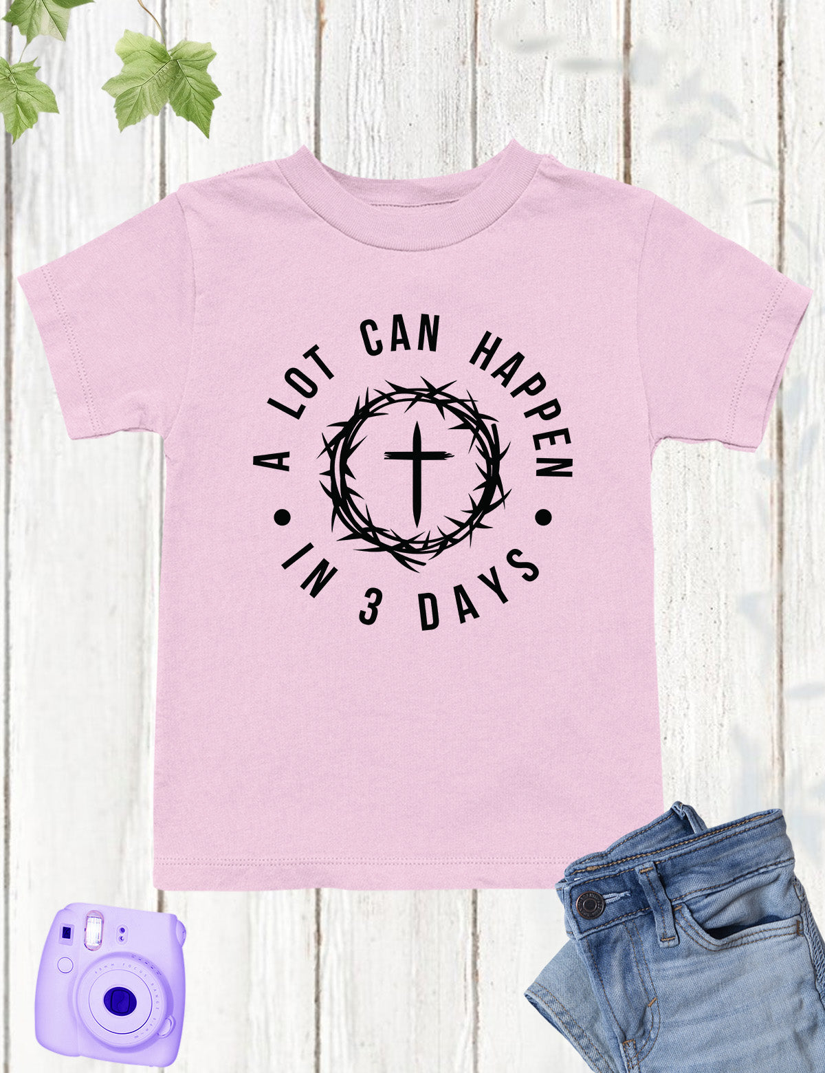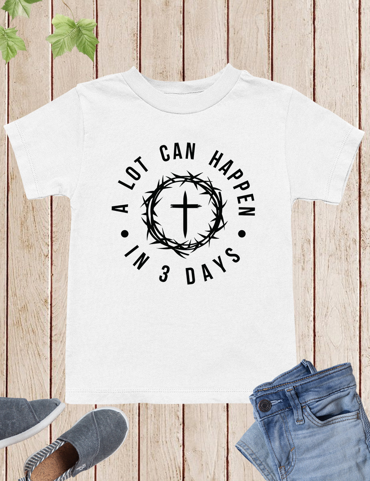 This Christian kids Easter shirt reminds children of the power of faith and hope, with its message "A Lot Can happen in 3 days." Perfect for Easter celebrations and everyday wear.