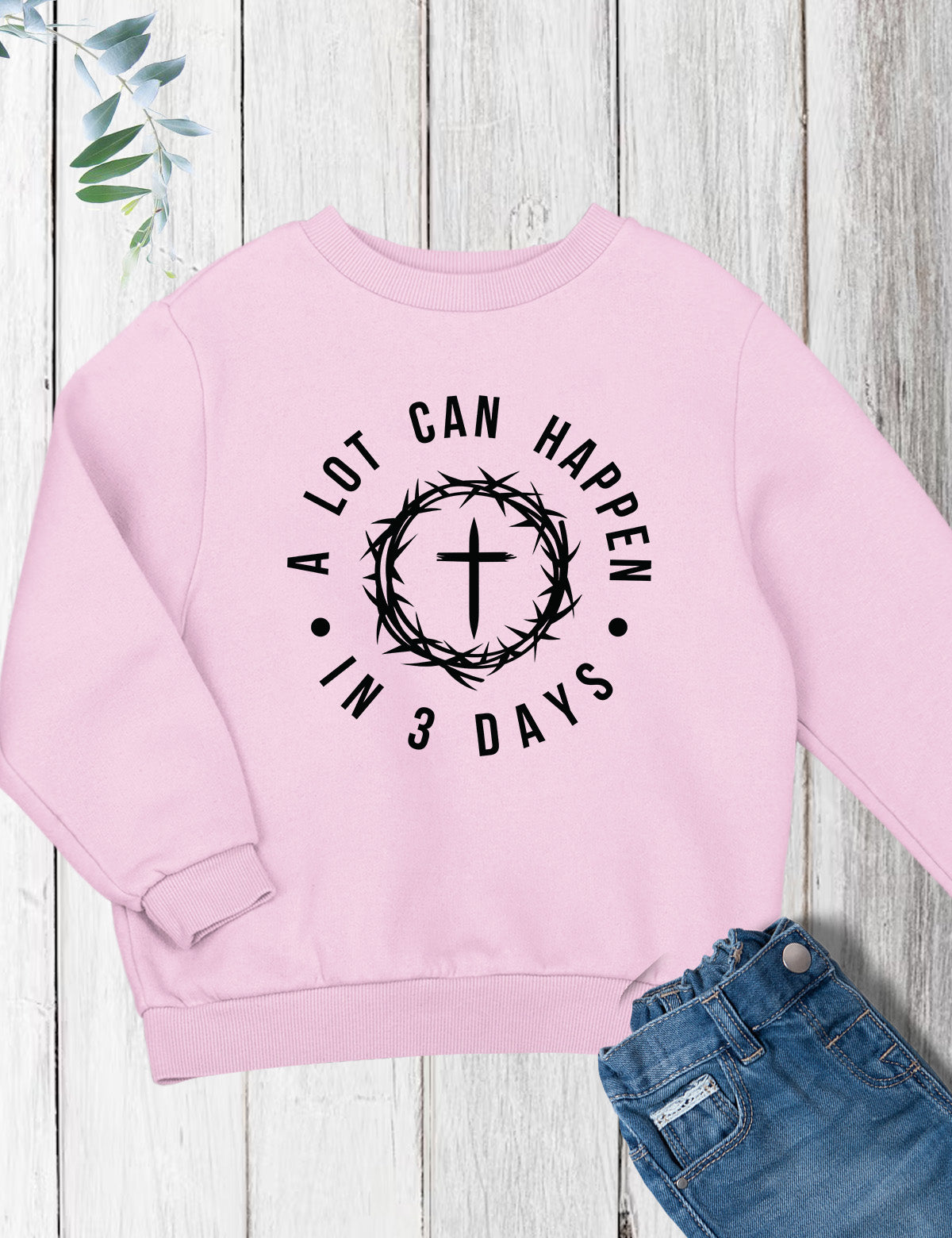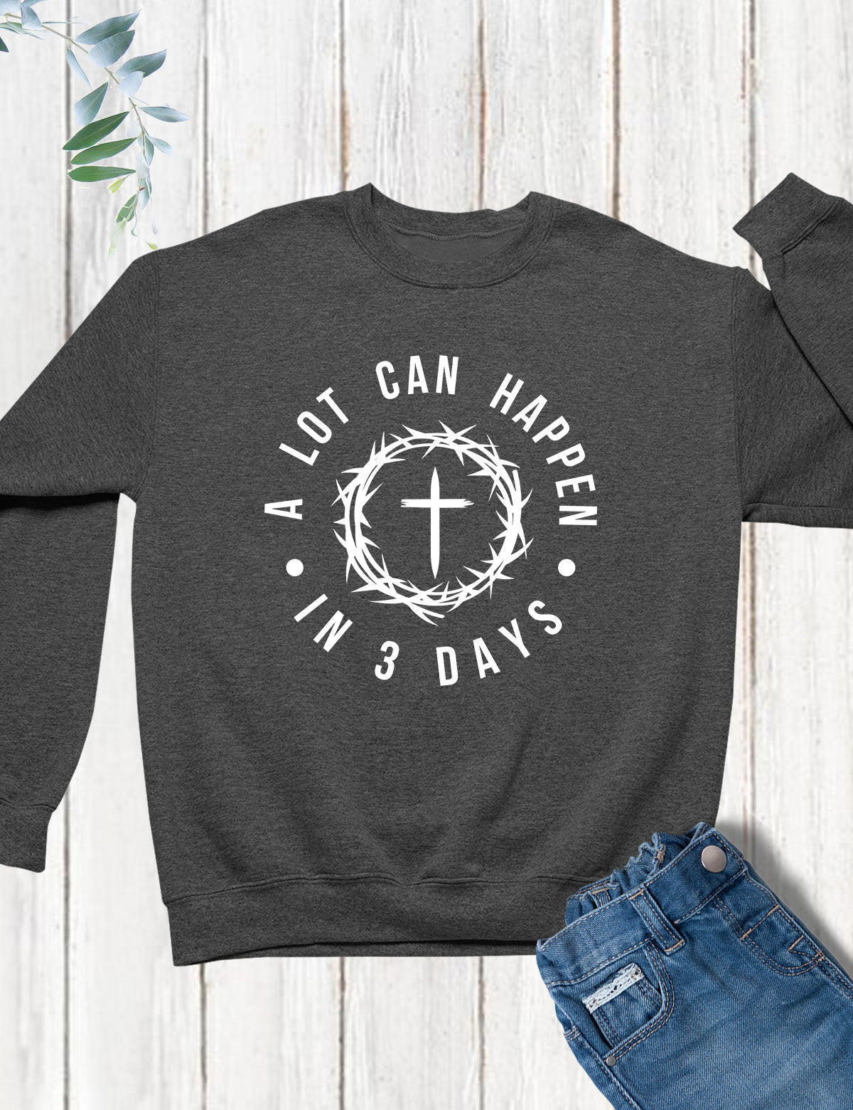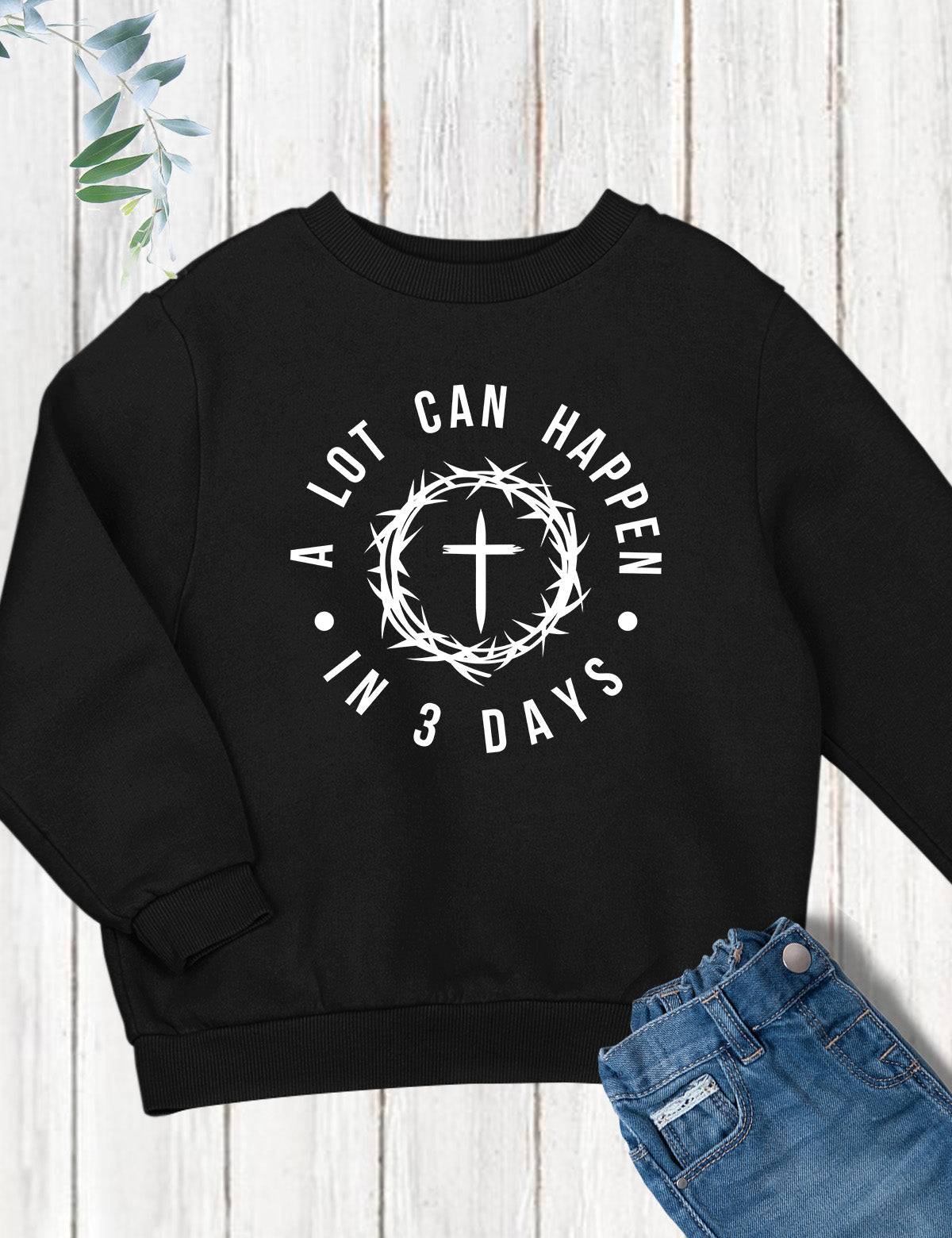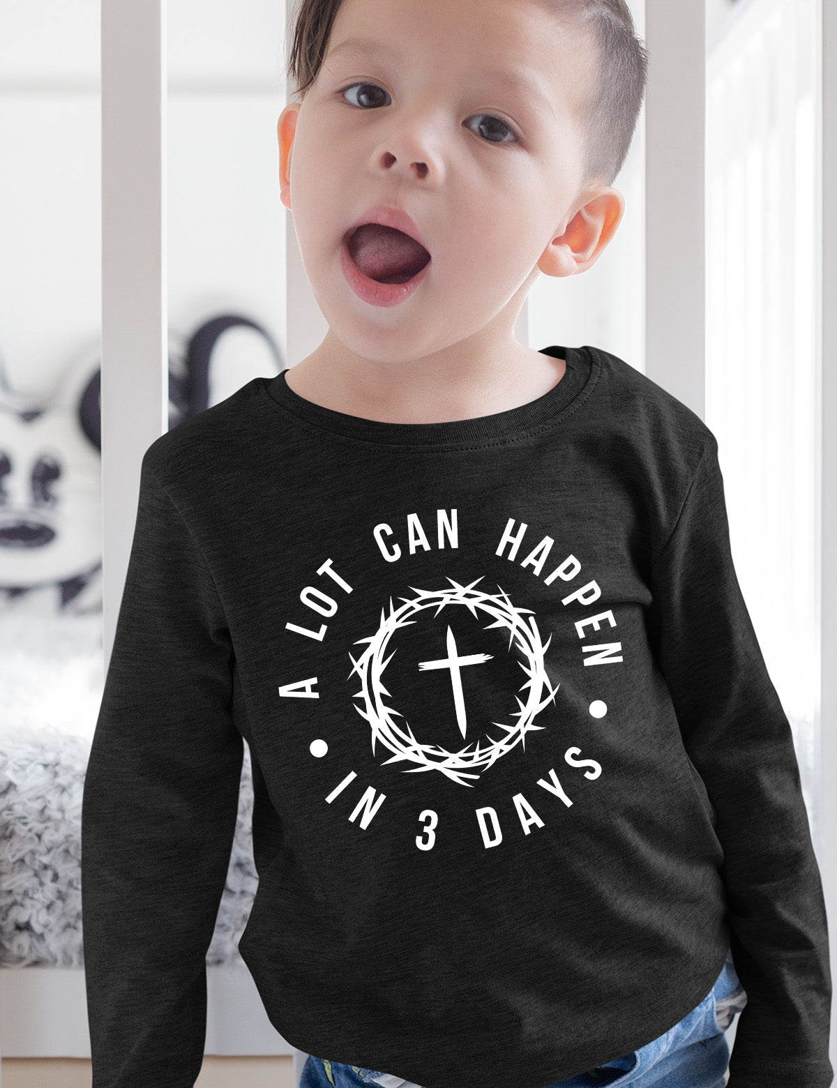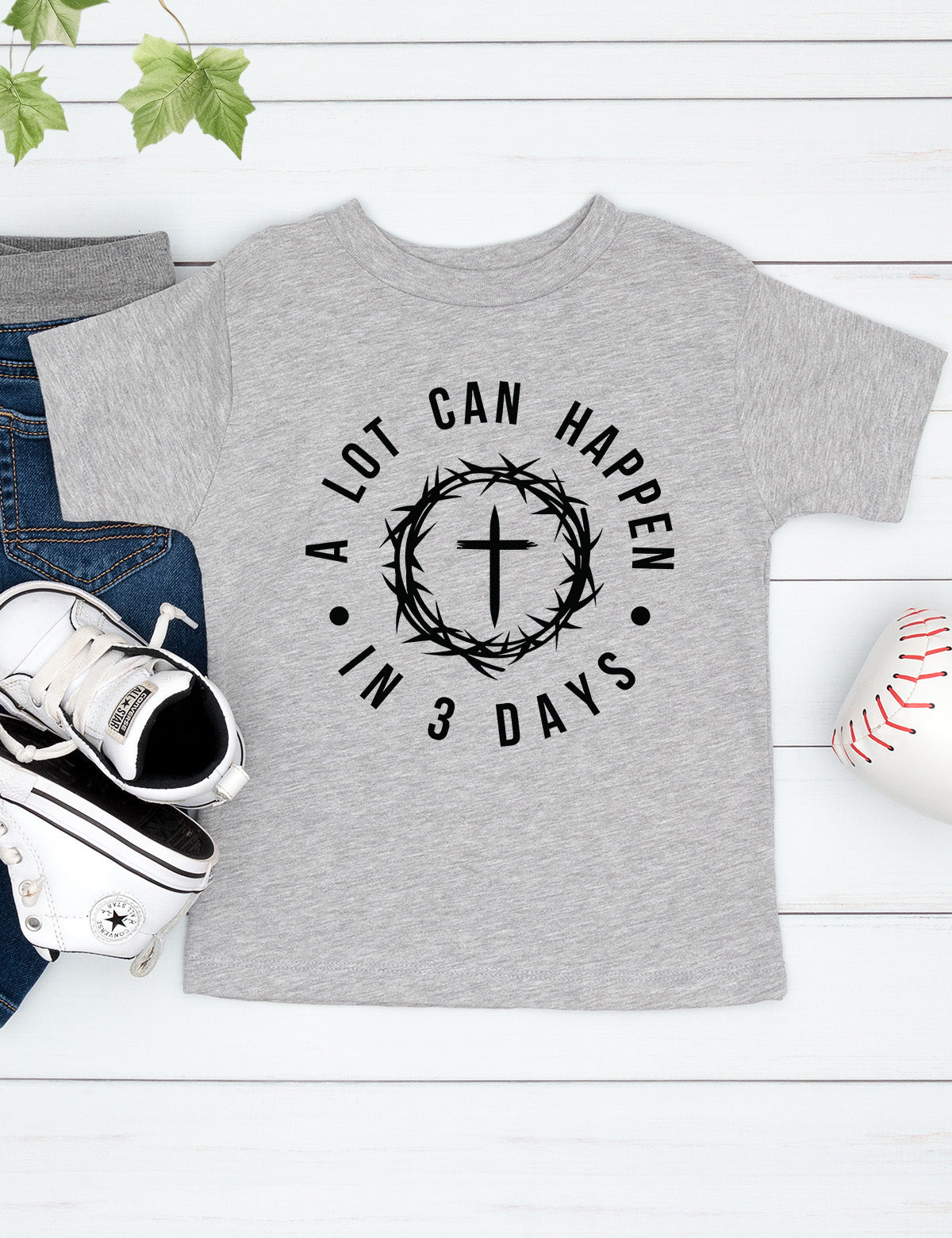 This Christian kids Easter shirt reminds children of the power of faith and hope, with its message "A Lot Can happen in 3 days." Perfect for Easter celebrations and everyday wear.