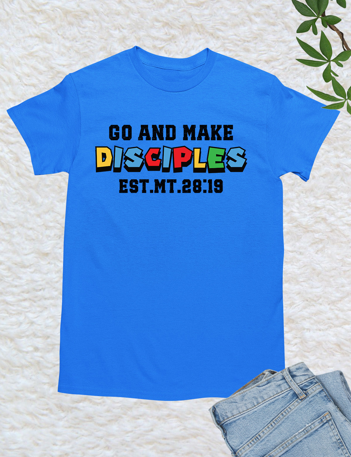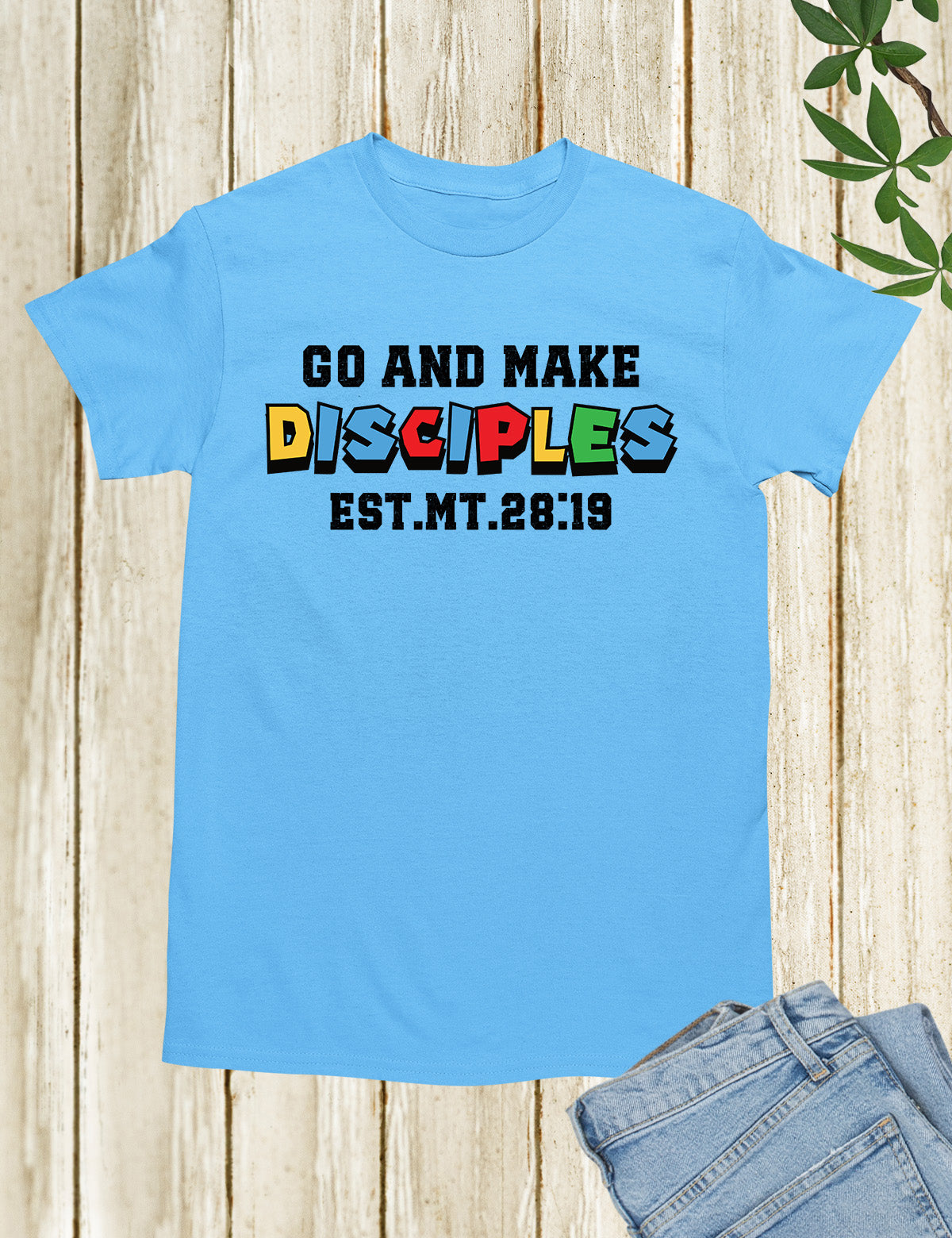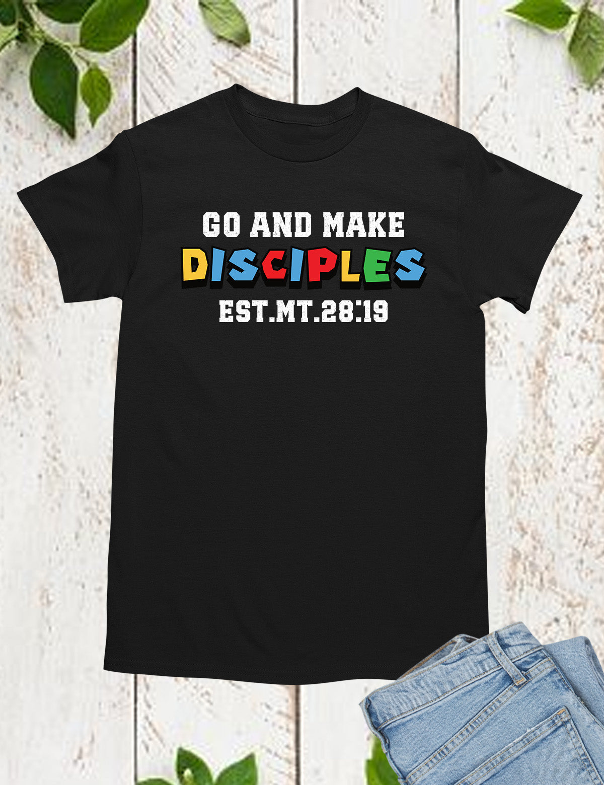 This Bible Verse T Shirt reminds you to "go and make disciples" with its inspiring message. Made with comfortable cotton material and available in multiple sizes, this shirt is perfect for spreading the Good News while looking stylish. Wear it as a reminder to fulfill the Great Commission and share your faith with others.