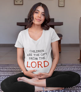 Children Are a Gift From The Lord Maternity T Shirt is stylish for mama to be and very comfortable to wear. This bible scripture maternity t shirt is designed to show off your blessings from the Lord. Wear this pregnancy t shirt to carry the promise of God in you and your little one life. The children are a gift from God.