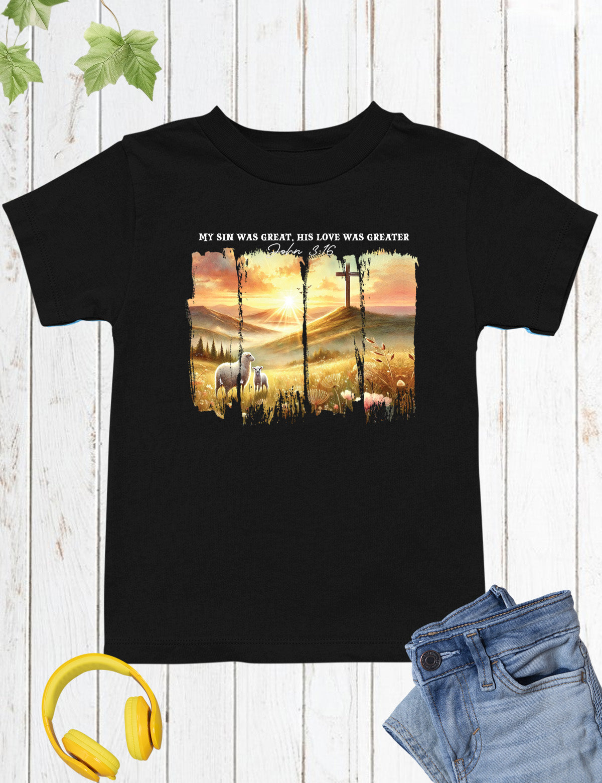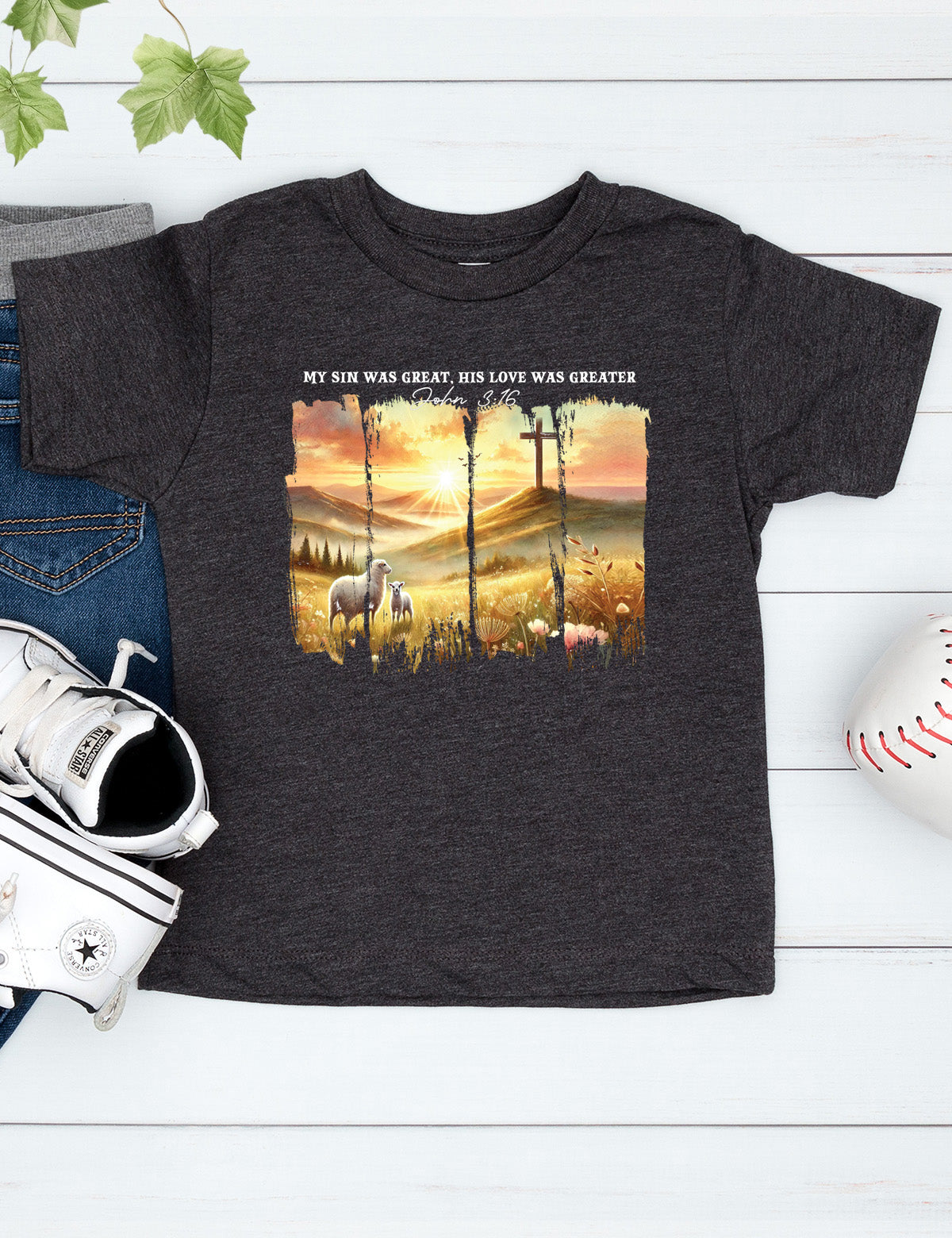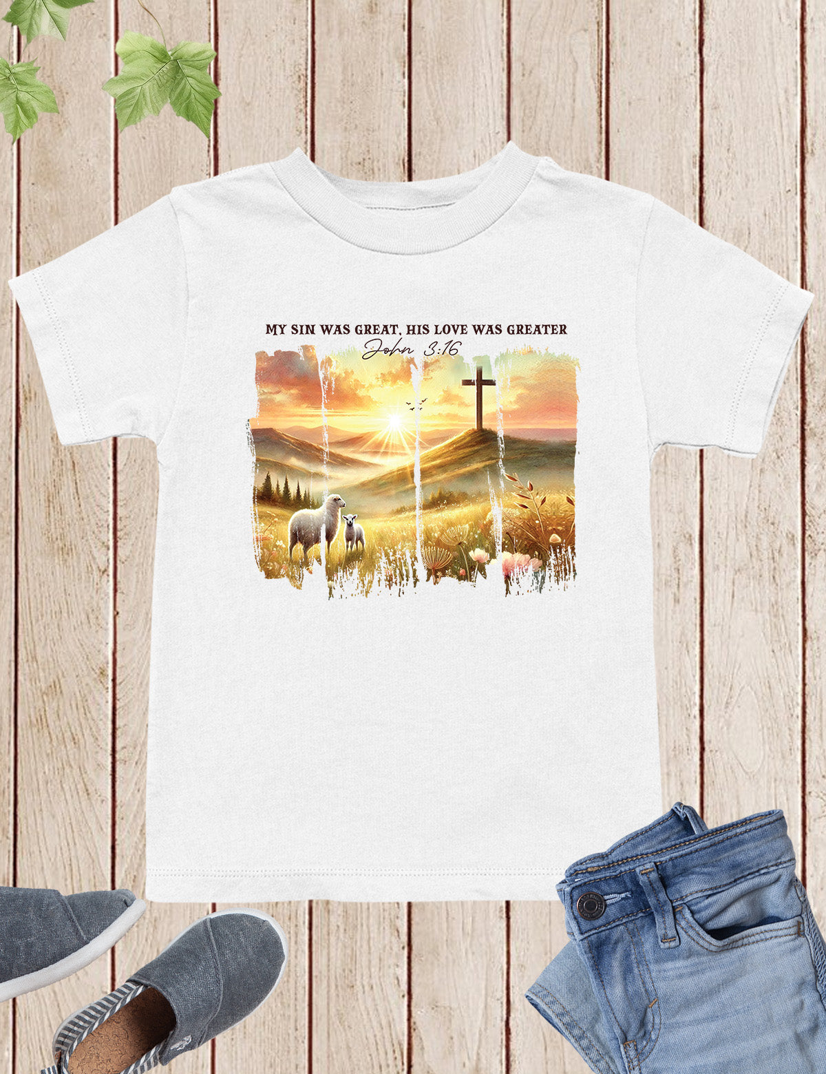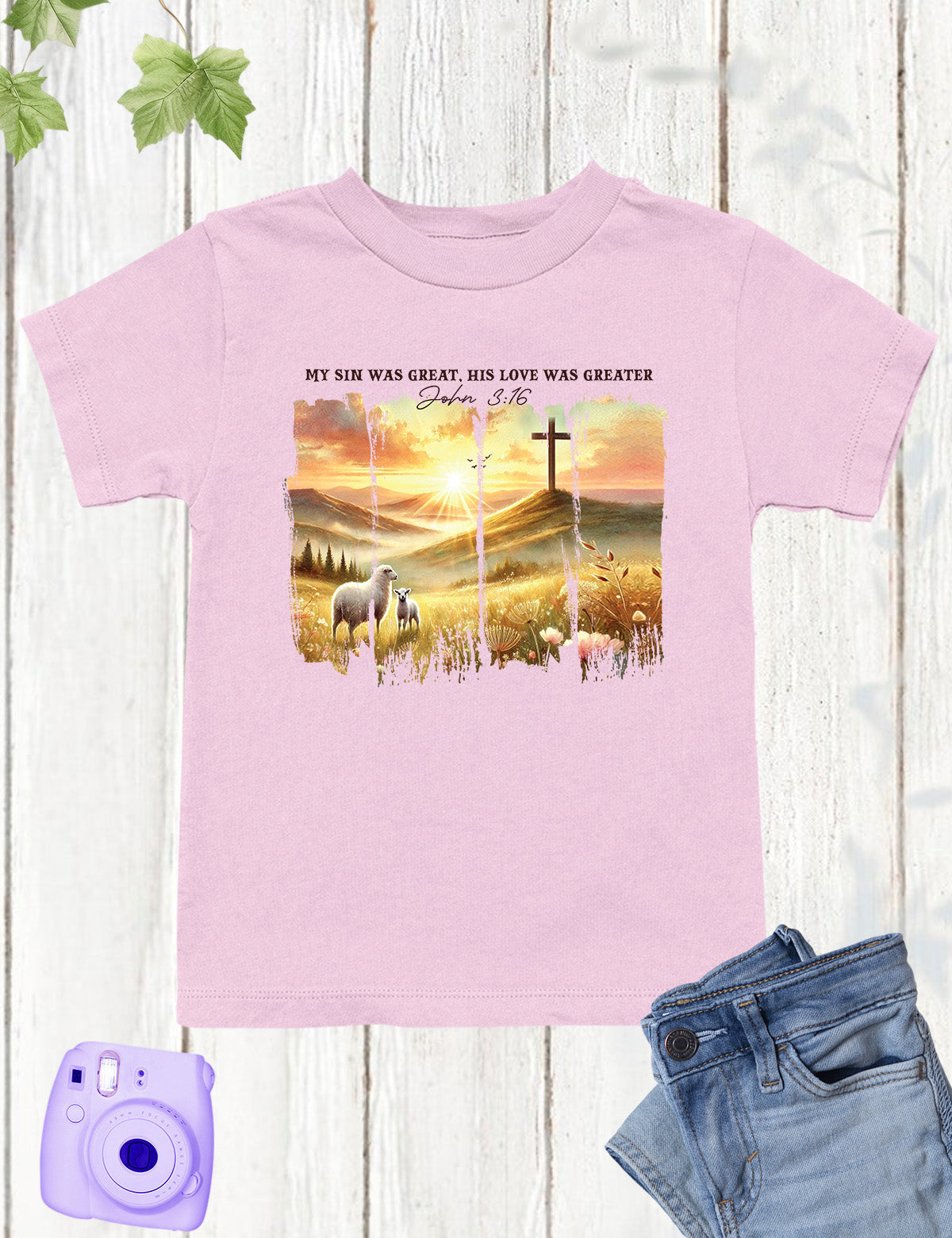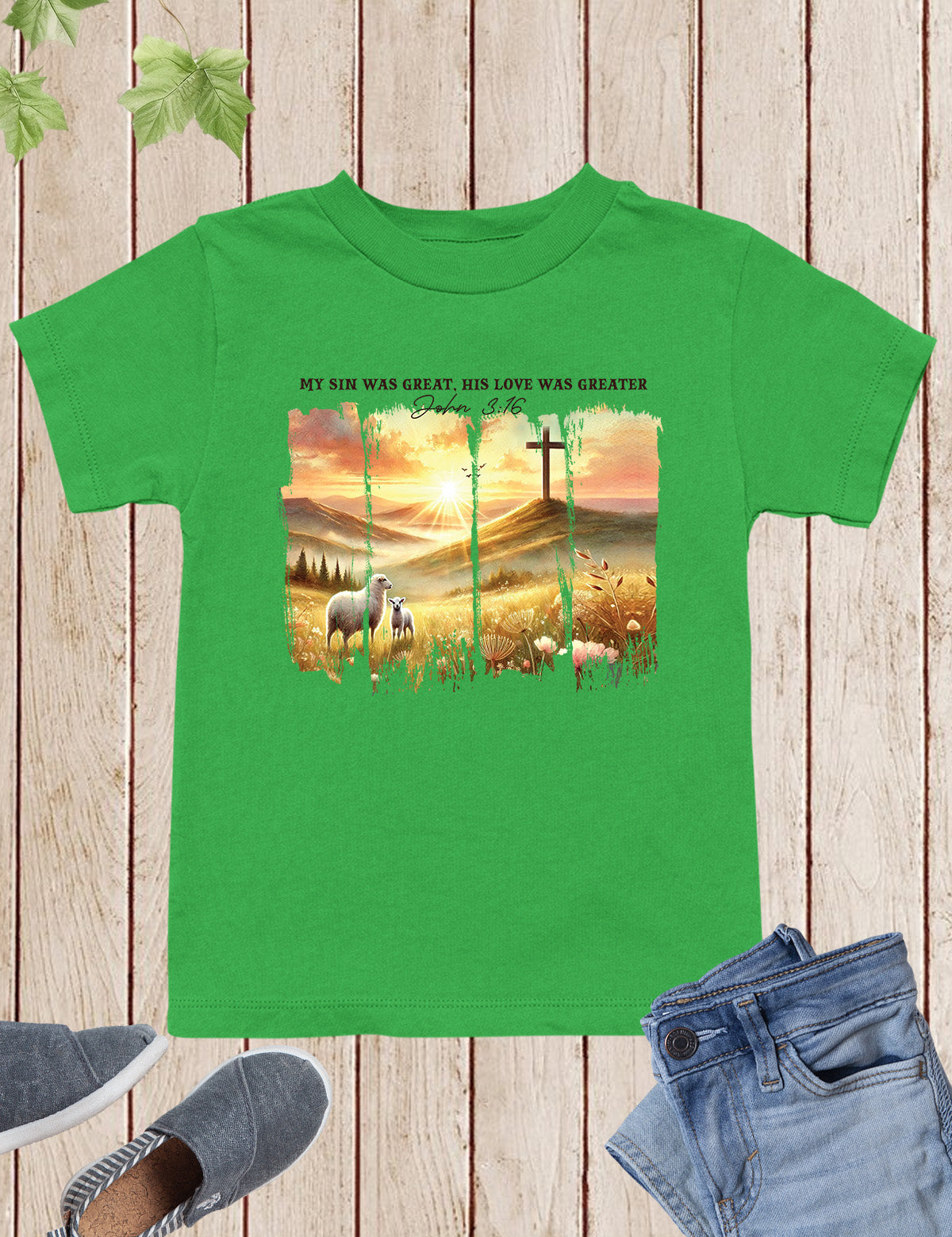 Celebrate Easter with these Christian Kids Easter Shirts! Made with the phrase "My Sin Was Great, His Love Was Greater," these shirts remind us of the true meaning of the holiday. Spread the message of love and forgiveness with our comfortable and stylish shirts.