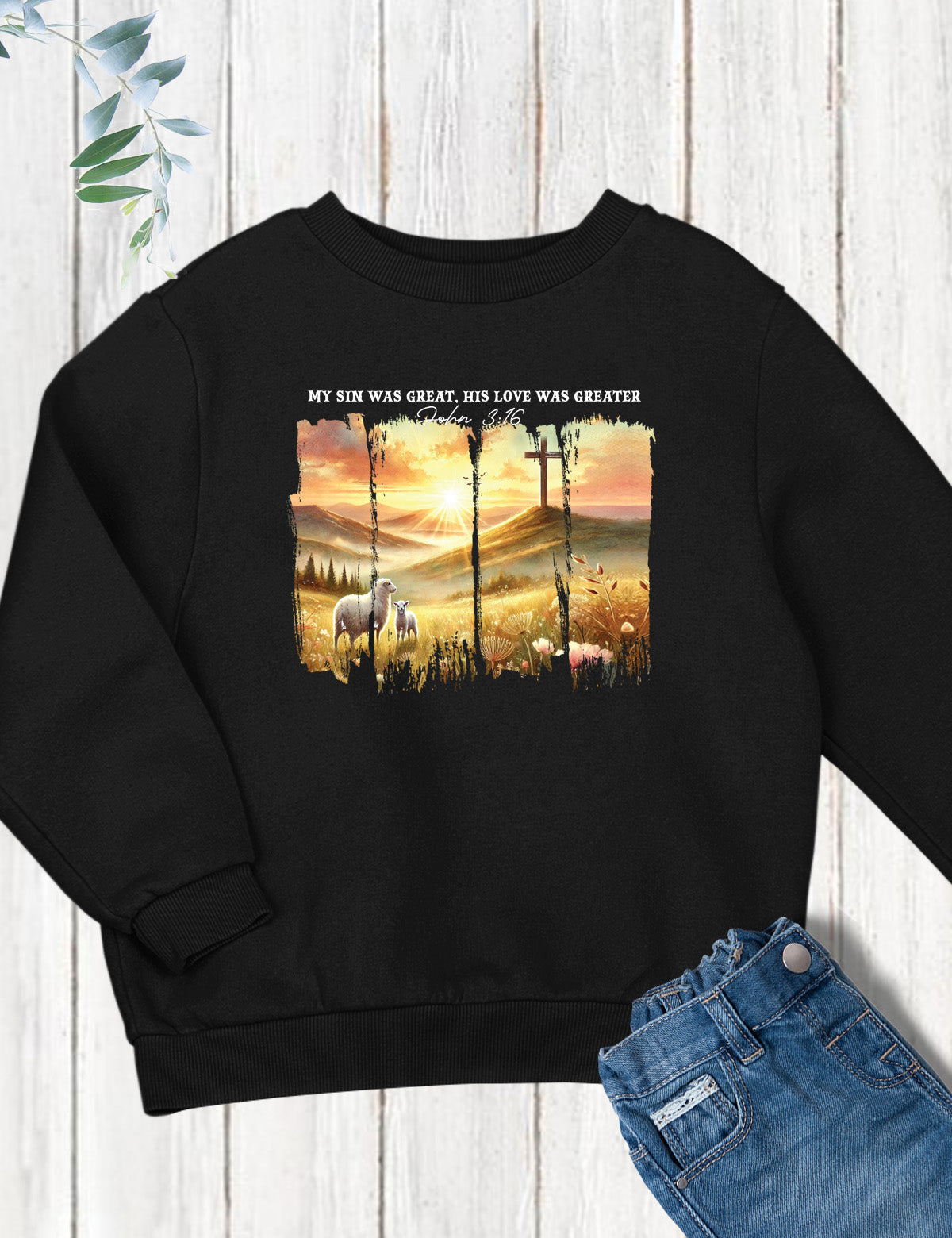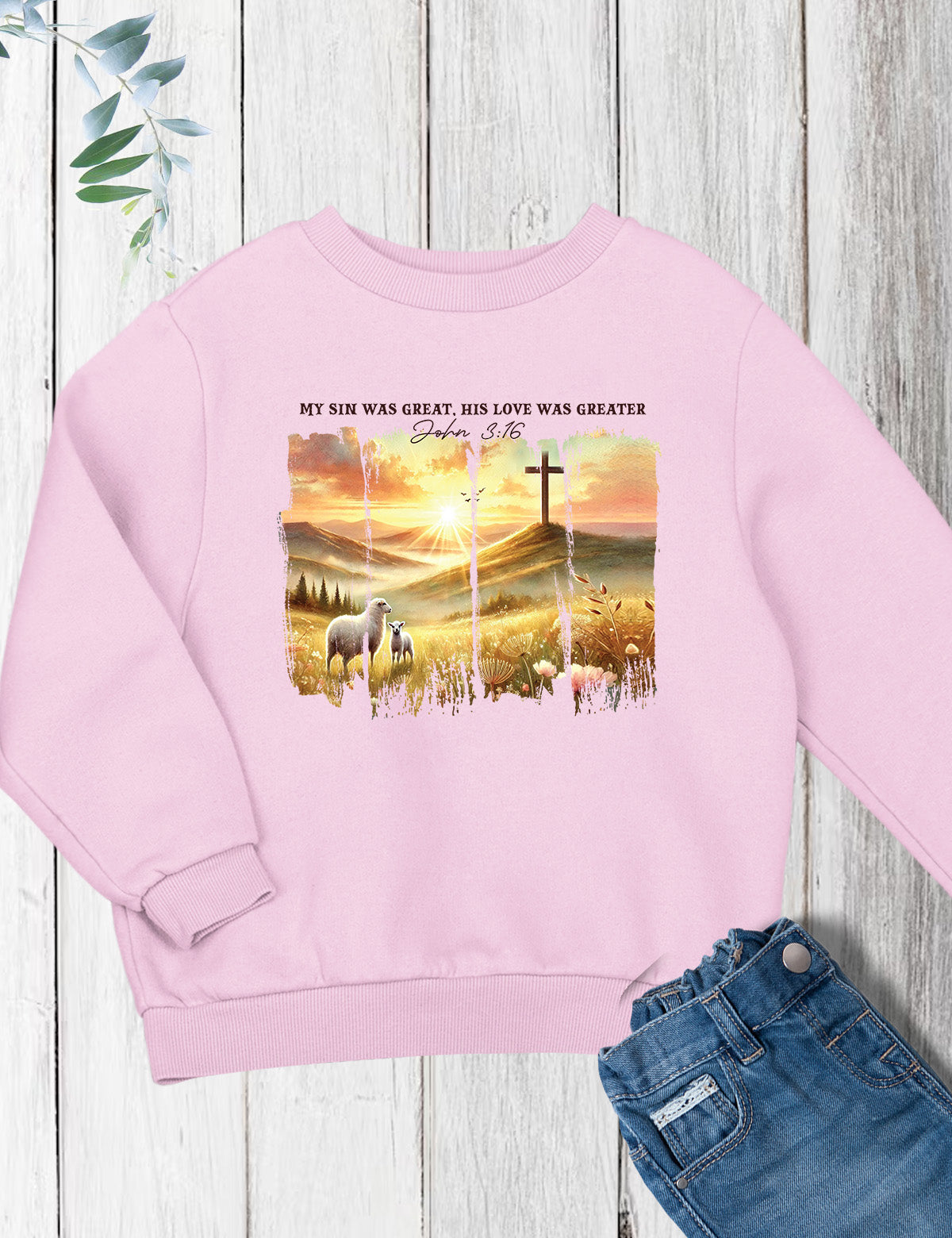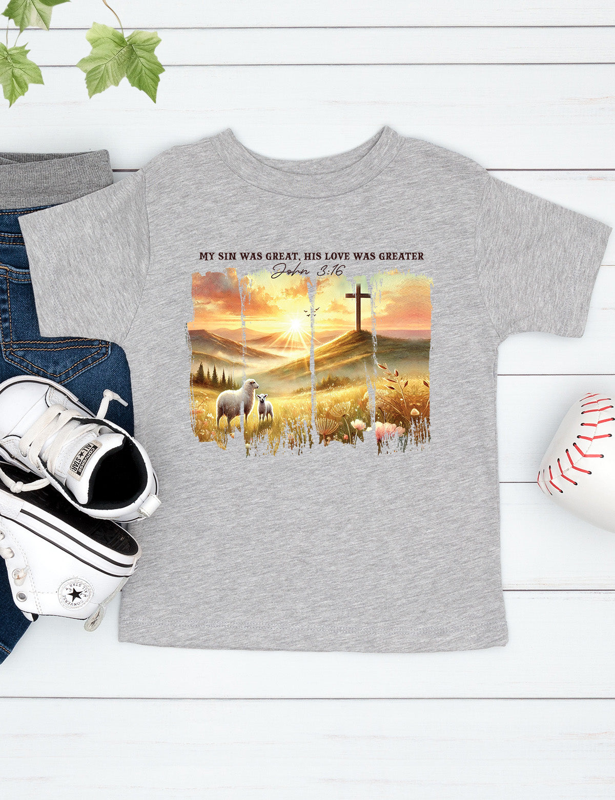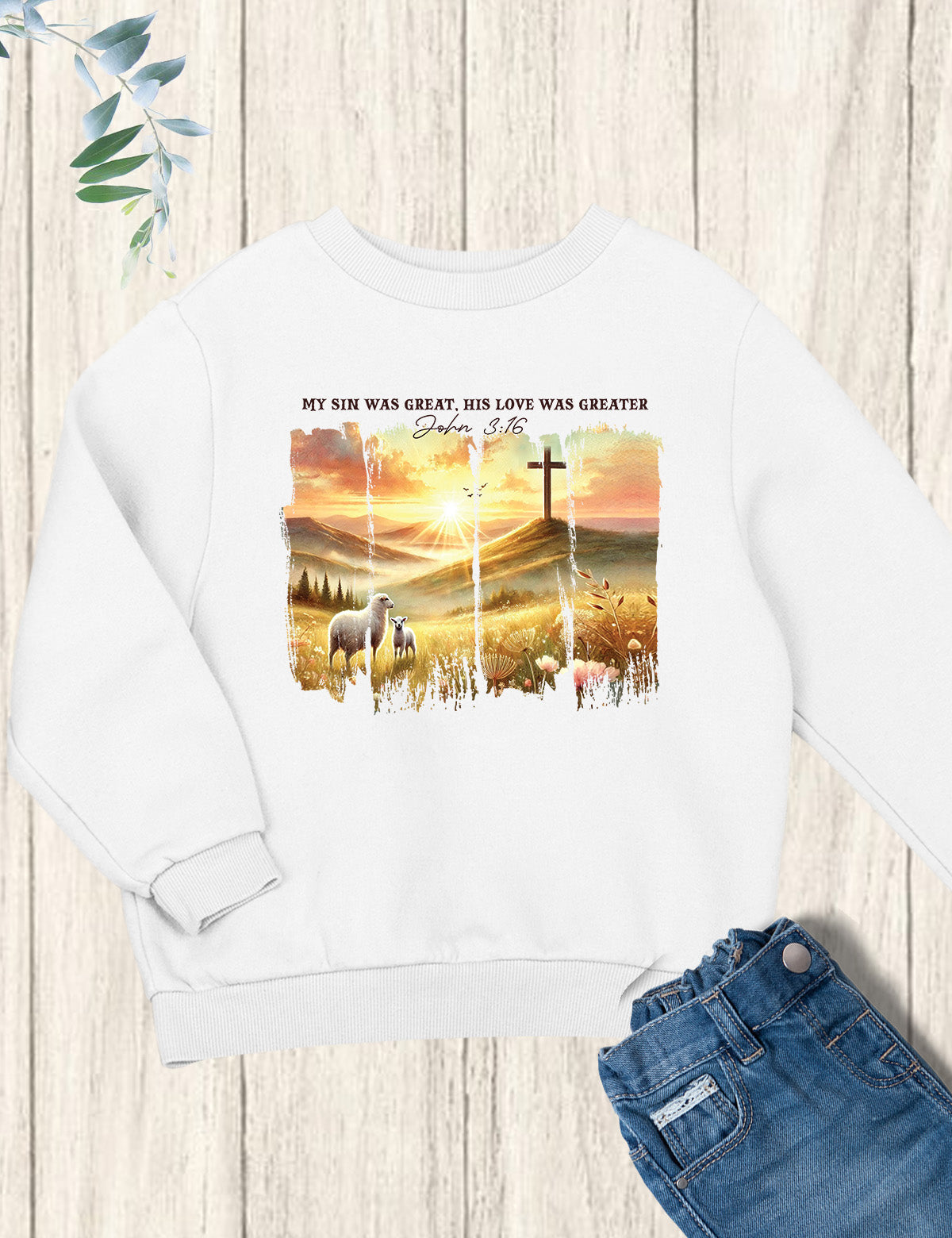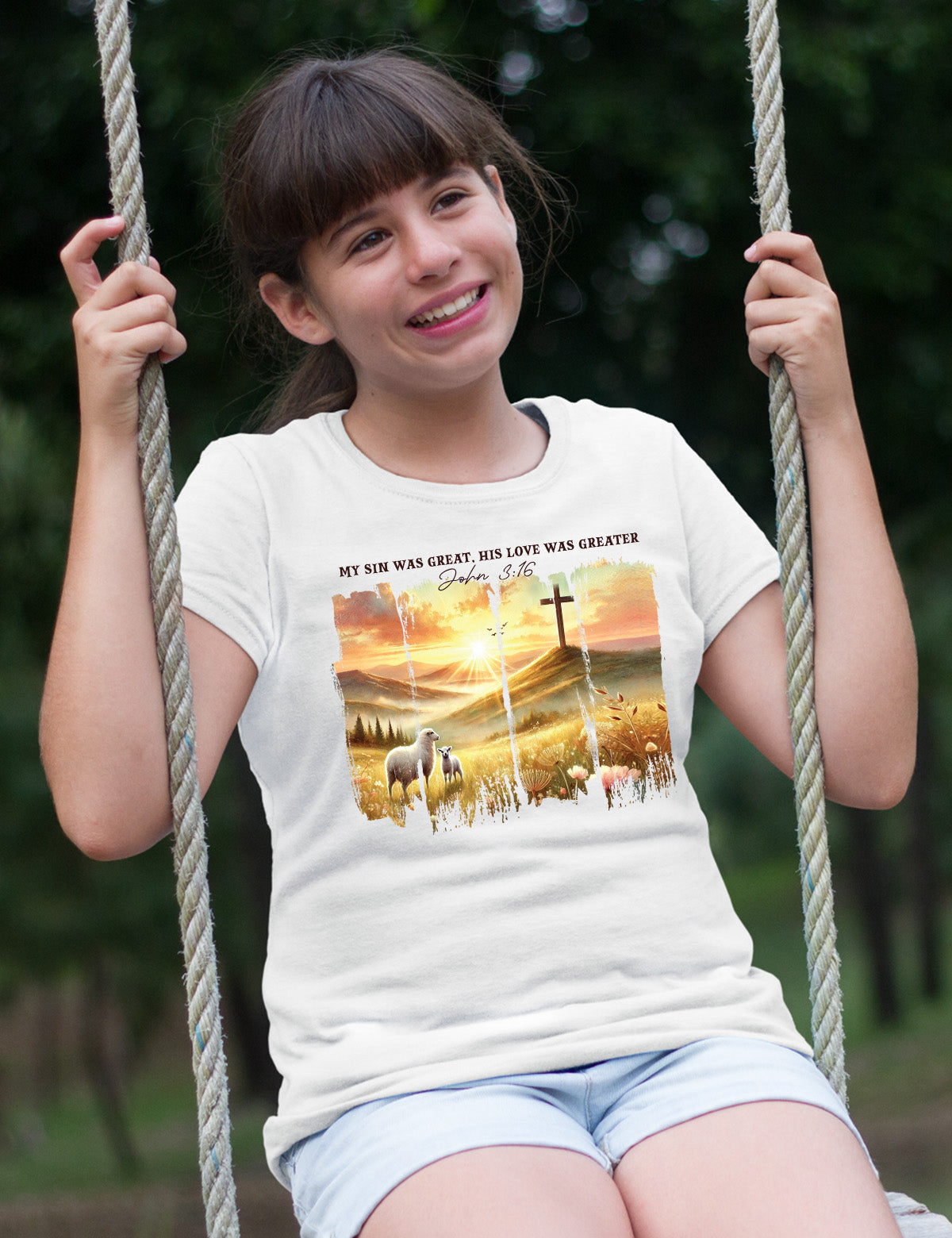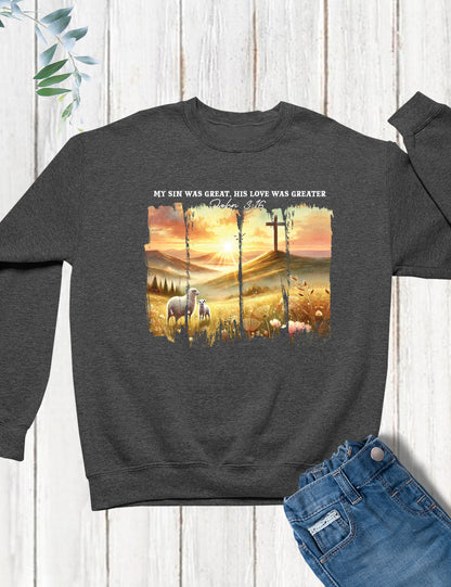 Celebrate Easter with these Christian Kids Easter Shirts! Made with the phrase "My Sin Was Great, His Love Was Greater," these shirts remind us of the true meaning of the holiday. Spread the message of love and forgiveness with our comfortable and stylish shirts.
