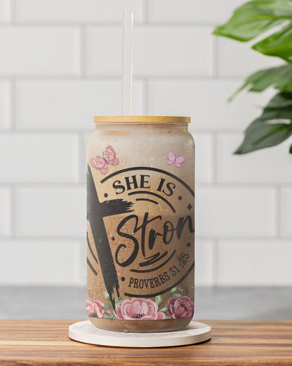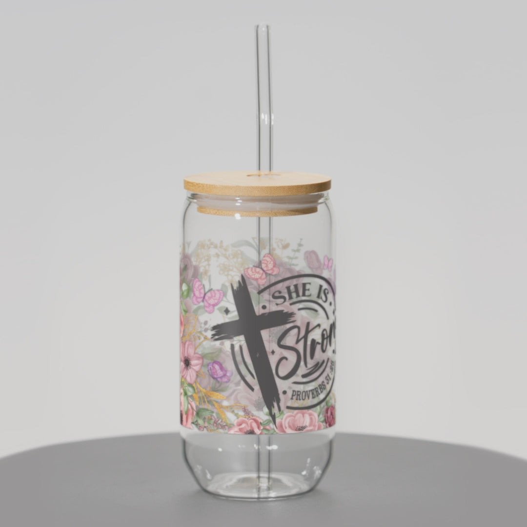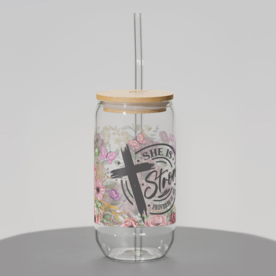 Stay strong and stylish with our Christian Women Libbey Glass Tumbler. Featuring a durable glass construction and a secure lid with a straw, this tumbler is perfect for on-the-go hydration. Emblazoned with the empowering phrase 'She is Strong', it's a reminder of your inner strength. Made for 100% confident women.