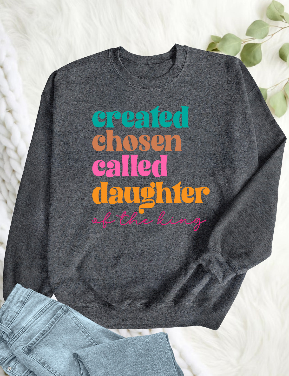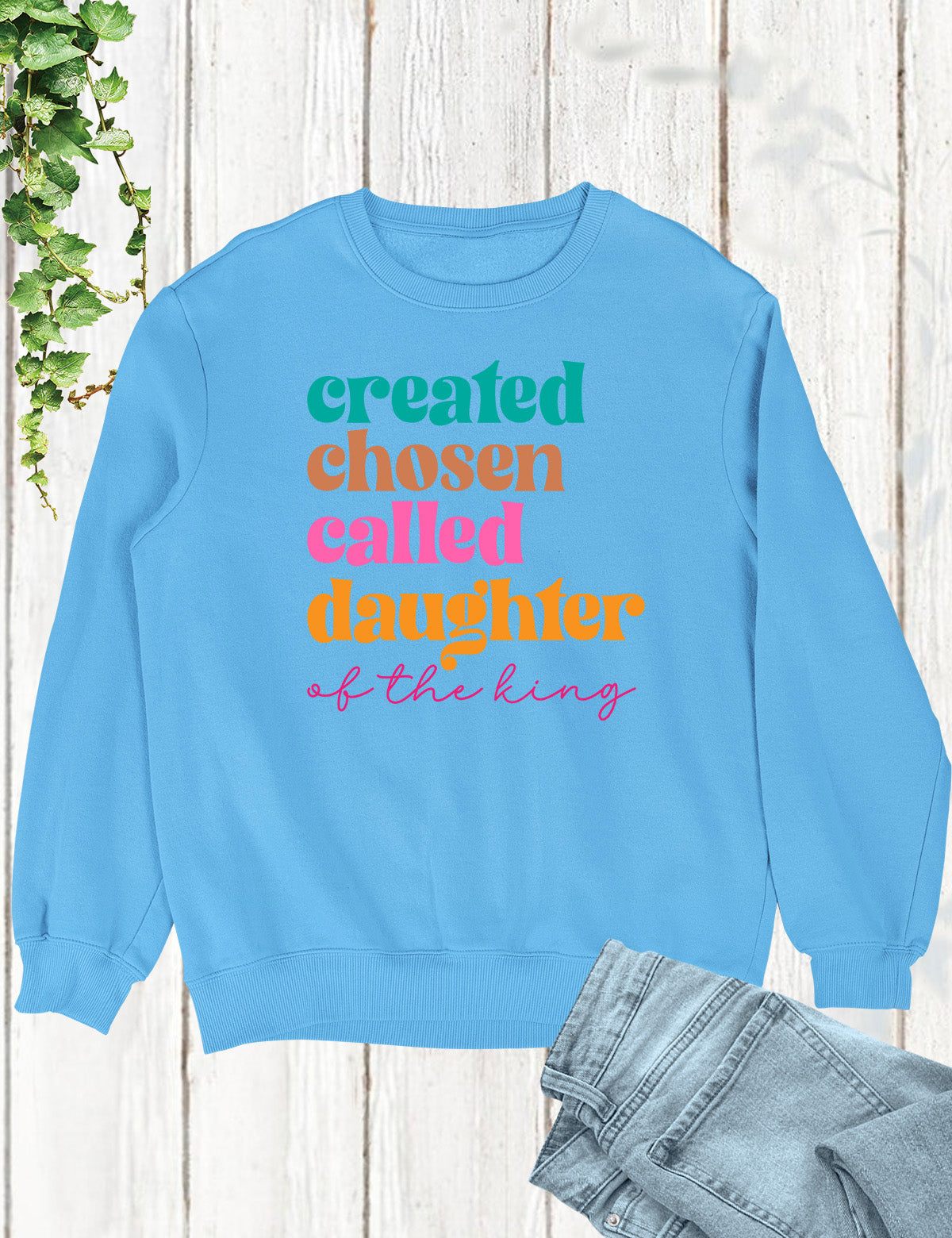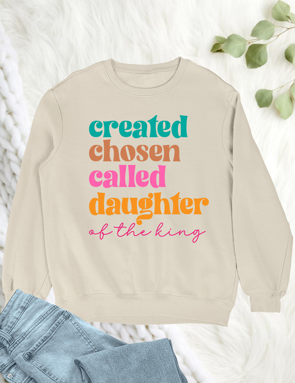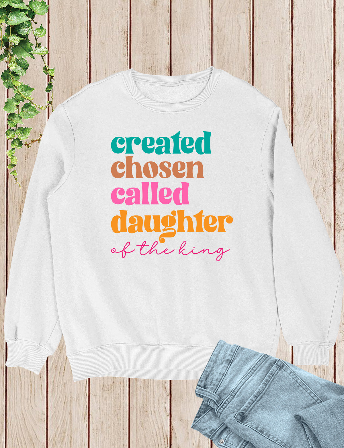 Elevate your wardrobe with our Created Chosen Called Daughter of the King Sweatshirt. Made with high-quality materials, this sweatshirt features a powerful message and a comfortable fit. Show your faith and confidence in your identity as a daughter of the King in style.