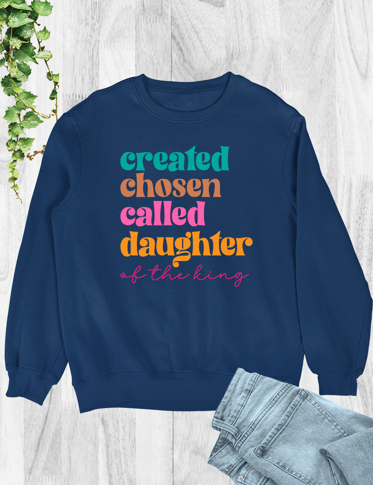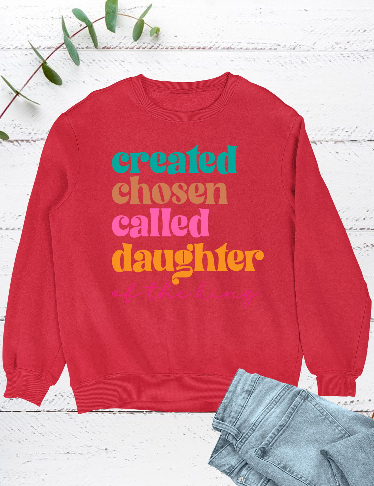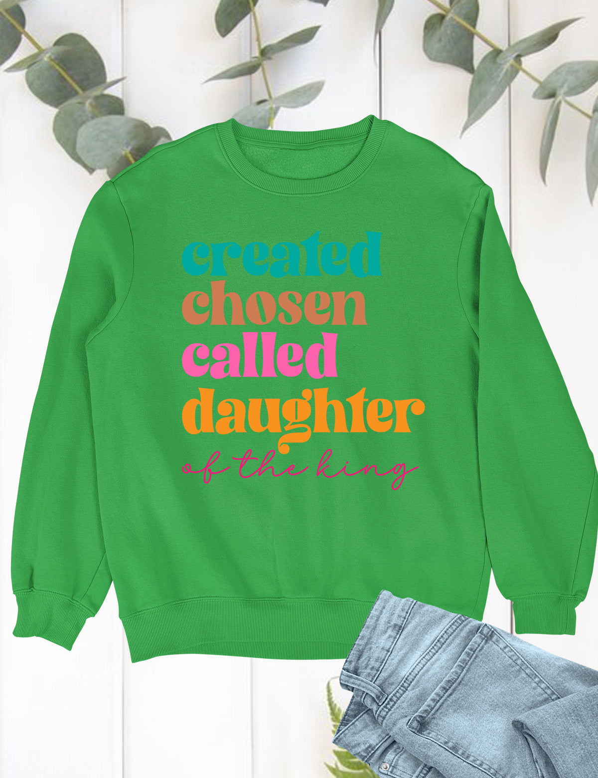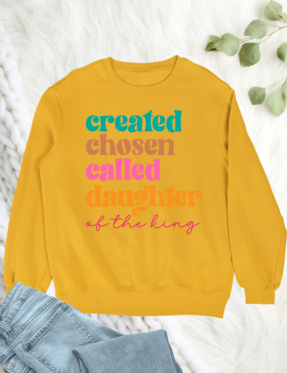 Elevate your wardrobe with our Created Chosen Called Daughter of the King Sweatshirt. Made with high-quality materials, this sweatshirt features a powerful message and a comfortable fit. Show your faith and confidence in your identity as a daughter of the King in style.