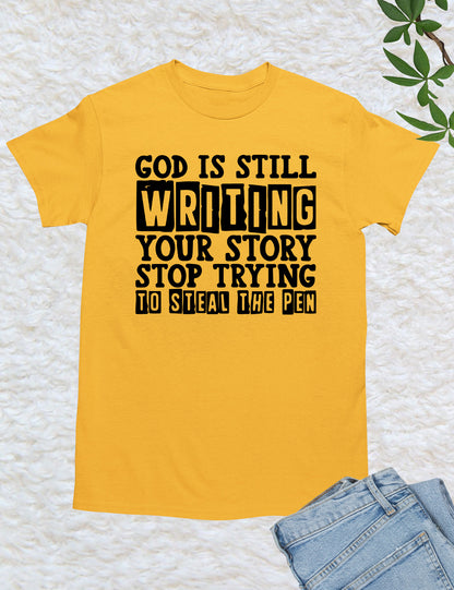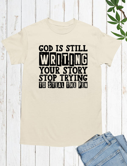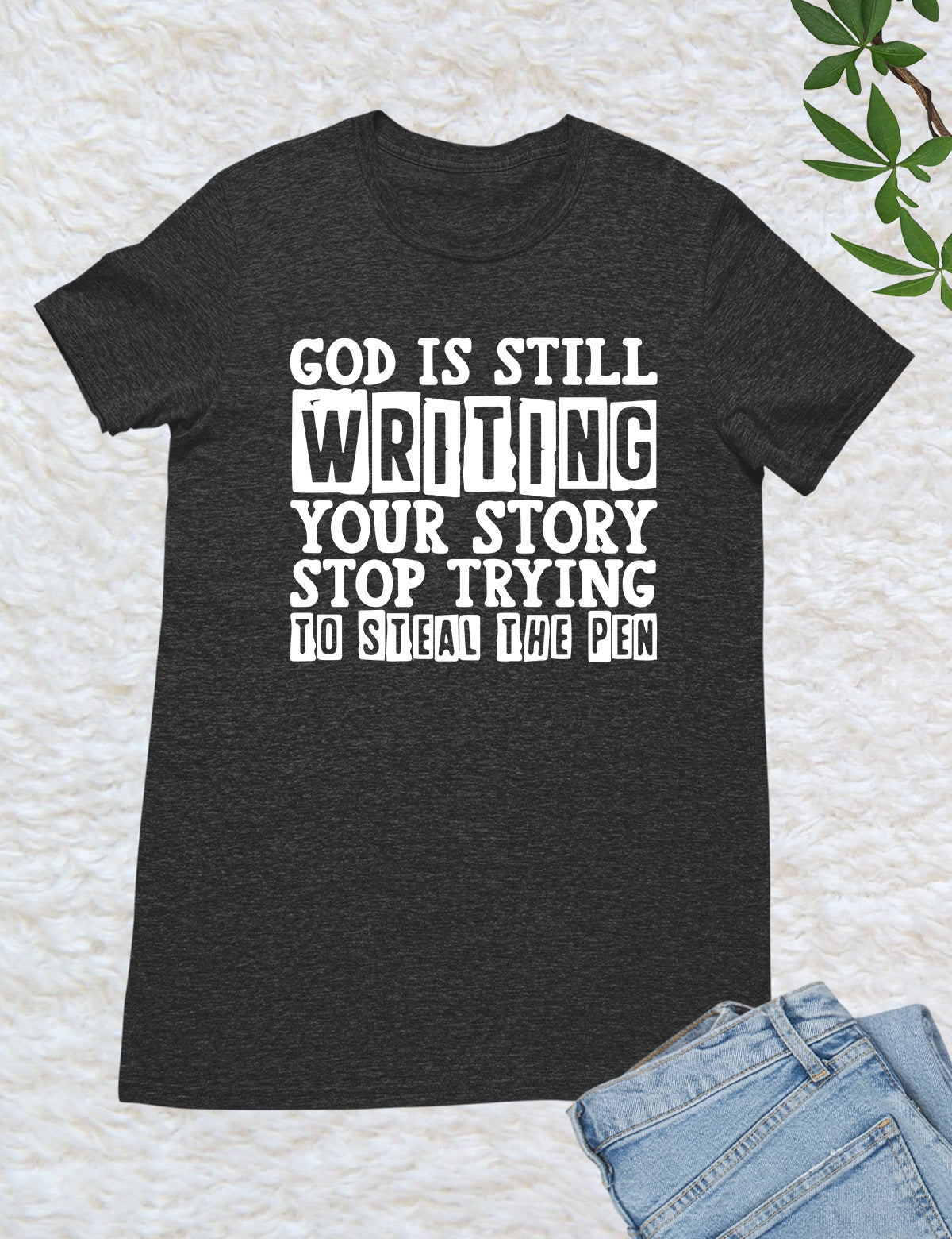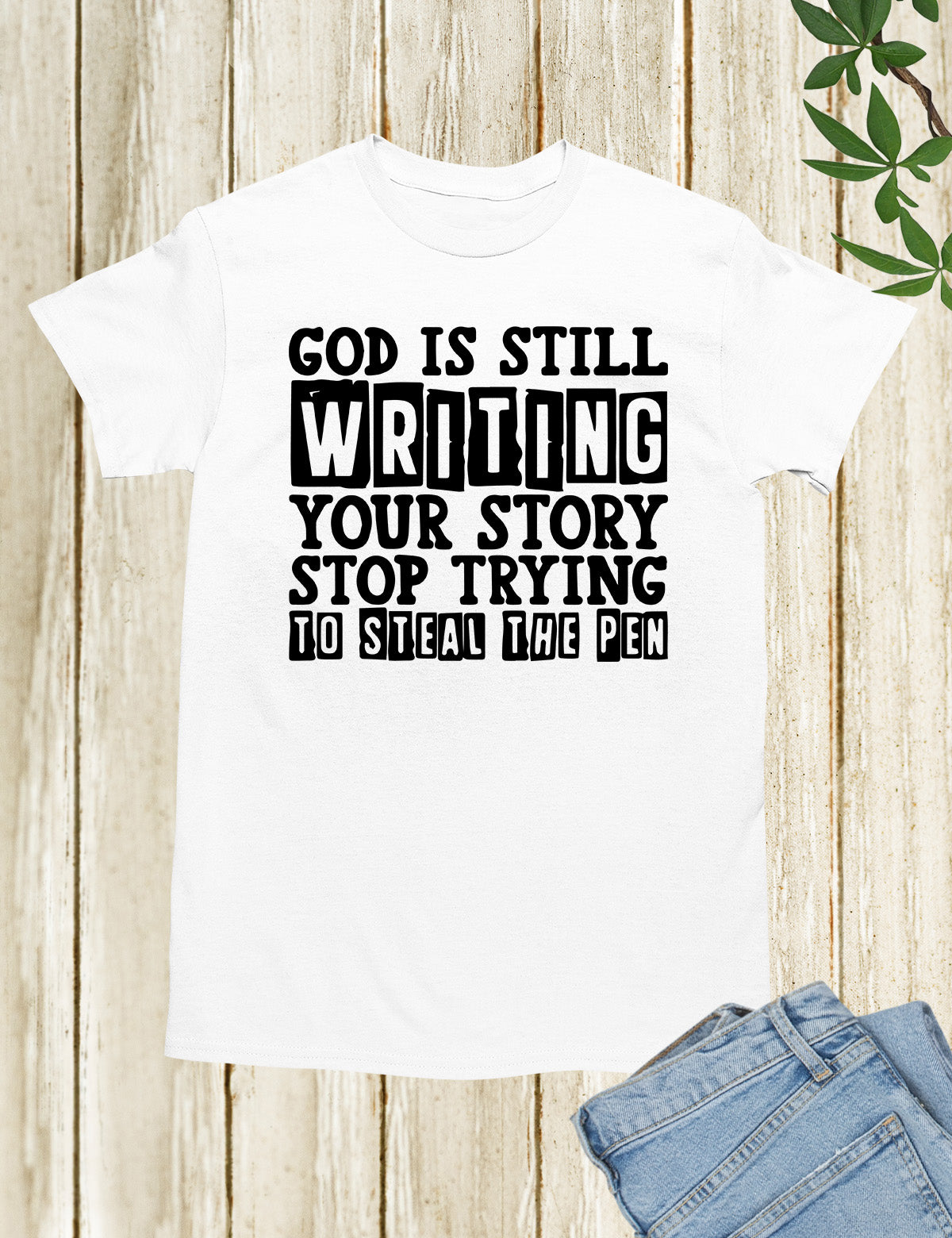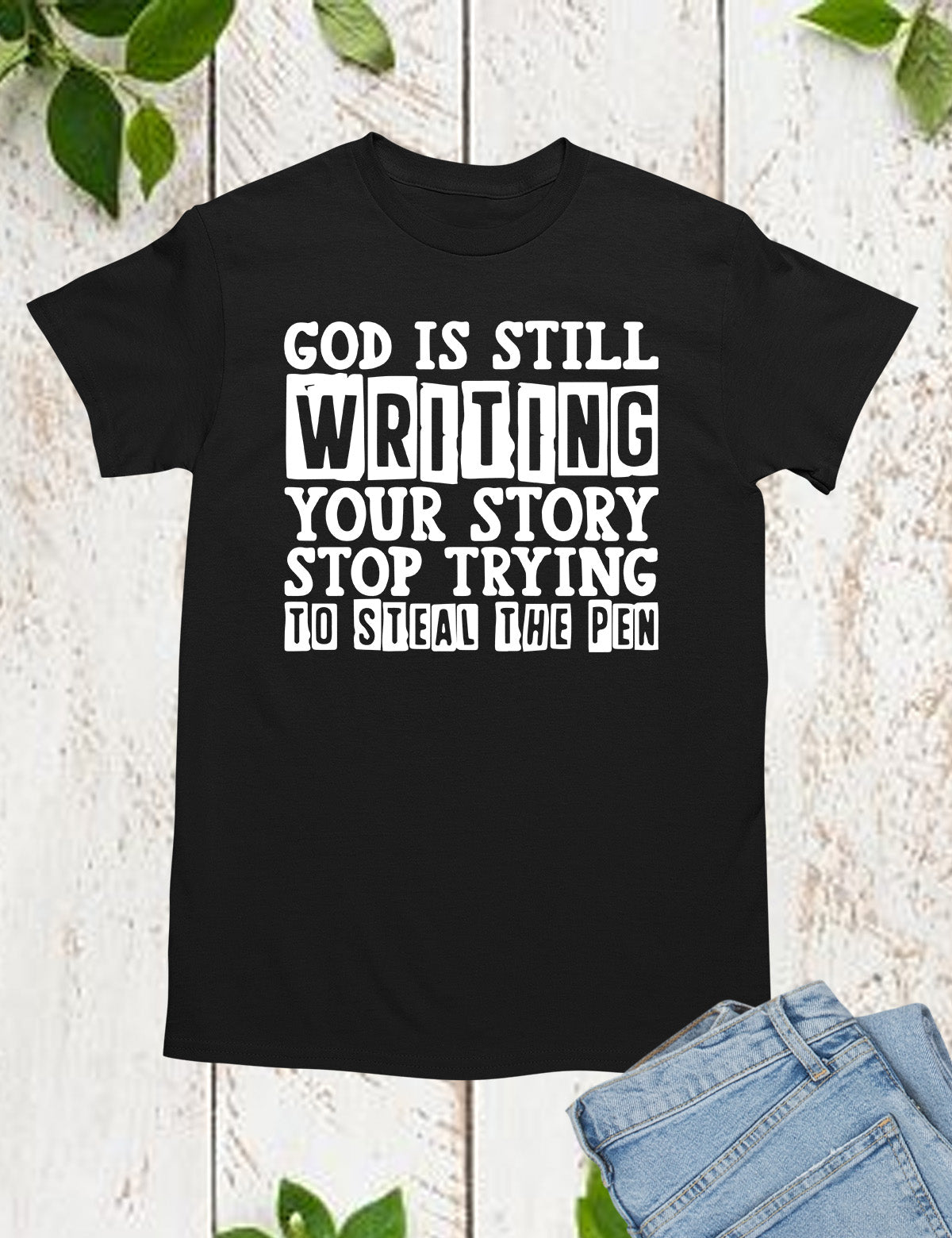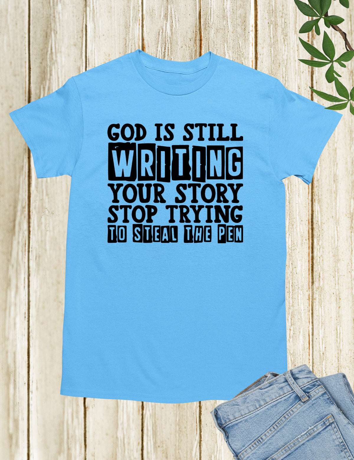 Let this shirt serve as a reminder that although life may have its twists and turns, you can trust in God's unwavering plan for your story. Share your faith and encourage others with this powerful message. Made with quality fabric, this shirt is an enduring expression of your faith.