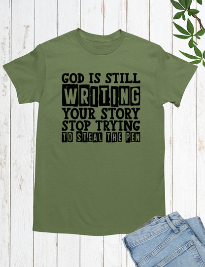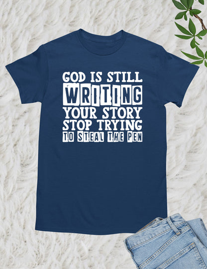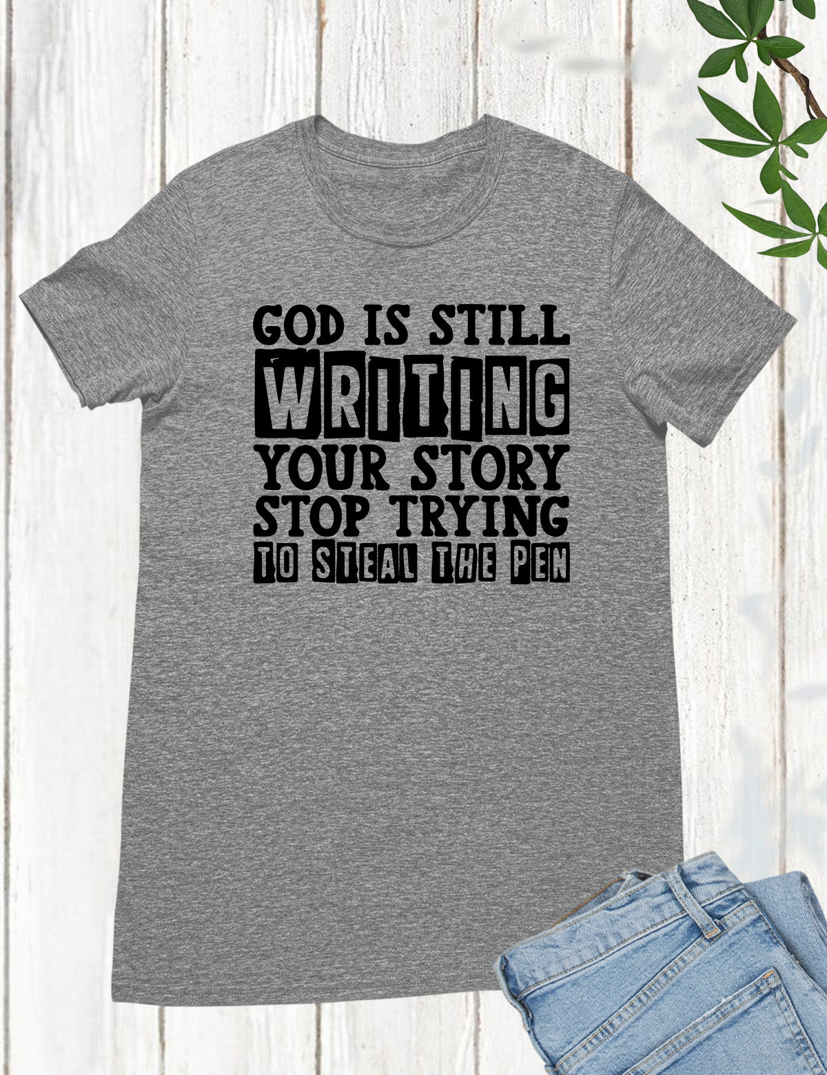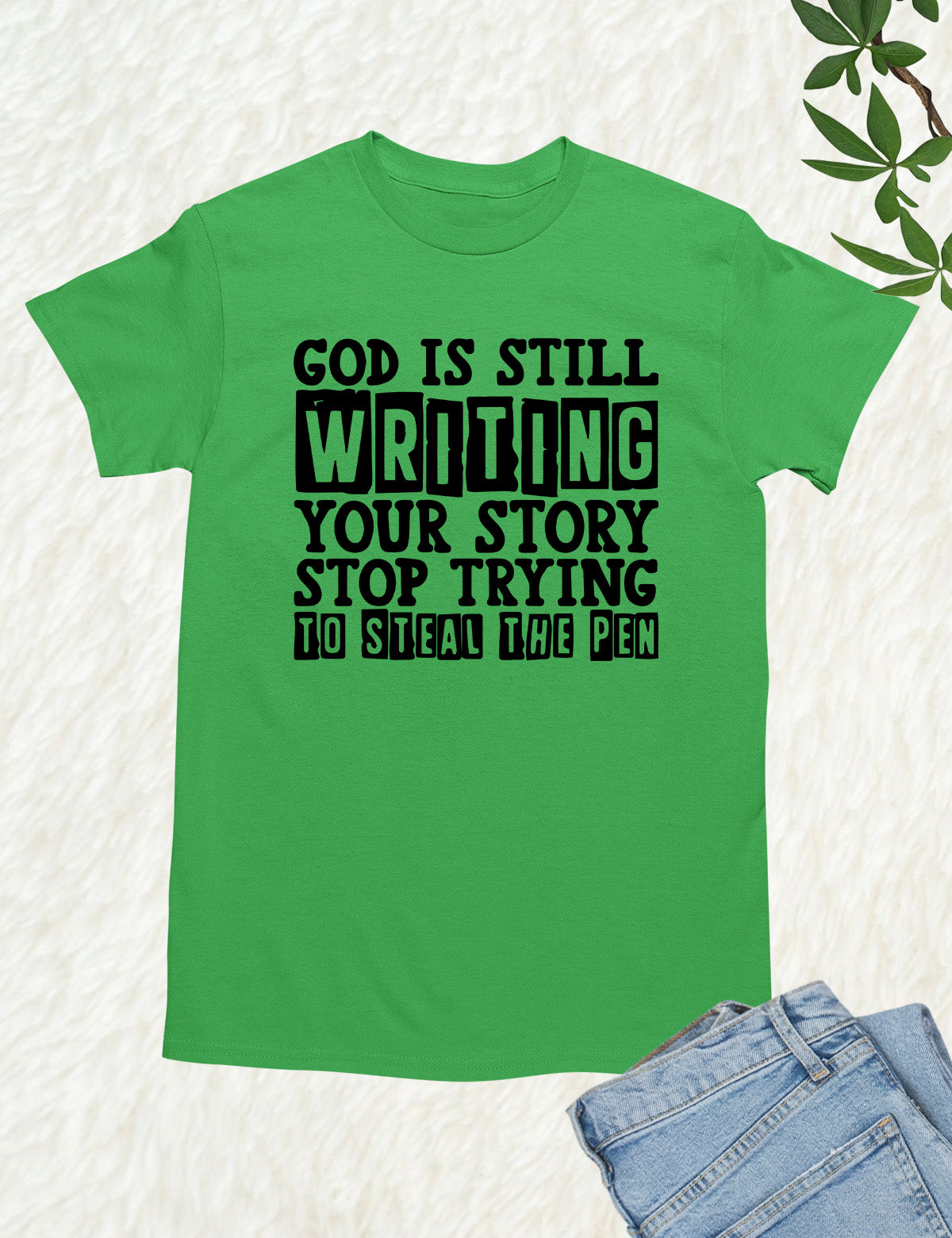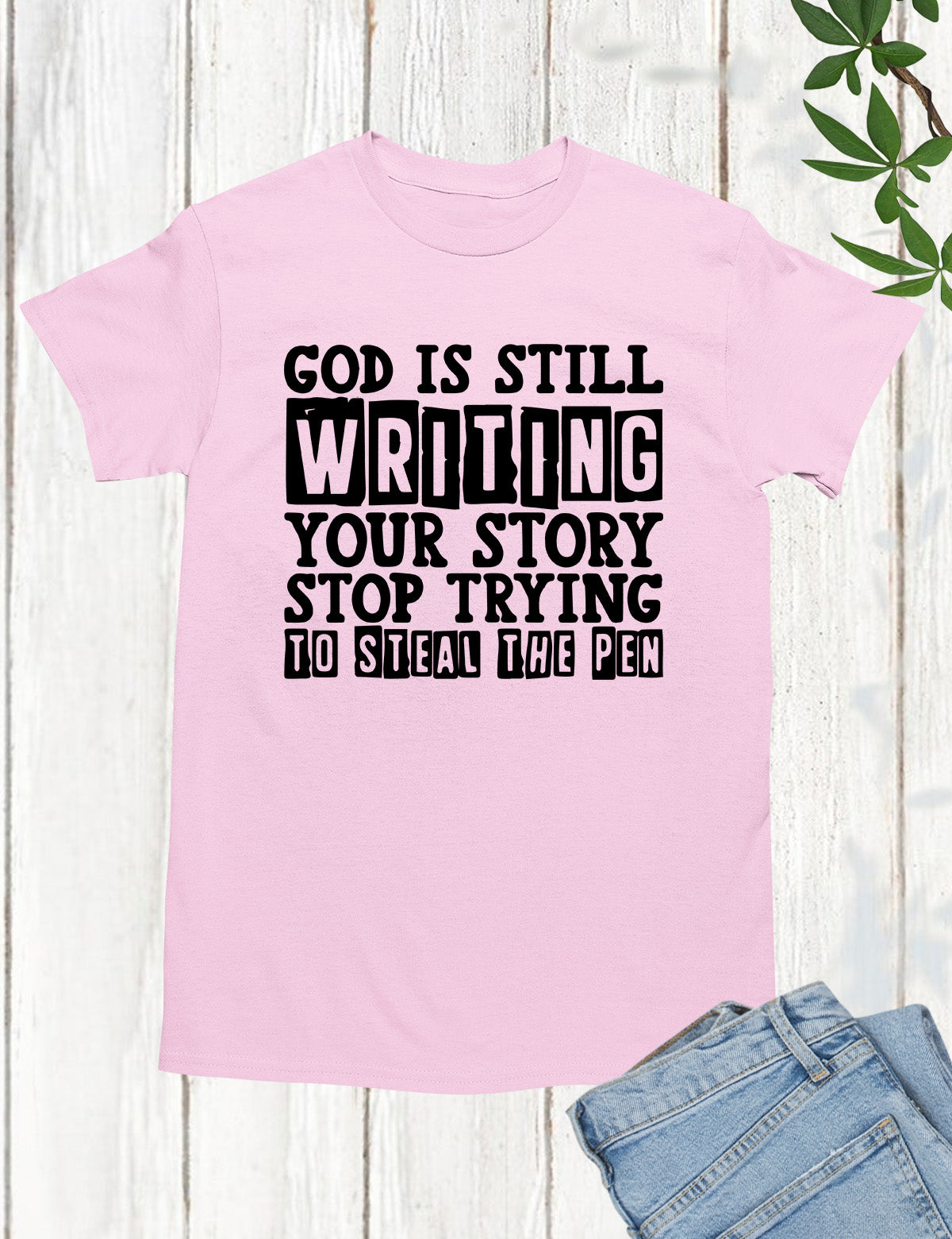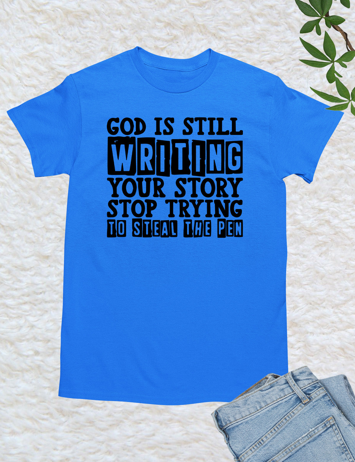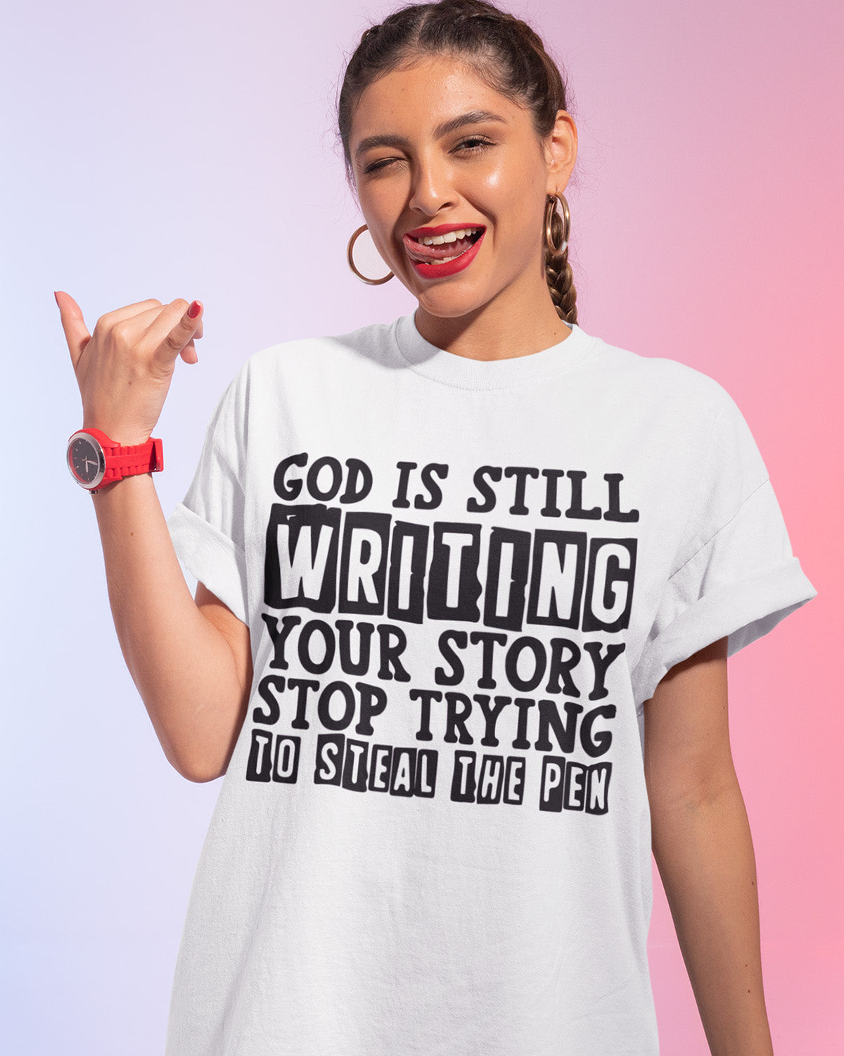 Let this shirt serve as a reminder that although life may have its twists and turns, you can trust in God's unwavering plan for your story. Share your faith and encourage others with this powerful message. Made with quality fabric, this shirt is an enduring expression of your faith.