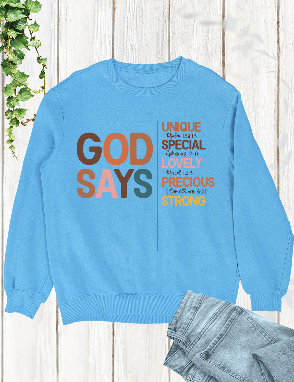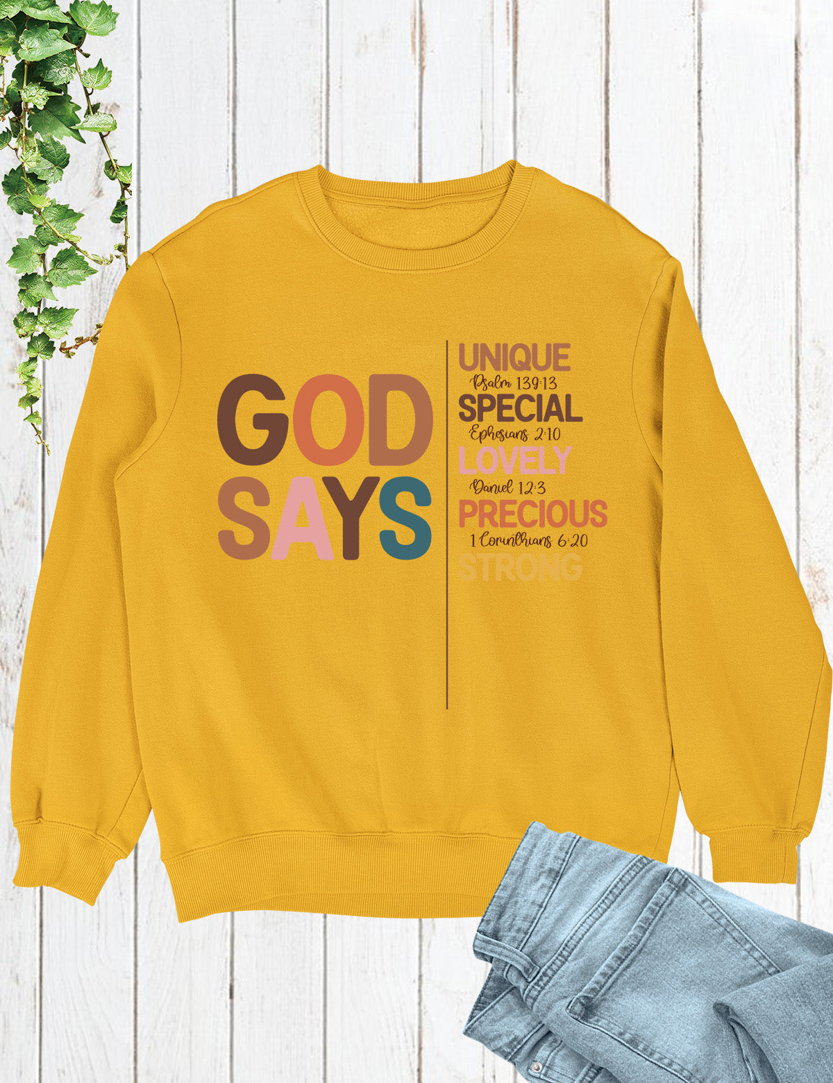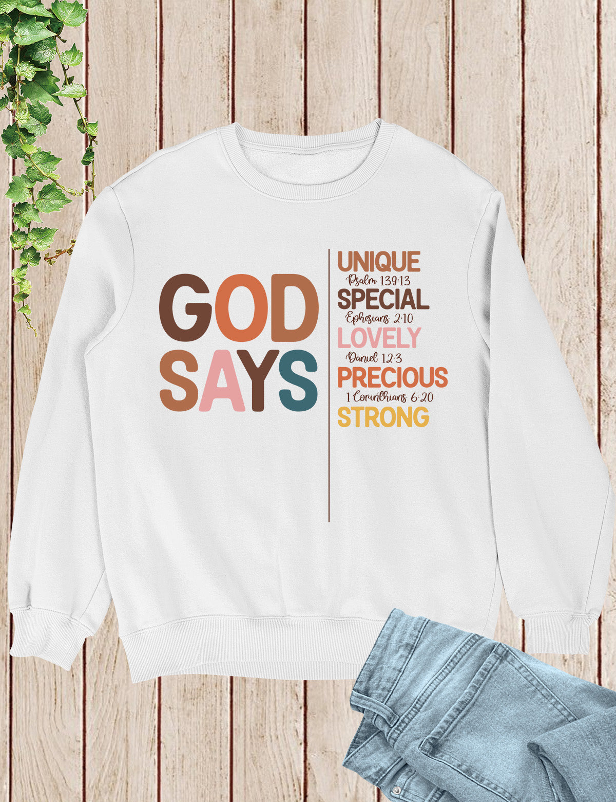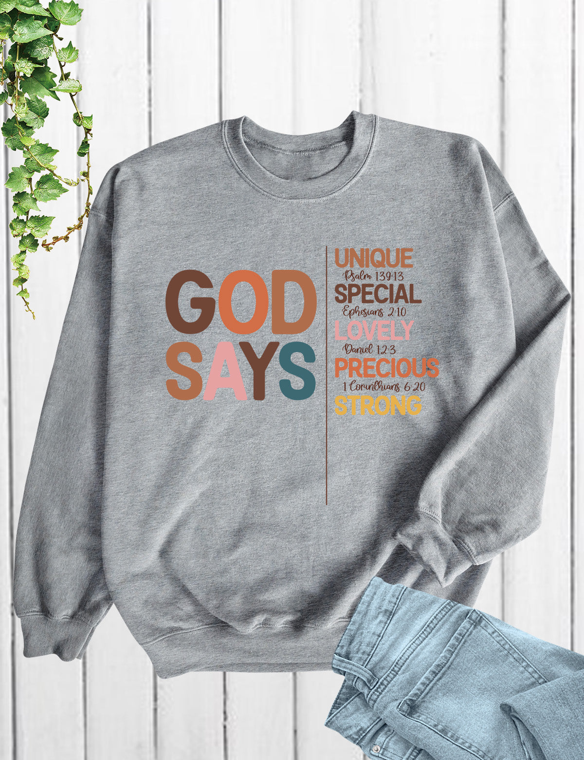 Celebrate Thanksgiving with this divine sweatshirt featuring the message "God says thank you." Made with quality materials for a comfortable fit, spread love and gratitude this holiday season. Perfect for family gatherings or casual wear, let this sweatshirt remind you of the true meaning of Thanksgiving.