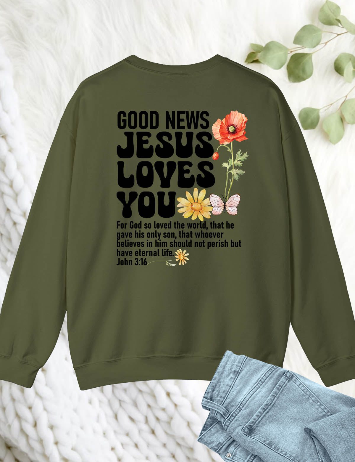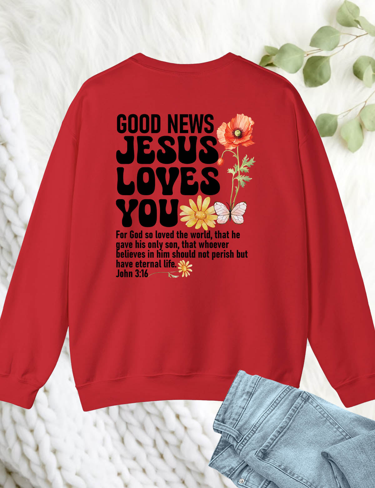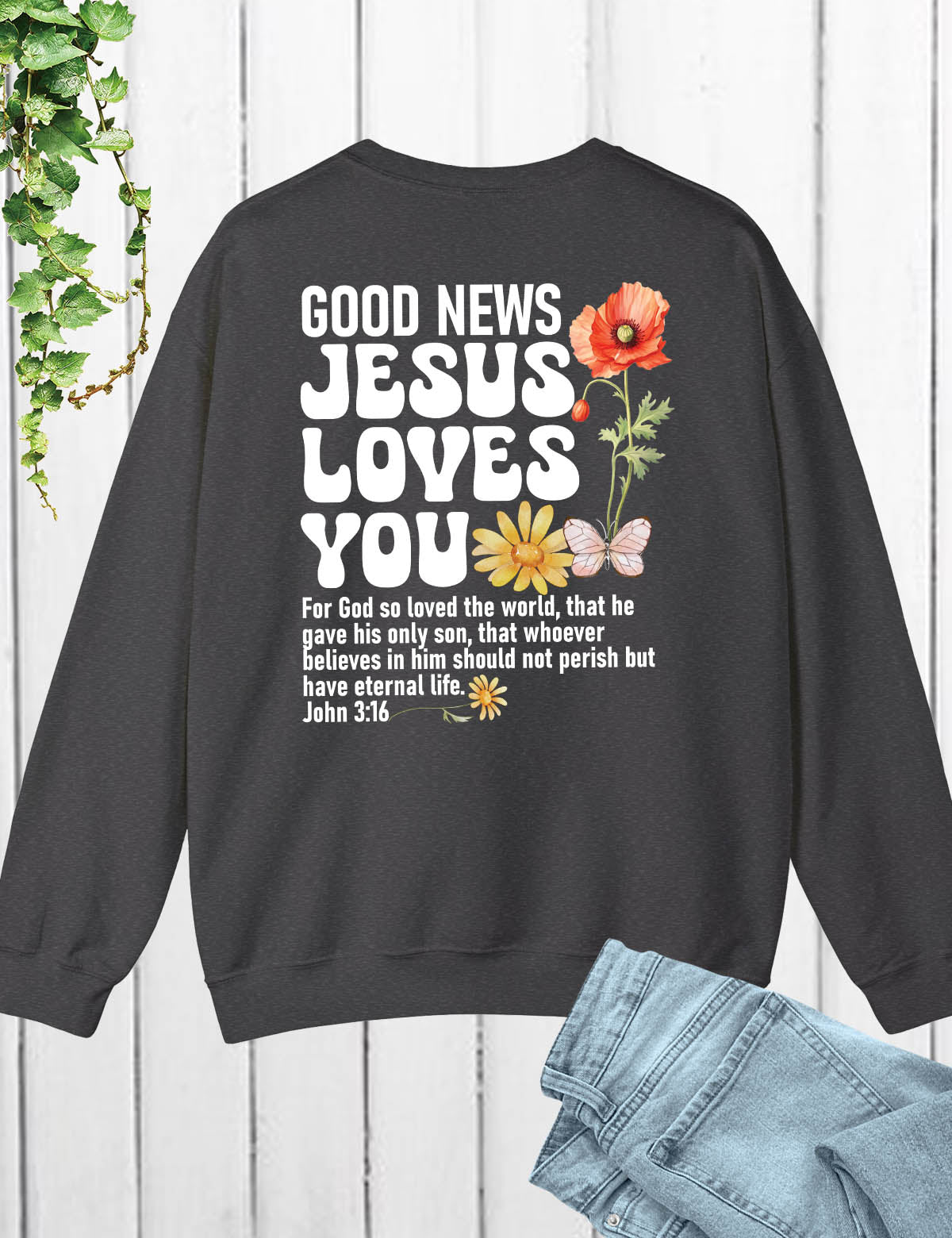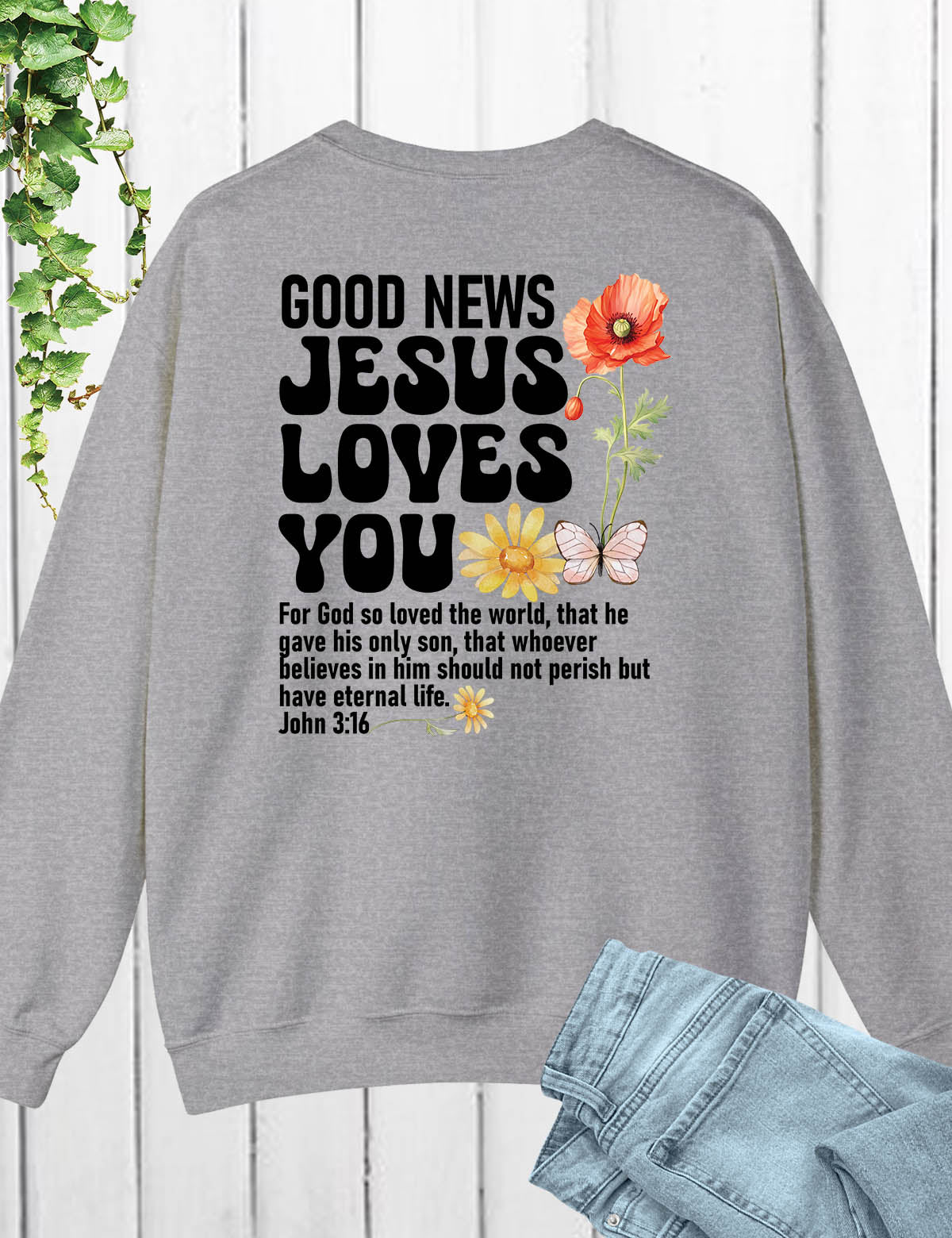 Good News Jesus Loves You Vintage Faith Based Sweatshirts John 3 16 Back Print Sweatshirt