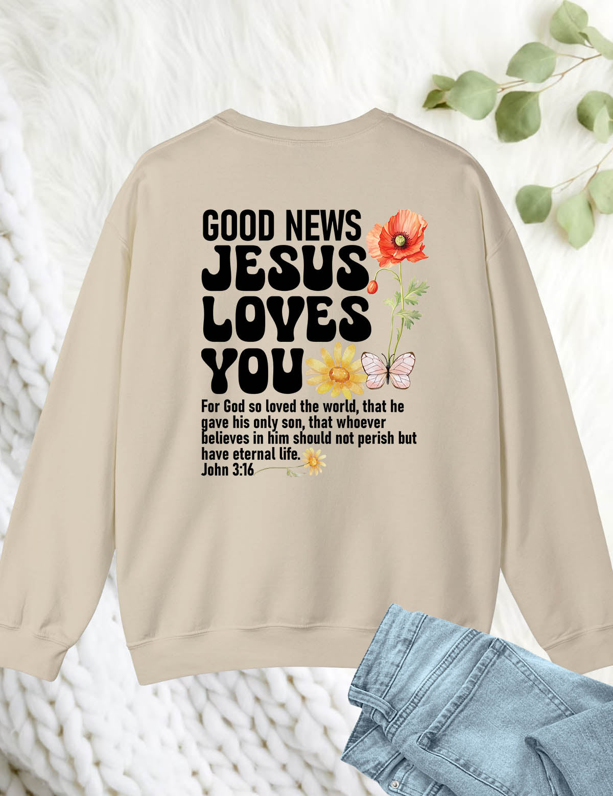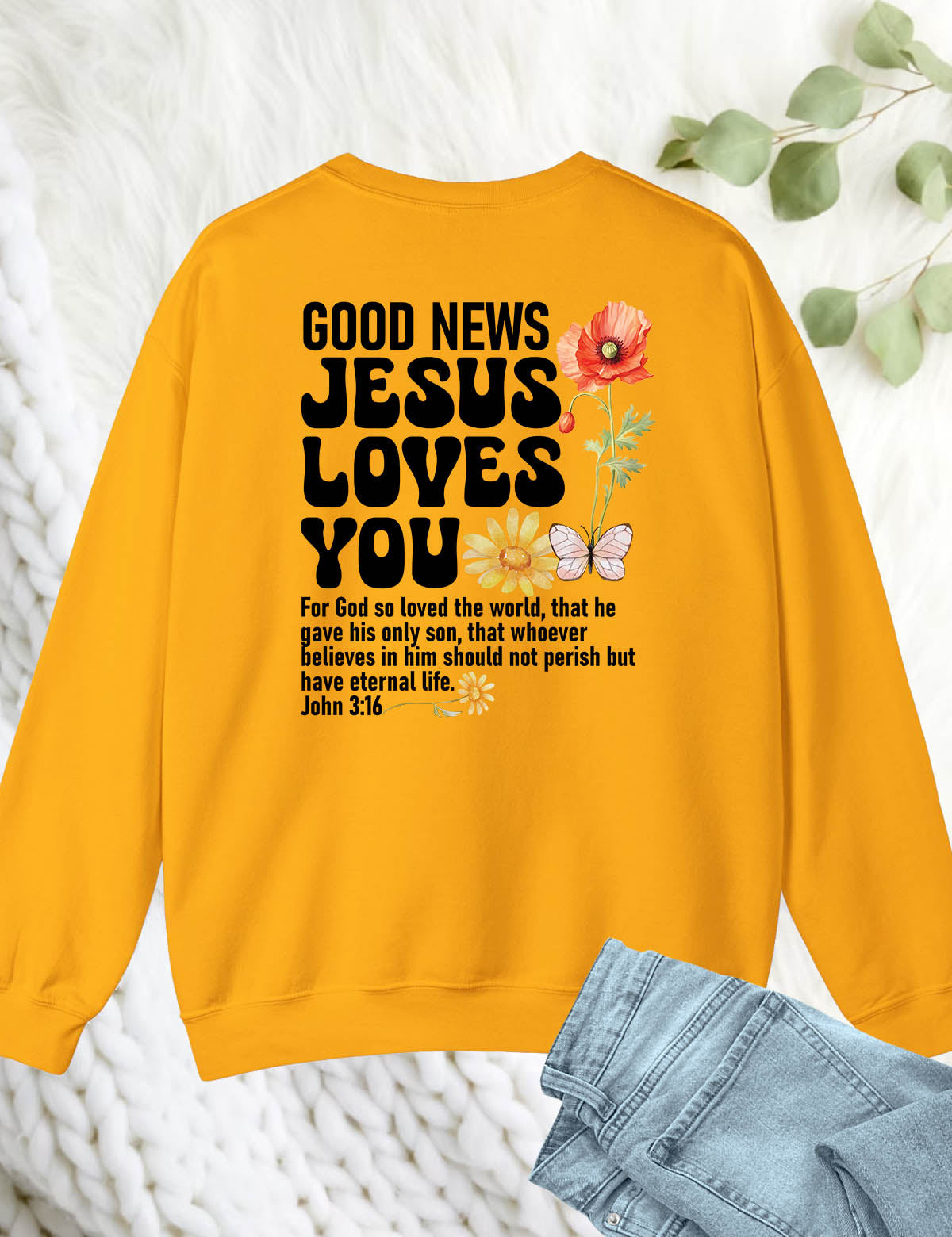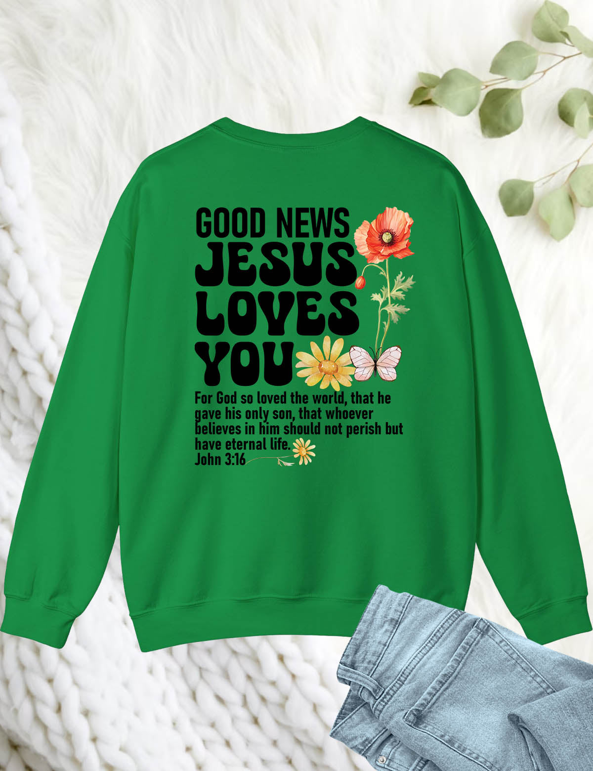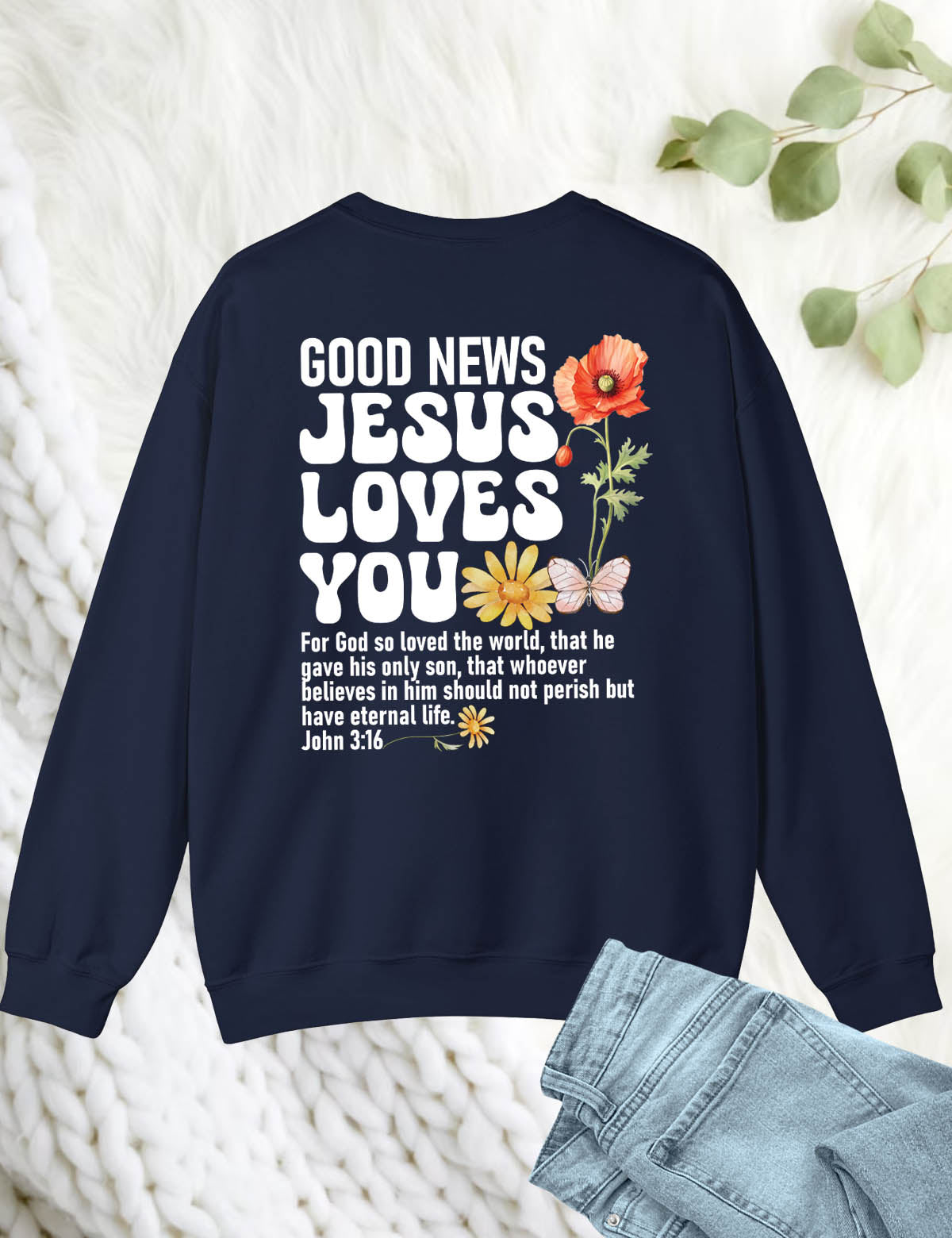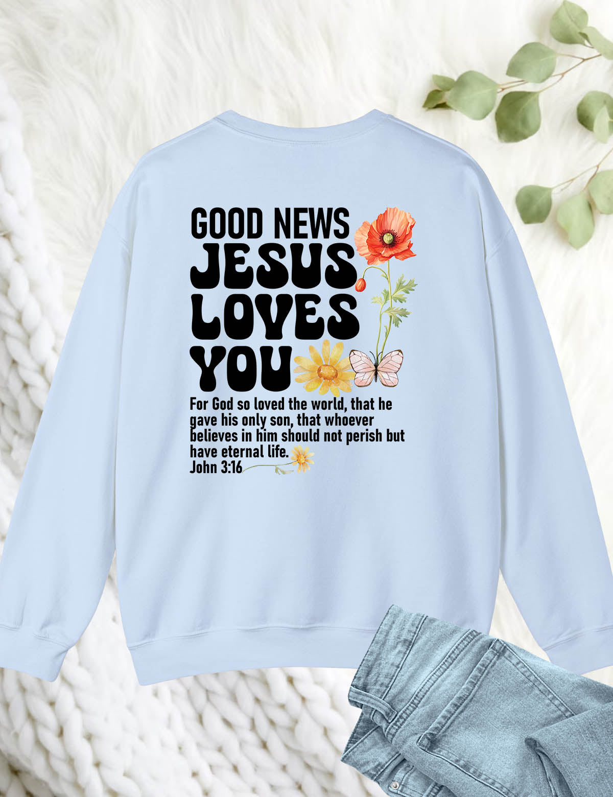 Good News Jesus Loves You Vintage Faith Based Sweatshirts John 3 16 Back Print Sweatshirt