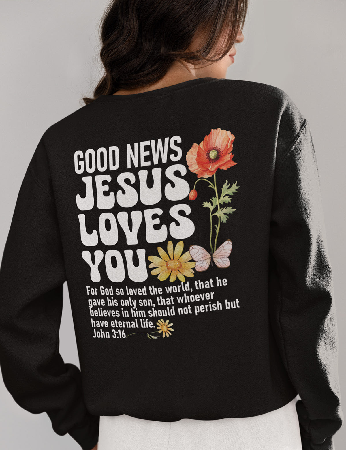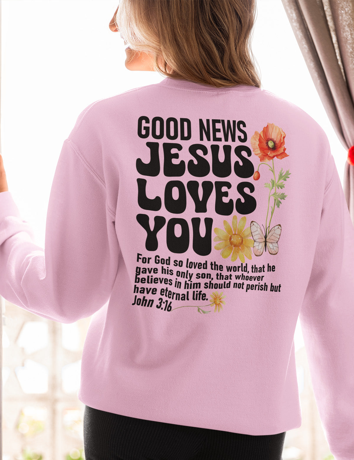 This Good News Jesus Loves You sweatshirt is a vintage-inspired design featuring a faith-based message of love and salvation. With a back print of John 3:16, this sweatshirt serves as a reminder of a powerful and enduring message, making it a great statement piece for any wardrobe.