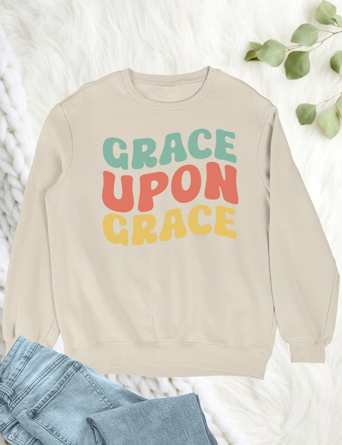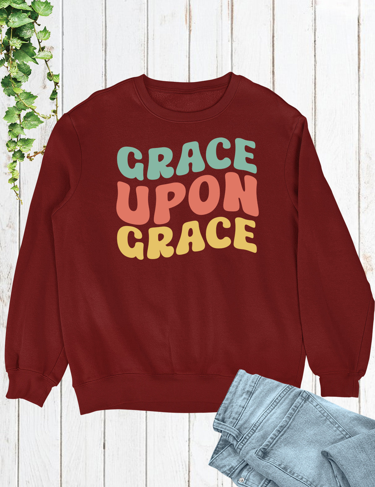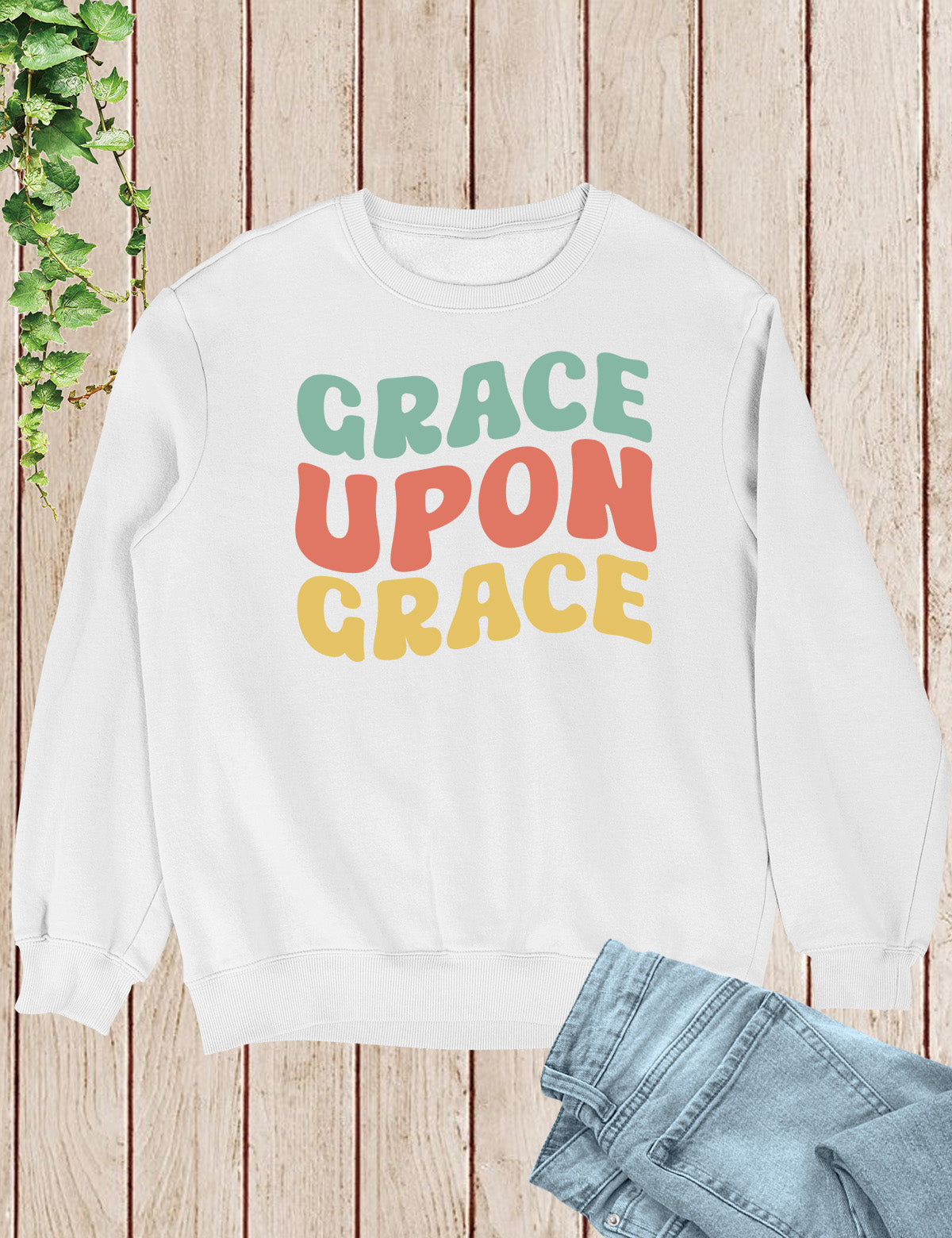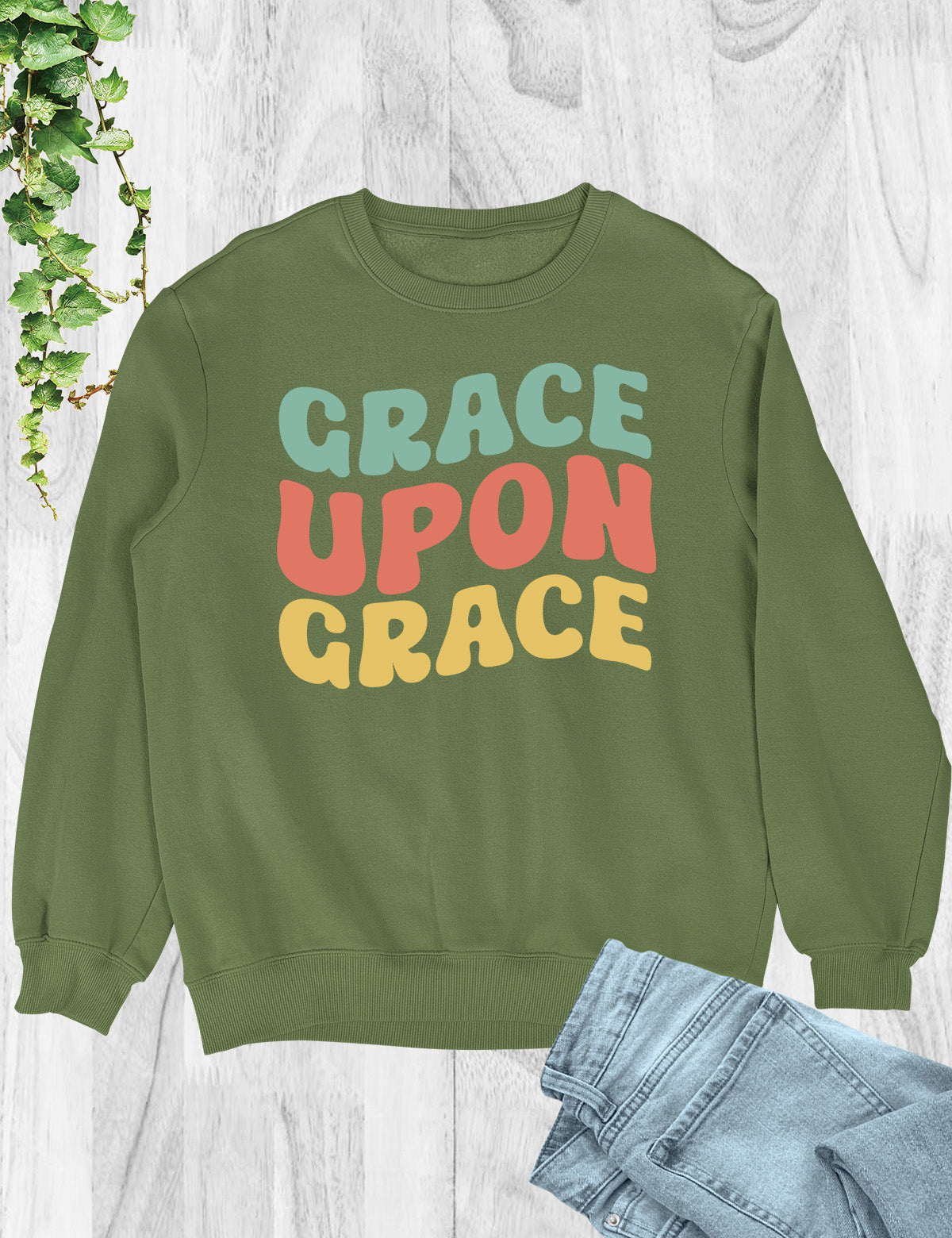 The Grace Upon Grace Christian Sweatshirt is a must-have for any Christian. Made with quality materials, this sweatshirt features a bold statement that serves as a reminder of God's never-ending grace. Stay warm and stylish while spreading an uplifting message with this sweatshirt.