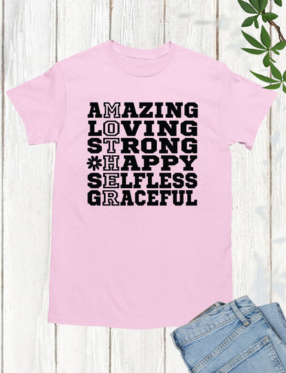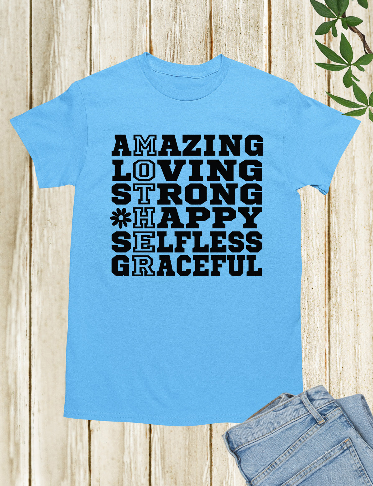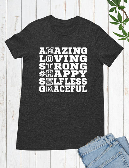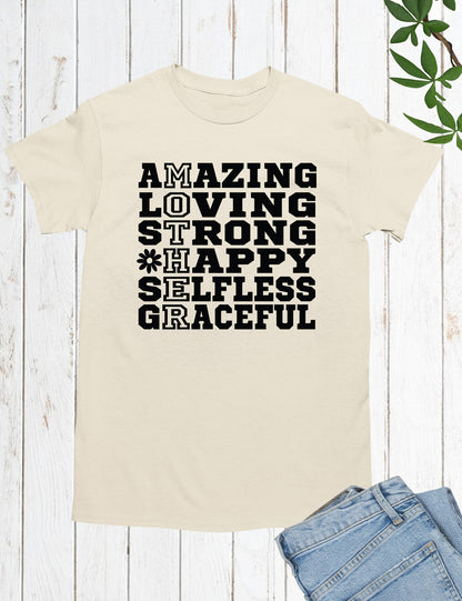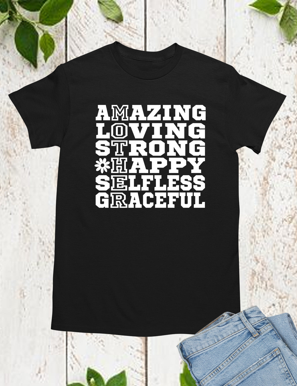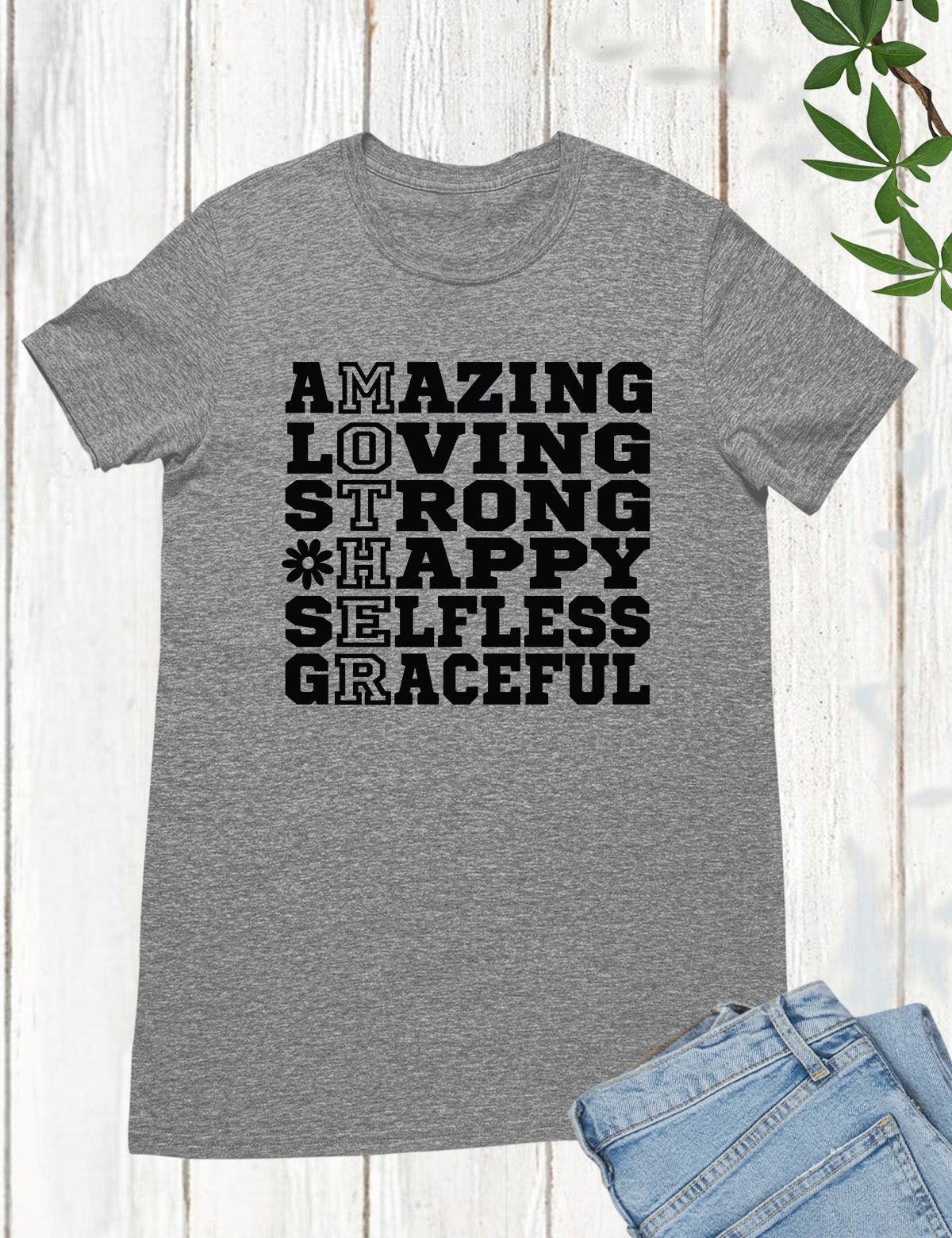 This Graceful Mother Christian T Shirt embodies the qualities of amazing, loving, strong, happy, and selfless. Wear it as a reminder to embrace those traits and spread the message of unconditional love.