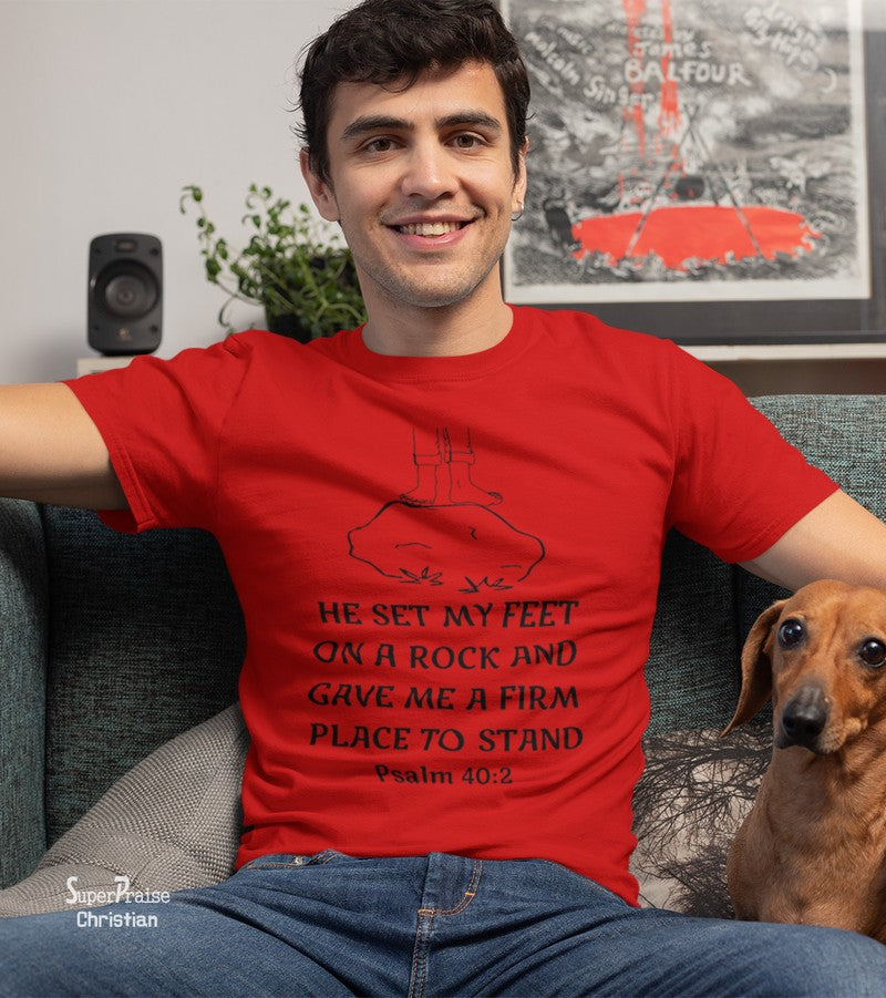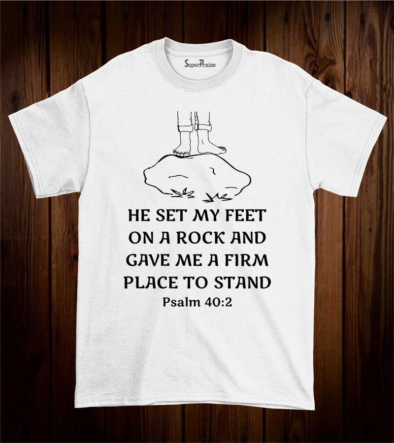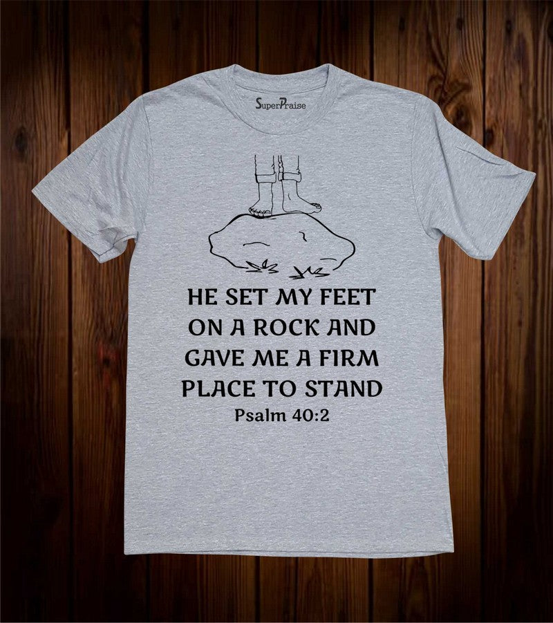 This "He Set My Feet On A Rock Psalm" t-shirt is a must-have for any Christian. Made with high-quality materials, this t-shirt features a powerful message from the Bible, reminding you that God is your solid foundation. Stay stylish and spiritually uplifted with this shirt.