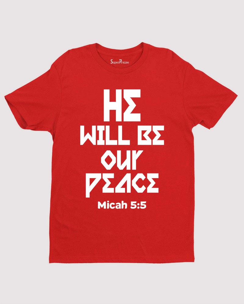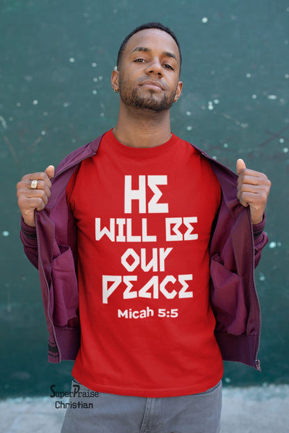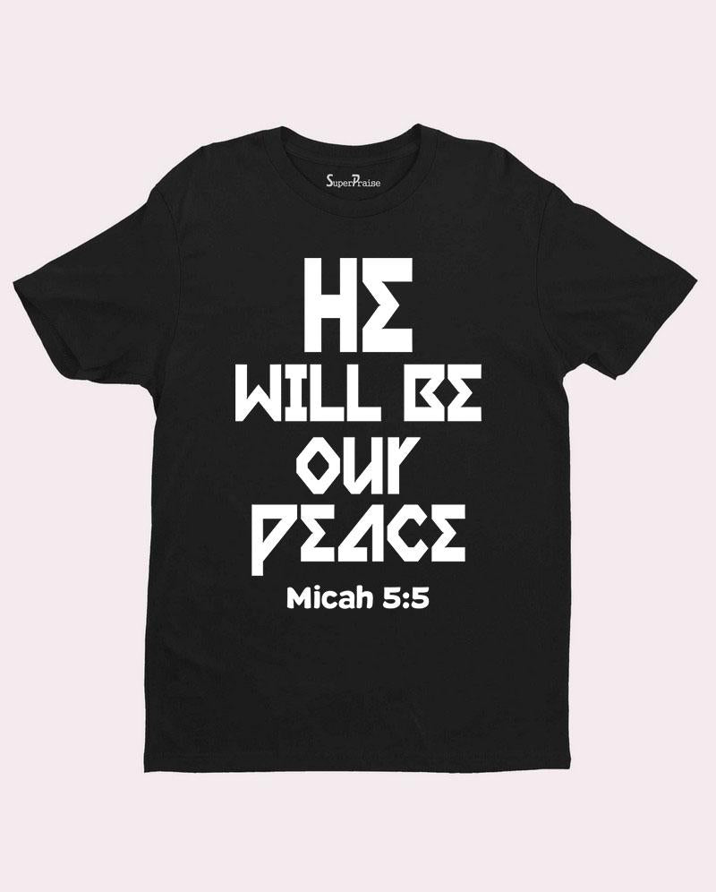 This t-shirt features the phrase "He Will Be Our Peace" from Micah 5:5. Show your faith and remind others of the promise of peace with this powerful message. Made from high-quality materials, this t-shirt offers both comfort and durability. Perfect for everyday wear or as a statement piece.