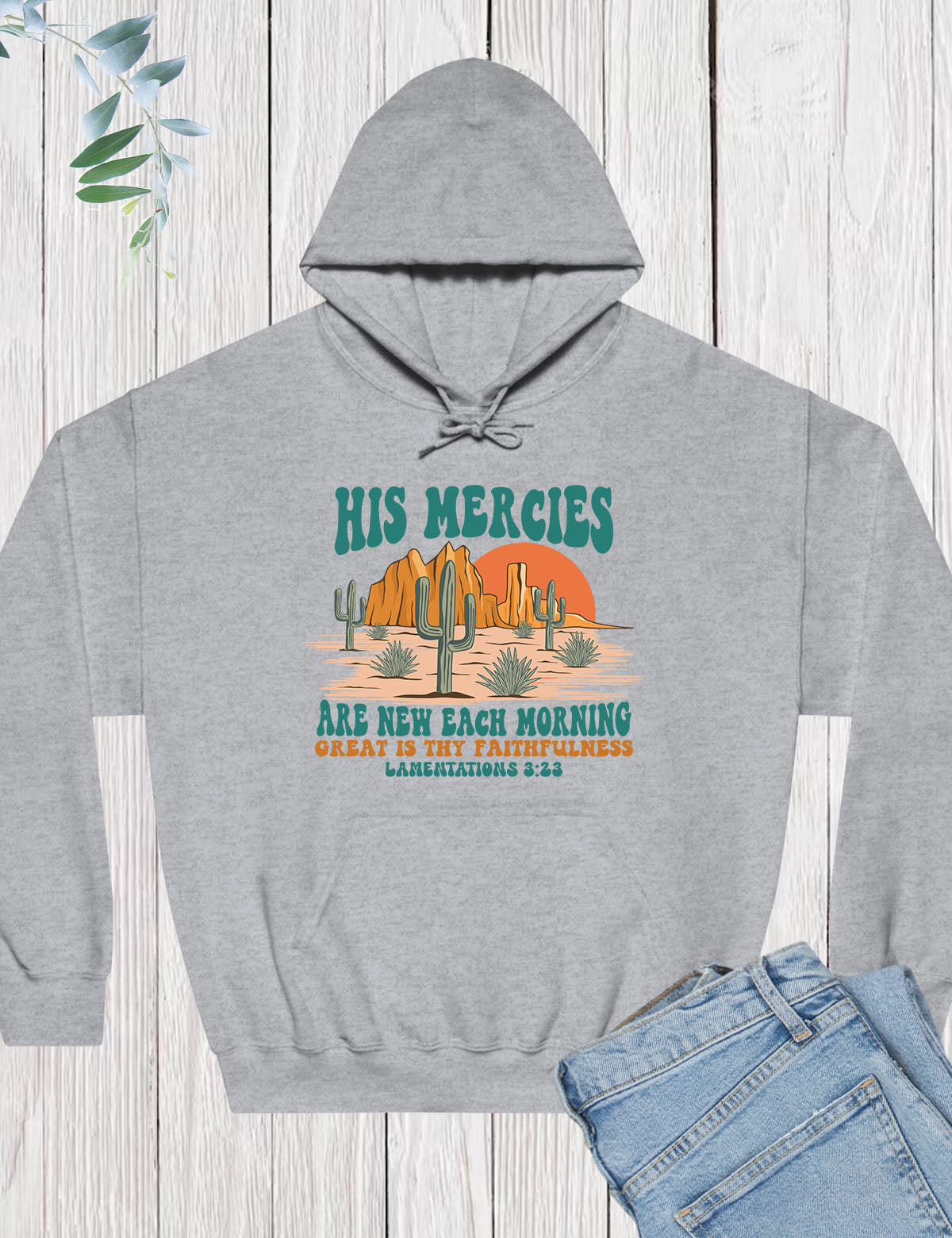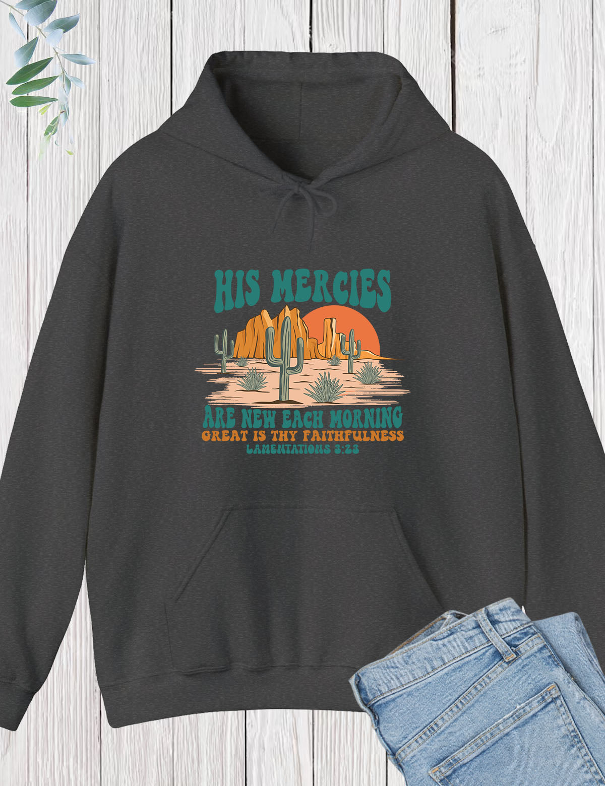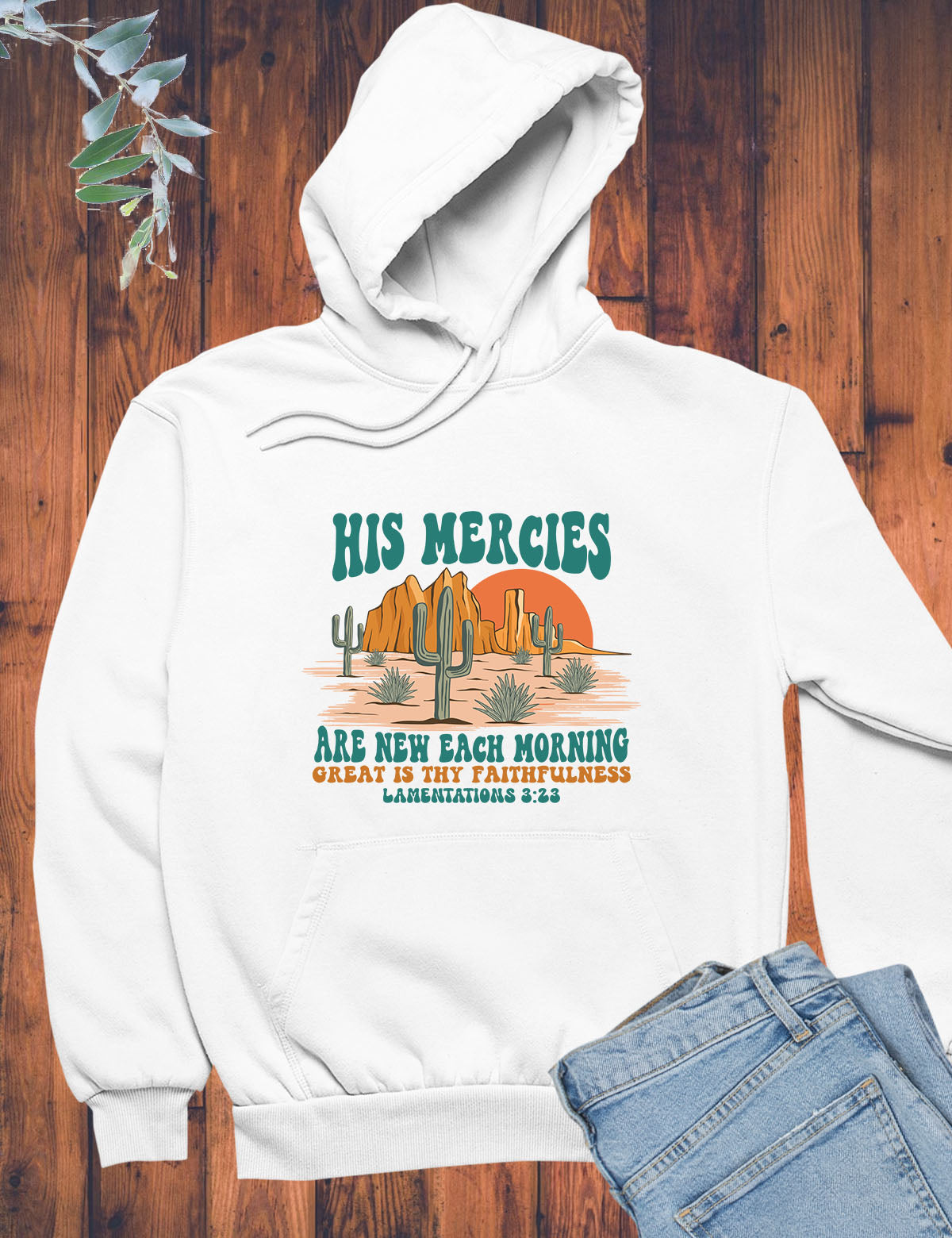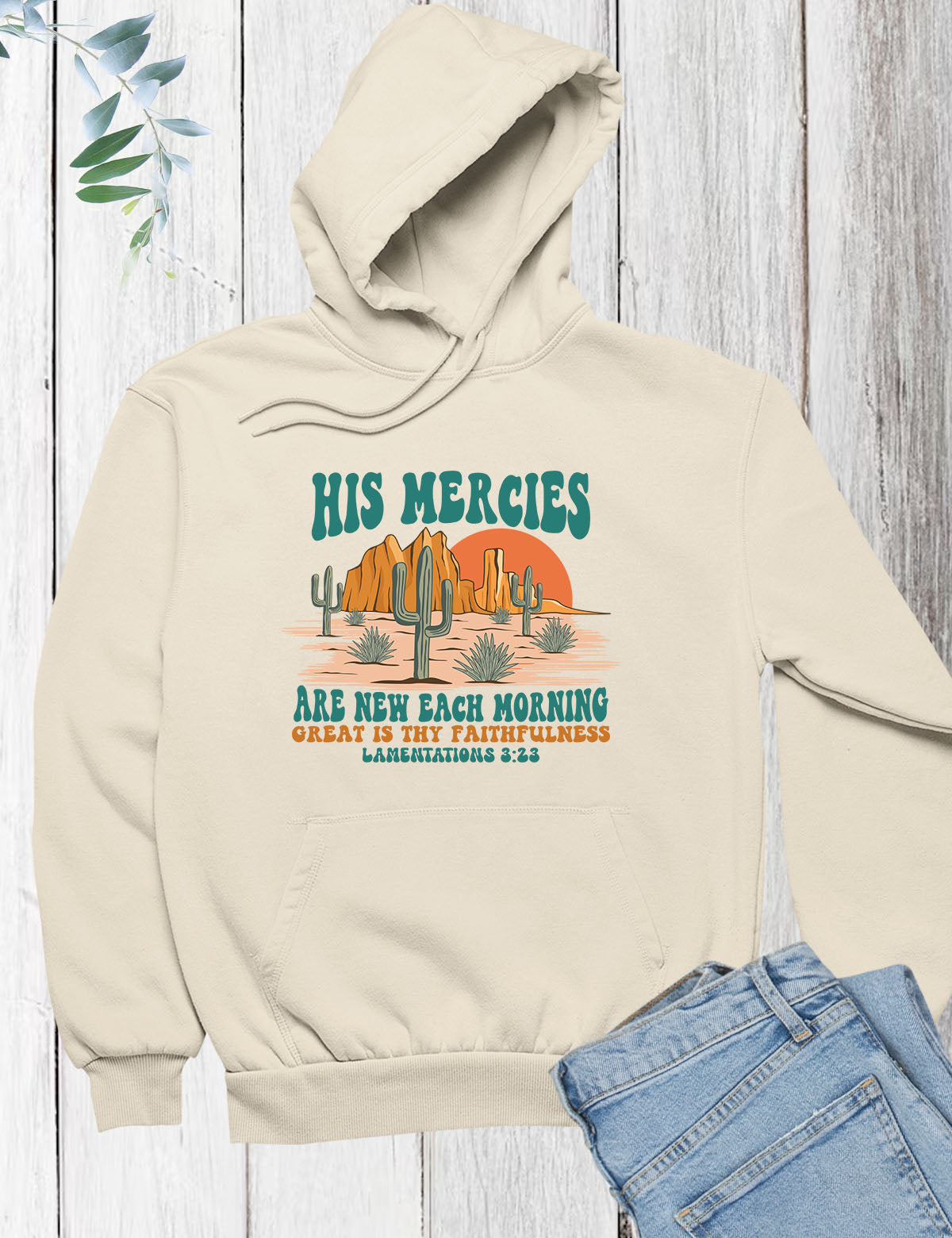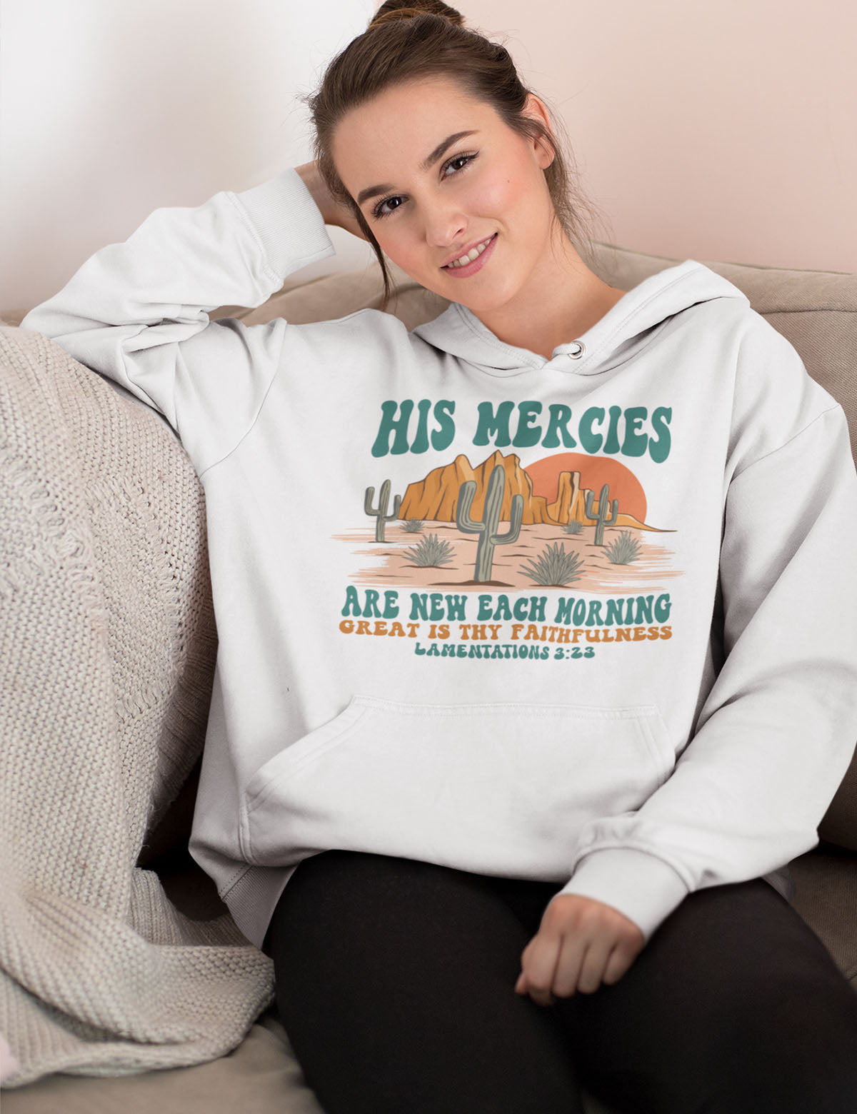 Stay cozy and stylish with our His Mercies All New Every Morning Boho Christian Hoodie. Made with quality materials and featuring a unique design, this hoodie not only keeps you warm but also serves as a reminder of the constant grace and renewal in your faith. Perfect for any believer looking for a comfortable and meaningful fashion statement.