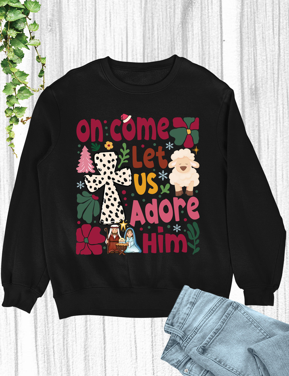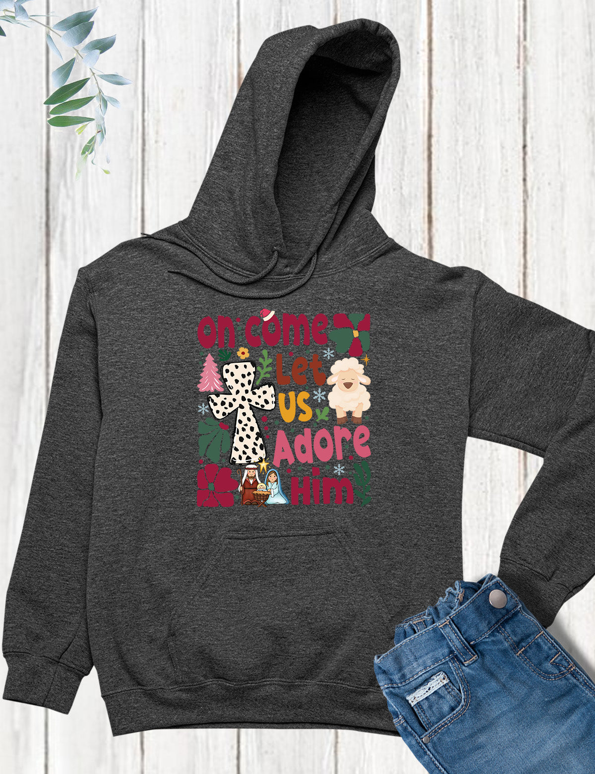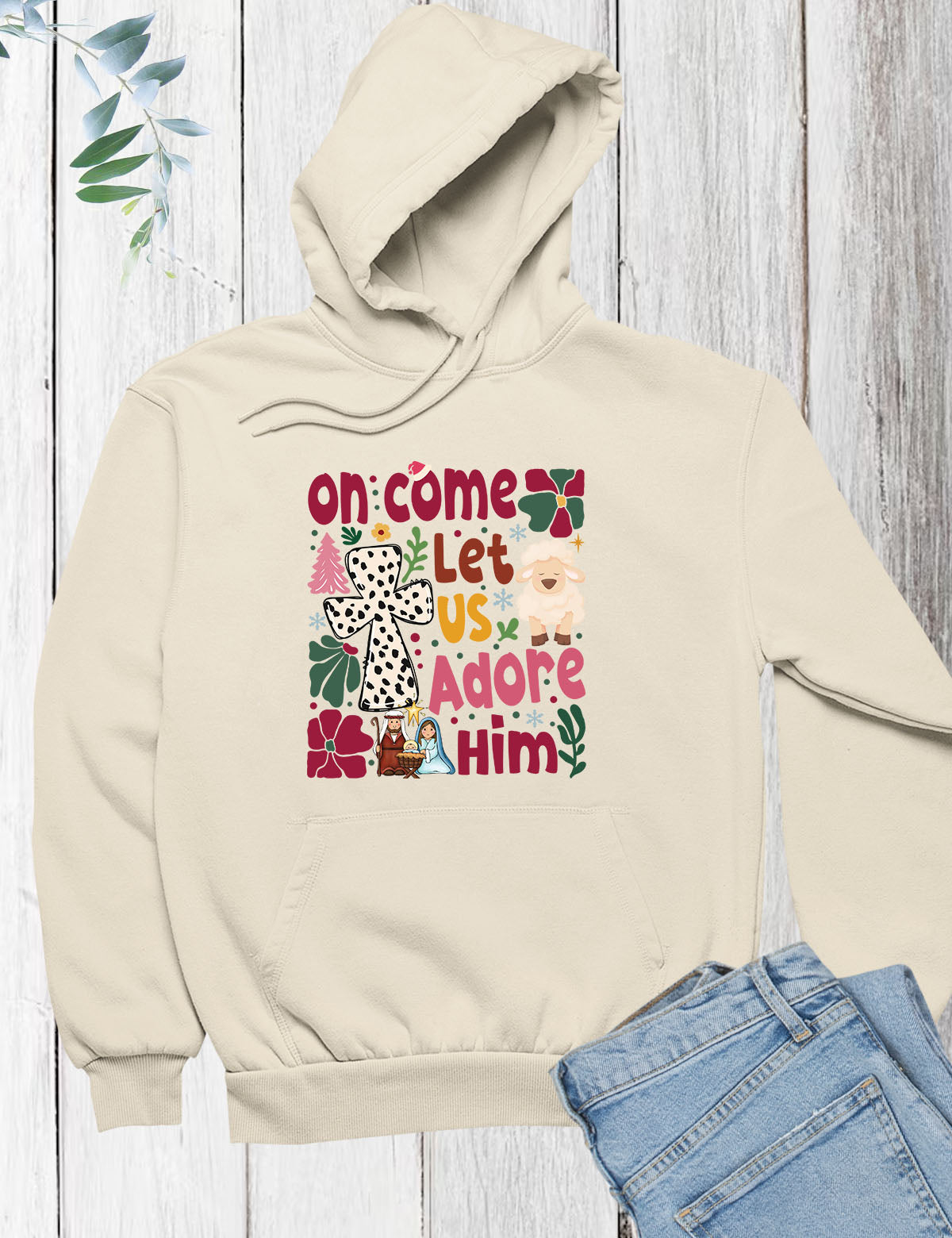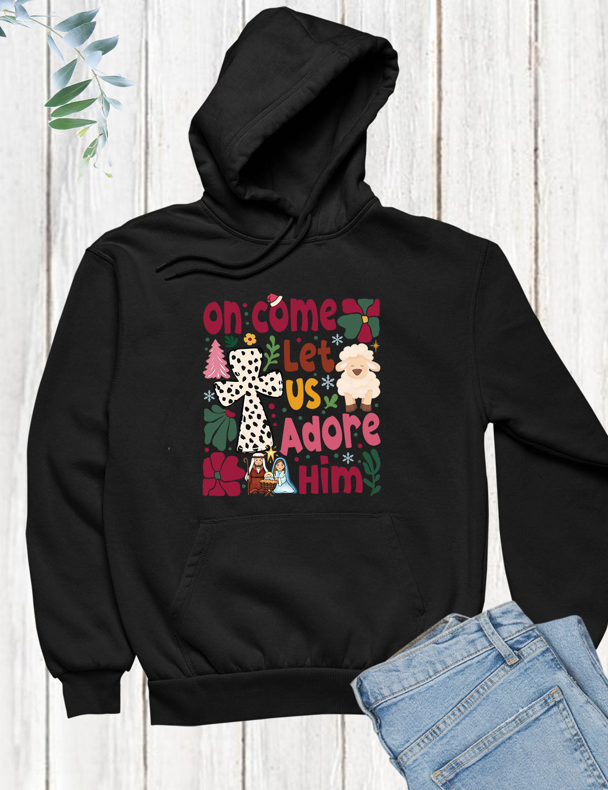 This Let us Adore Him Christmas Hoodie is a festive addition to your holiday wardrobe. Made with high-quality materials, it features a comfortable fit and a beautiful graphic design of the nativity scene. Show your love for the season and spread the message of joy with this stylish hoodie.
