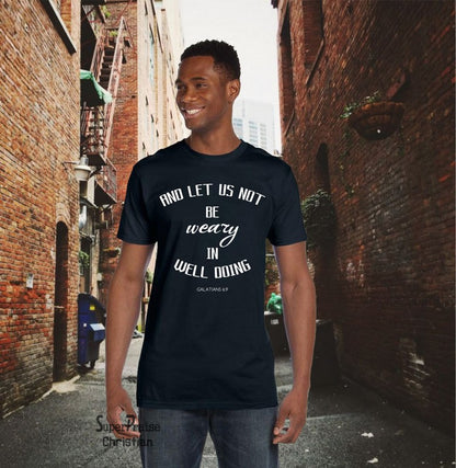 This Let Us Not Be Weary In Well Doing T shirt is perfect for those who want to spread positivity and encouragement. The bold design and comfortable fit make it a great addition to any wardrobe. Made with high-quality materials, this t shirt will be a long-lasting reminder to continue doing good in the world.