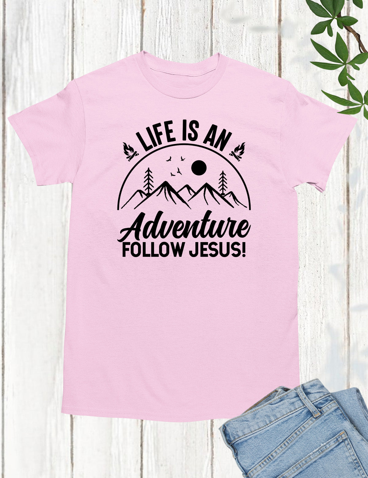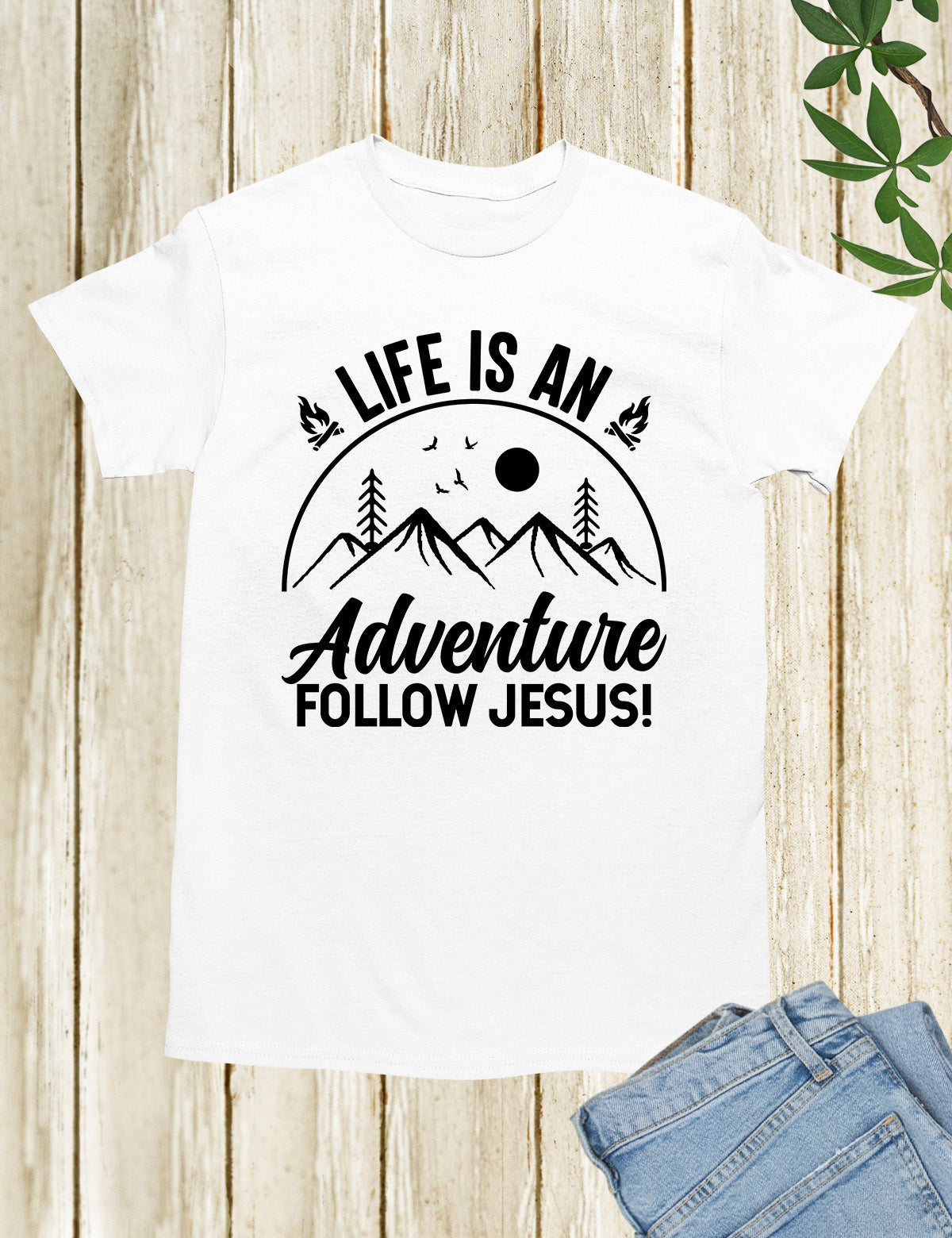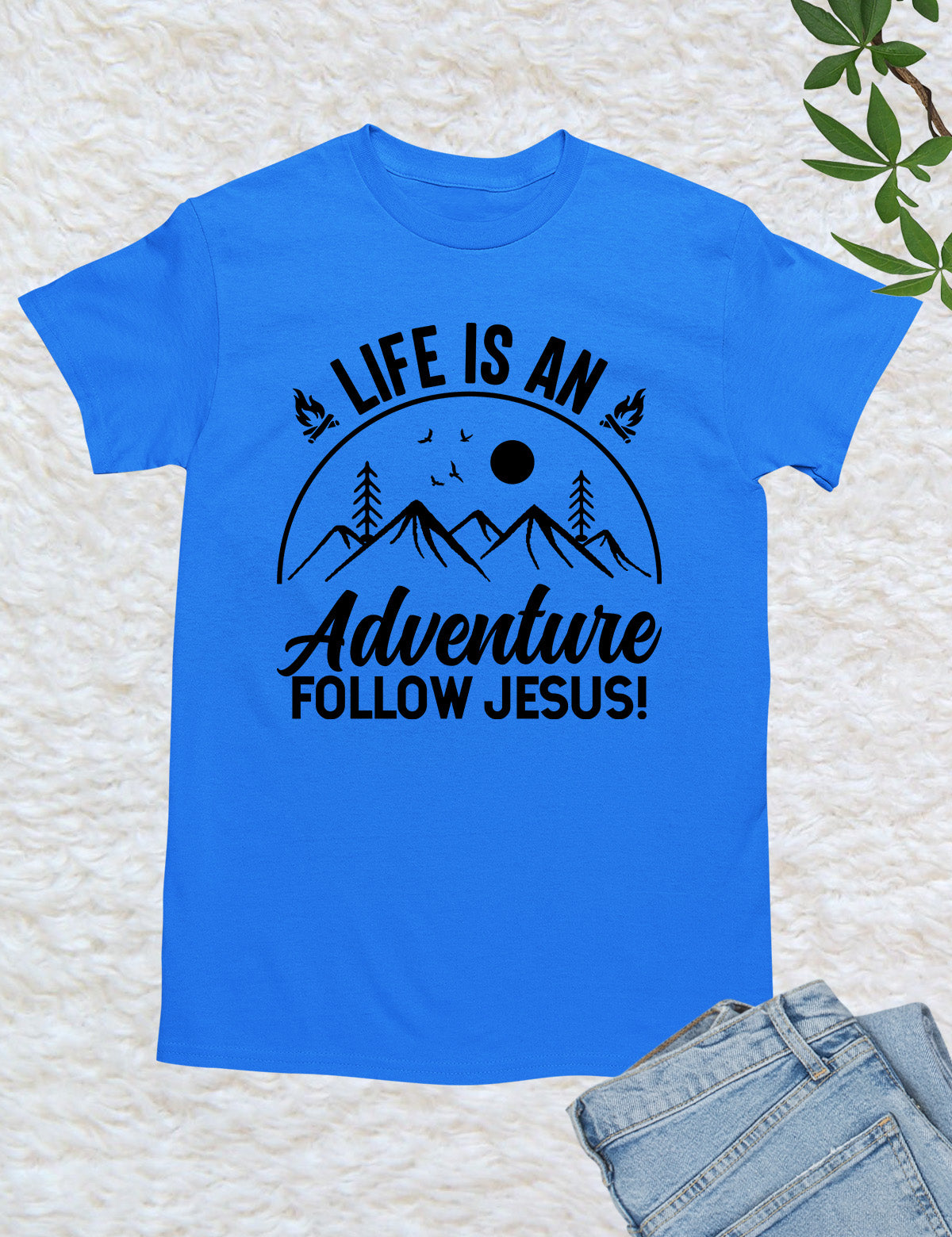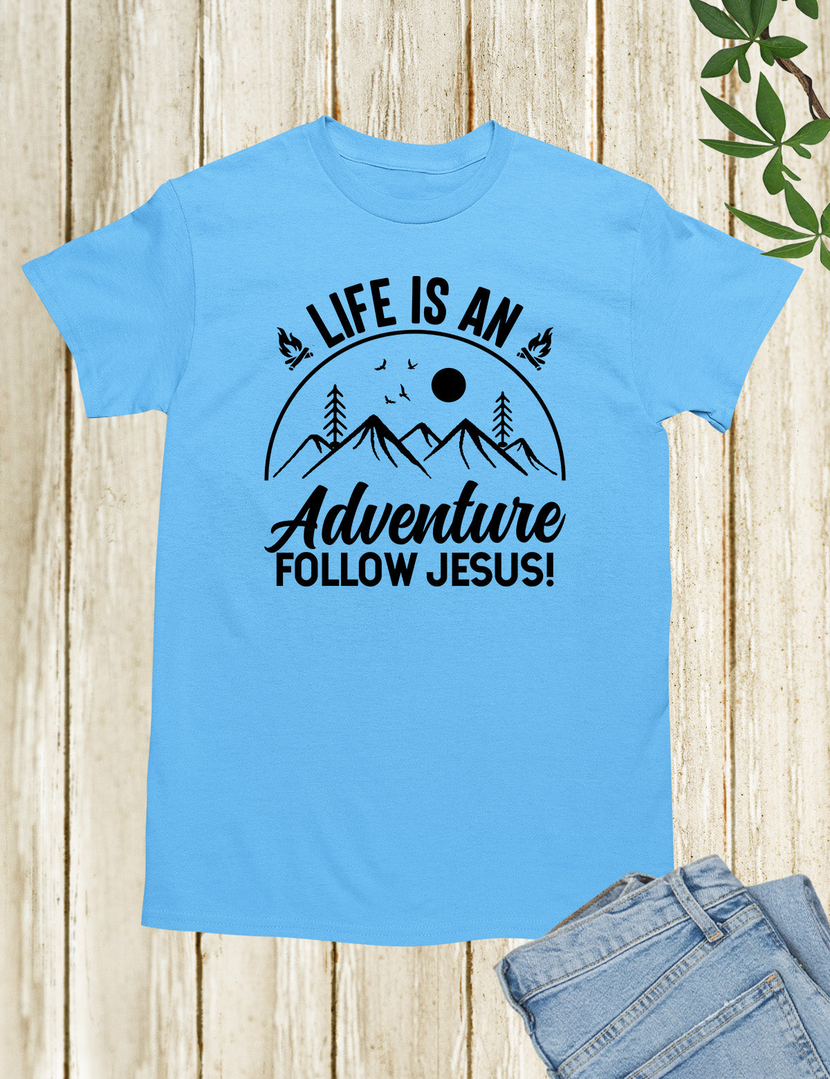 Explore life's wonders while spreading the message of faith with our Life is an Adventure Follow Jesus T Shirt. Made with high-quality materials, this comfortable and stylish shirt serves as a daily reminder to embrace the journey of following Jesus. A perfect addition to any wardrobe, this shirt is a must-have for any Christian.