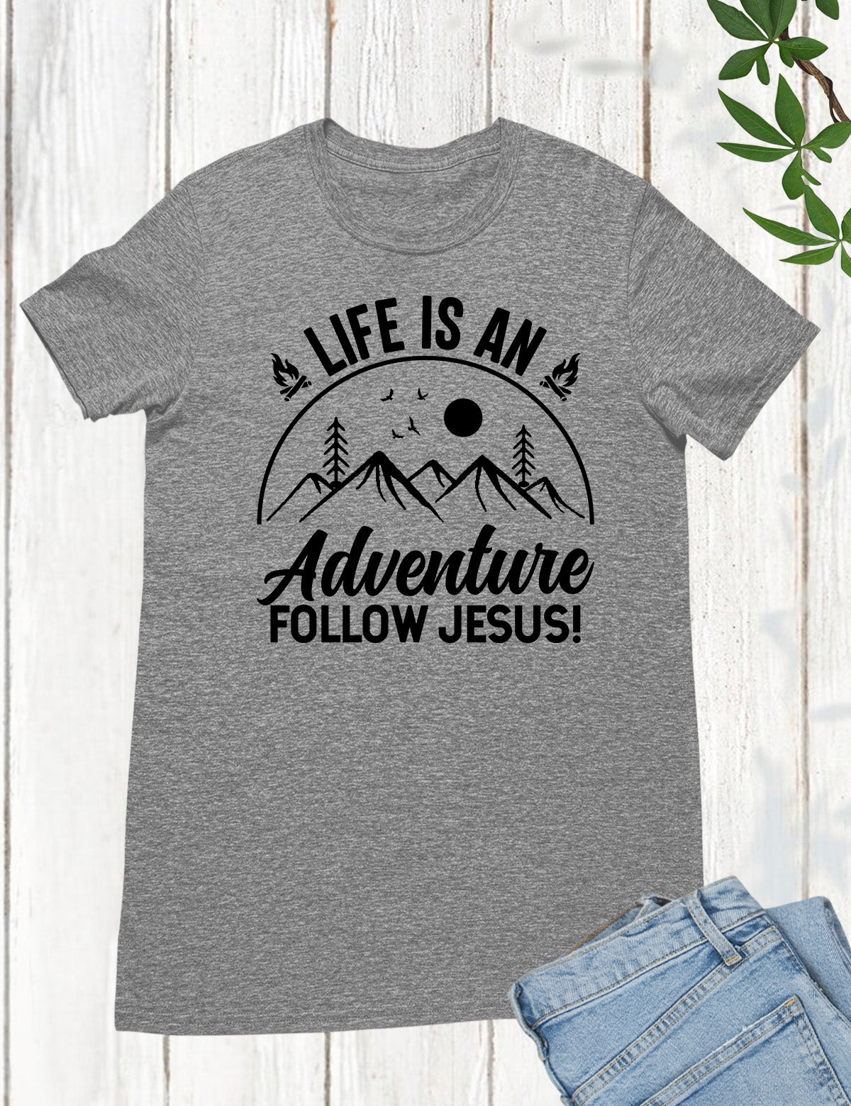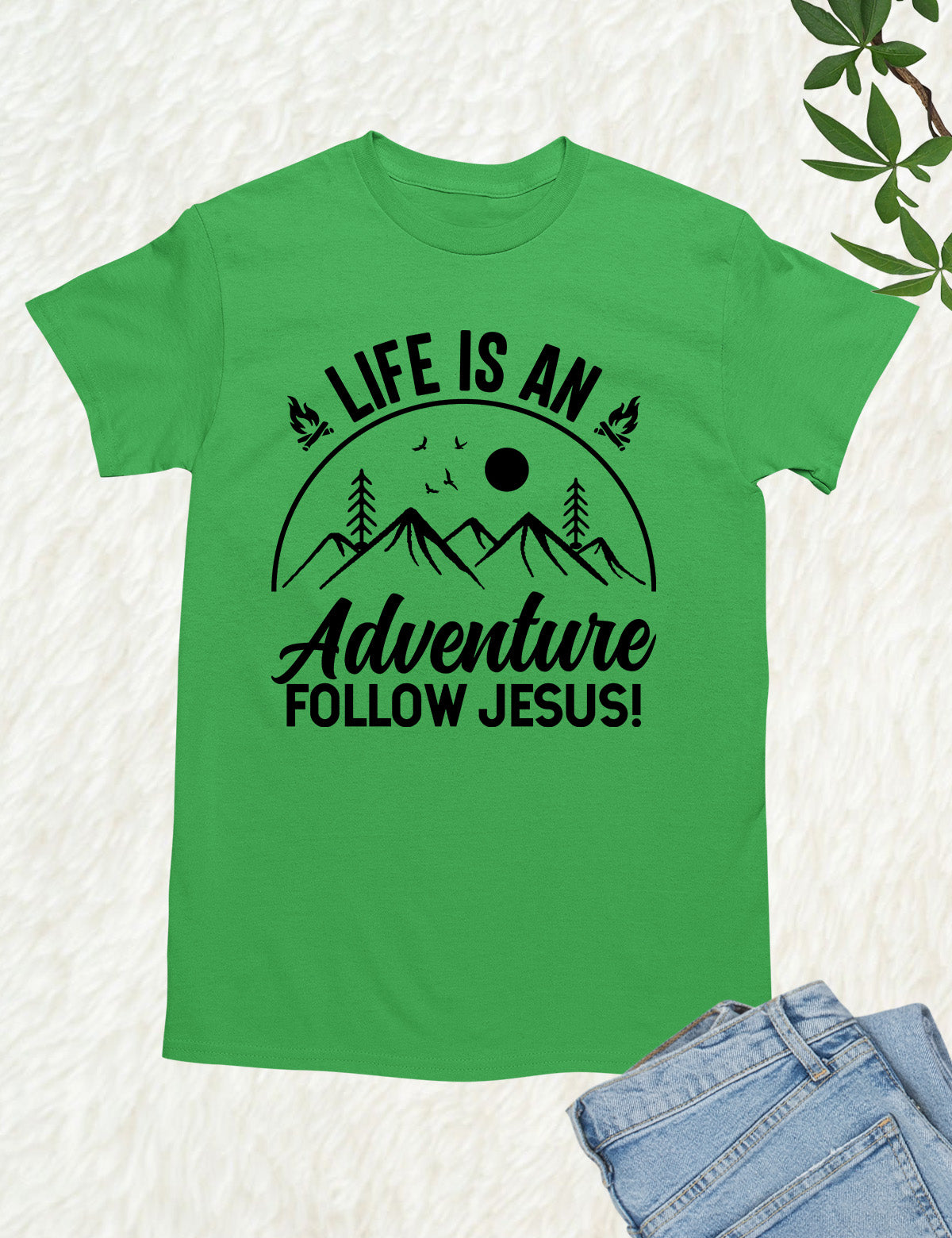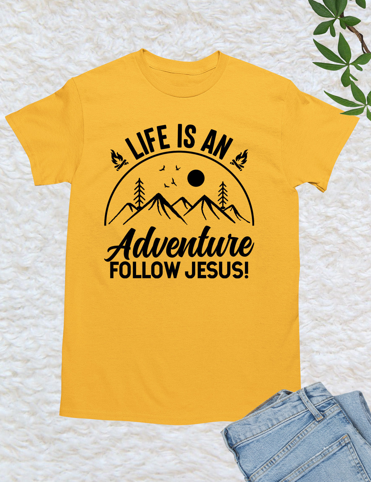 Explore life's wonders while spreading the message of faith with our Life is an Adventure Follow Jesus T Shirt. Made with high-quality materials, this comfortable and stylish shirt serves as a daily reminder to embrace the journey of following Jesus. A perfect addition to any wardrobe, this shirt is a must-have for any Christian.