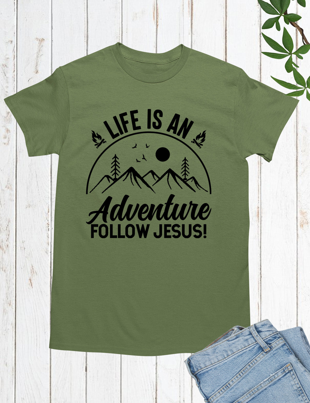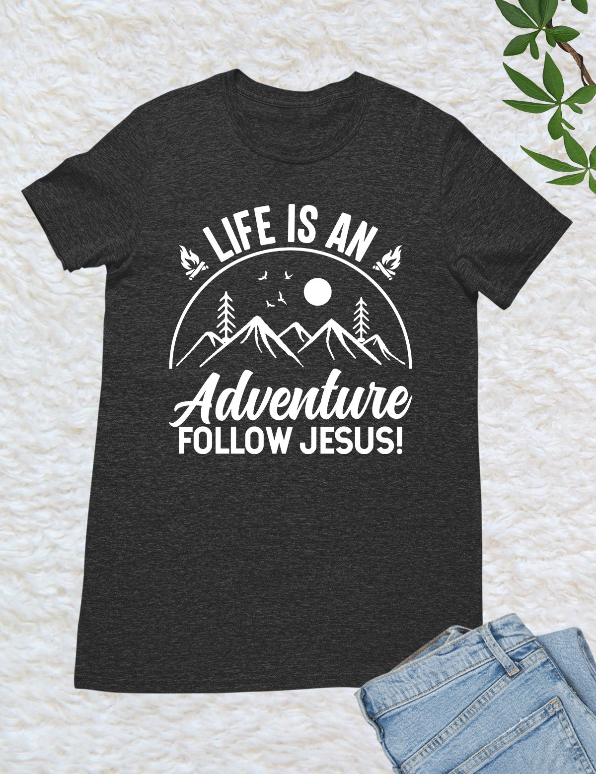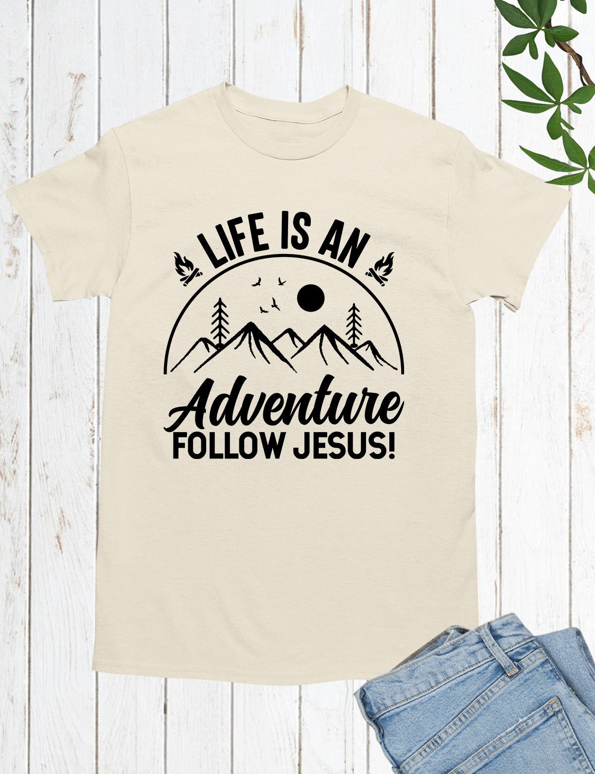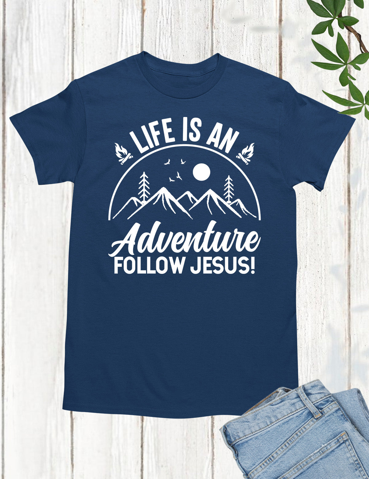 Explore life's wonders while spreading the message of faith with our Life is an Adventure Follow Jesus T Shirt. Made with high-quality materials, this comfortable and stylish shirt serves as a daily reminder to embrace the journey of following Jesus. A perfect addition to any wardrobe, this shirt is a must-have for any Christian.