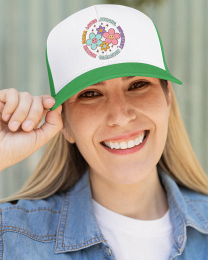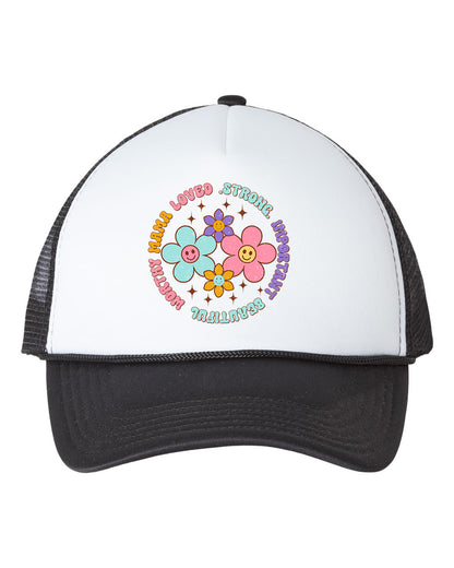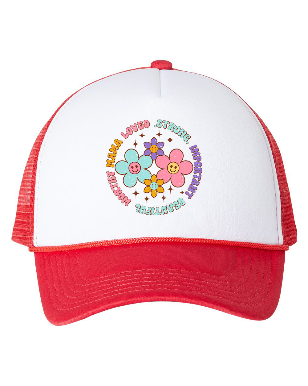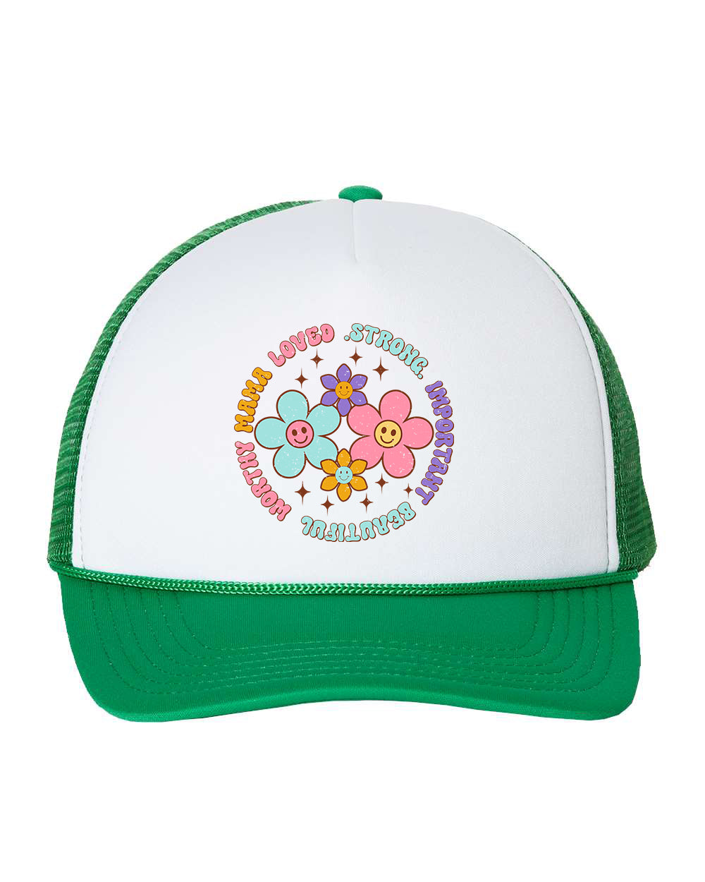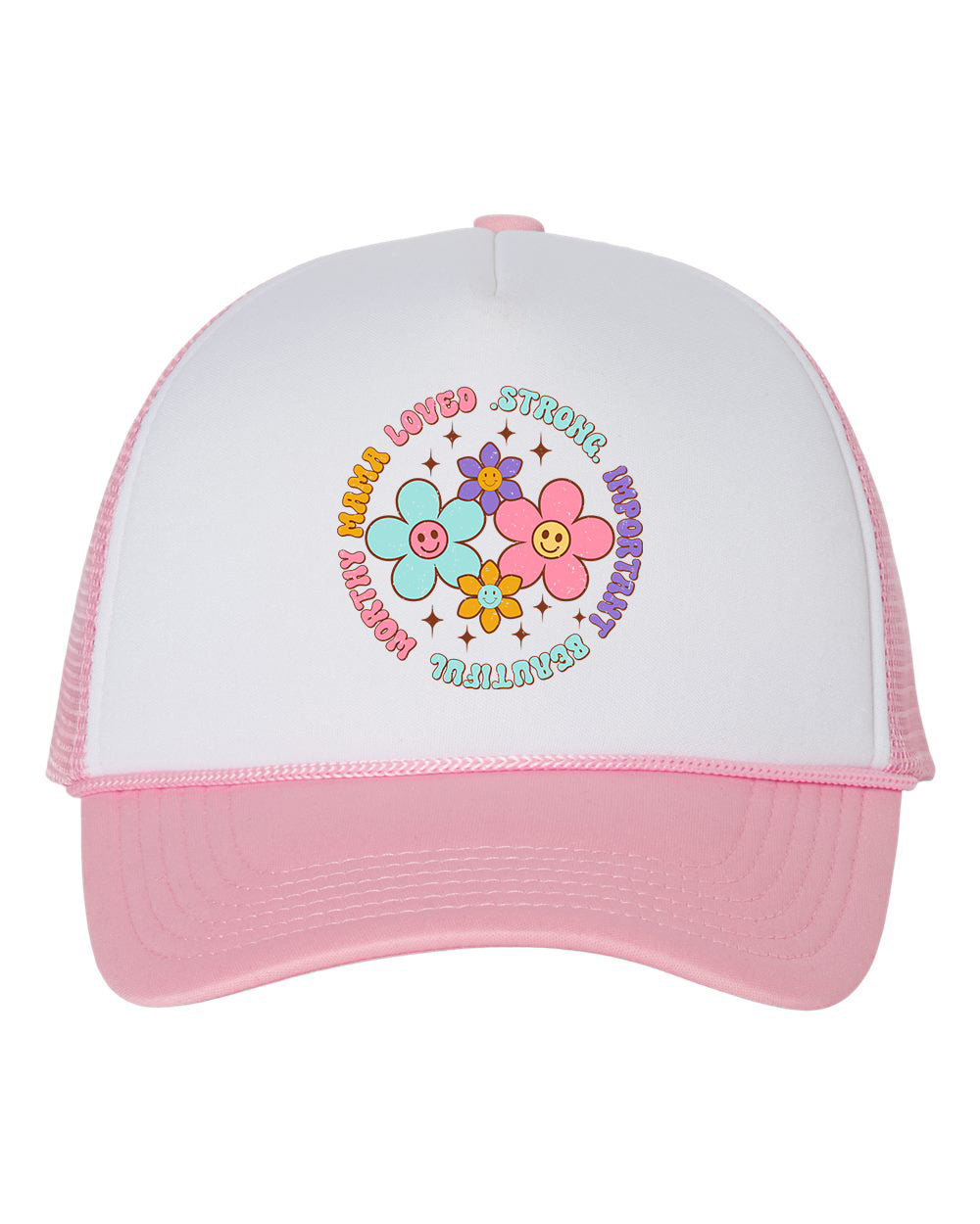 Show off your love and strength with our Loved Strong Important Beautiful Mama Cap. This stylish trucker hat not only looks great, but also serves as a reminder to yourself and others of your importance and beauty. Made with quality material and designed to embody the strength and beauty of motherhood.
