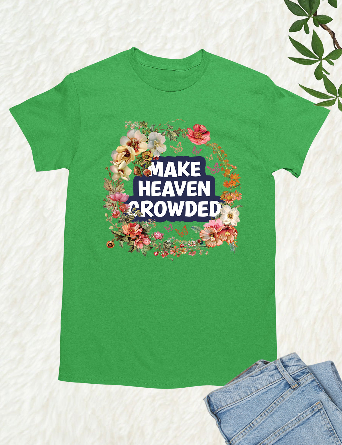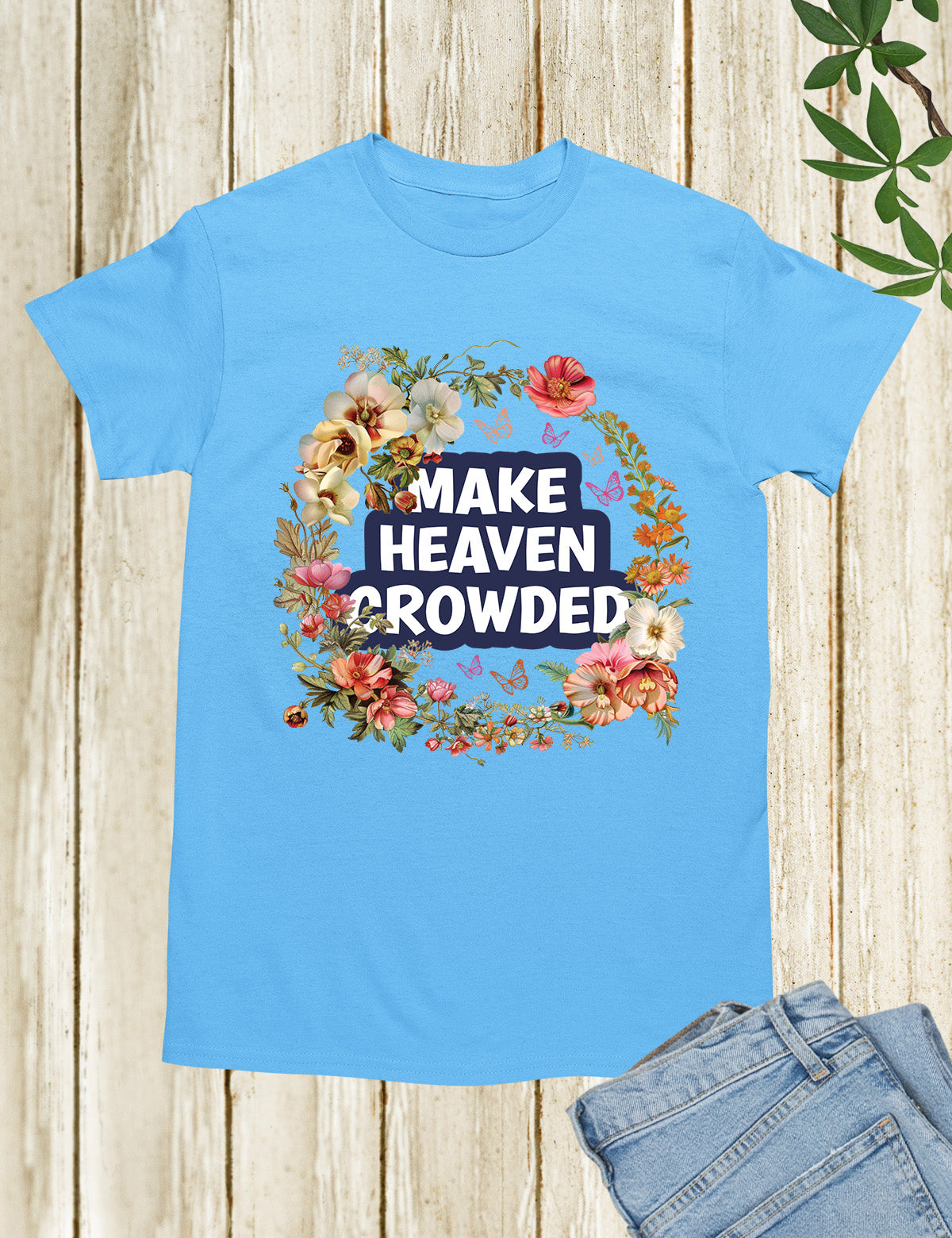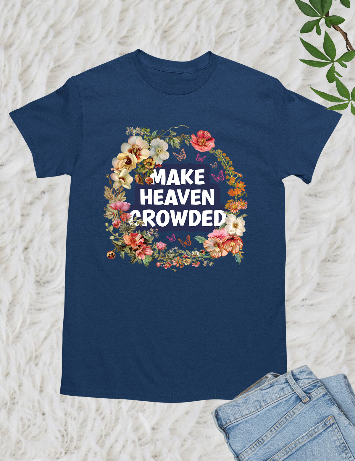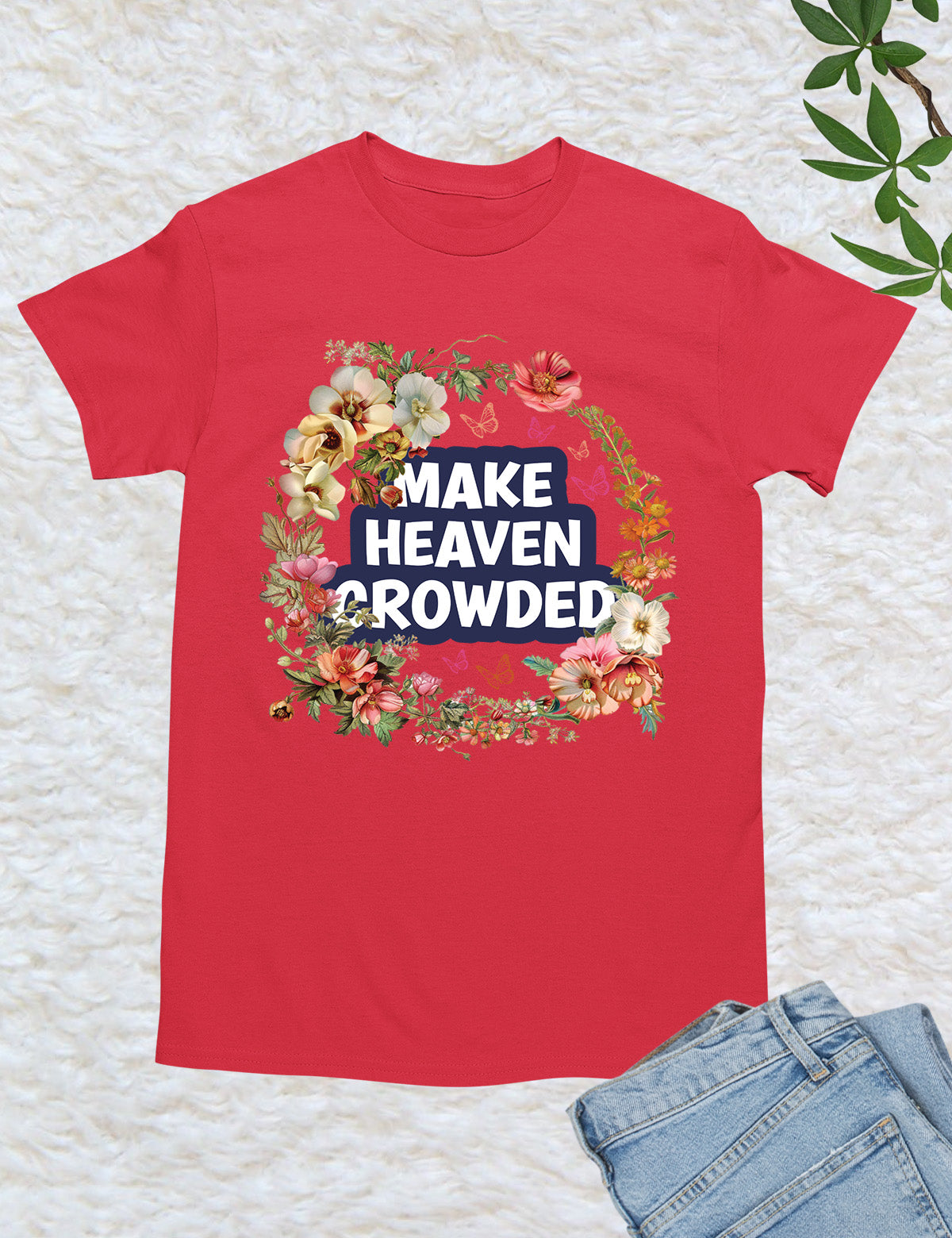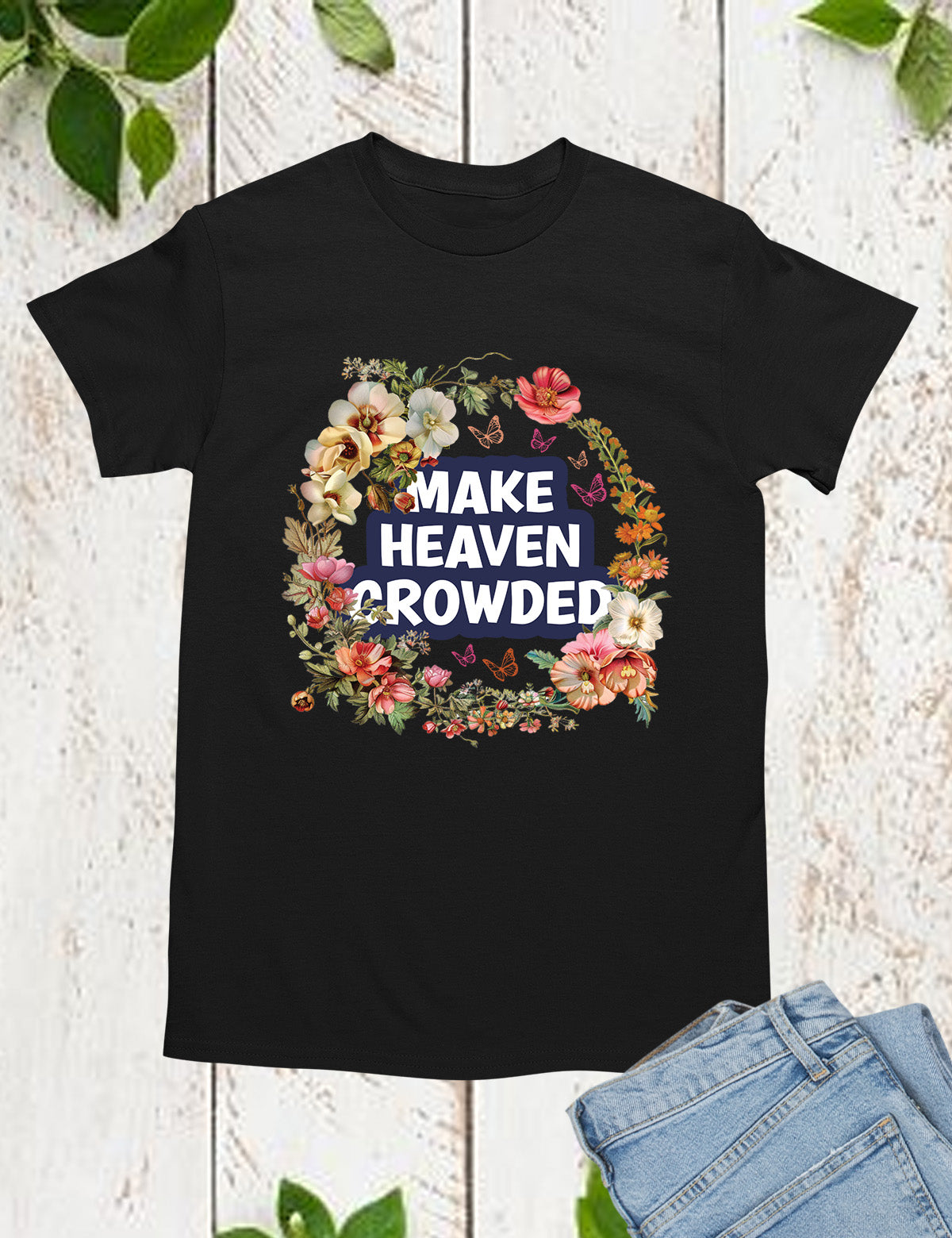 This Make Heaven Crowded Flower Wreath T Shirt features a beautiful design with a meaningful message. Made with high-quality material and expert craftsmanship, it offers both style and comfort. Perfect for everyday wear or special occasions, it's a must-have addition to any wardrobe. Show your love for nature and spread positivity with this one-of-a-kind shirt.