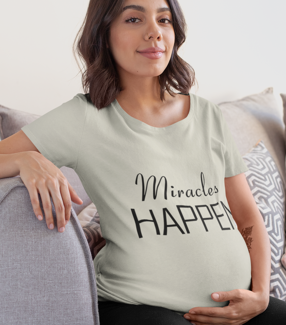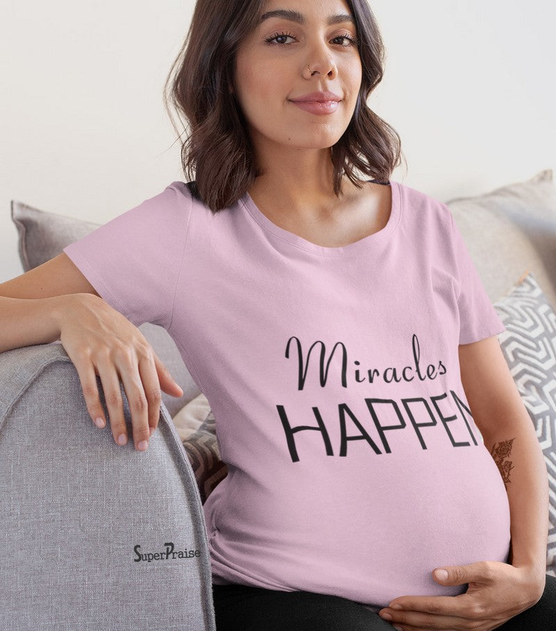 Miracles Happen Christian Maternity T Shirt is stylish for mama to be and very comfortable to wear. This bible scripture maternity t shirt is designed to show off your blessings from the Lord. Wear this pregnancy t shirt to carry the promise of God in you and your little one life. The children are a gift from God.