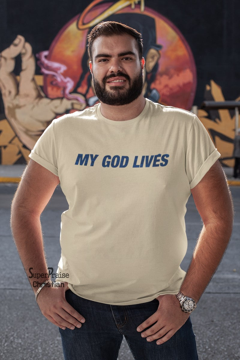 This My God Lives Slogan T Shirt is a must-have for any spiritual wardrobe. Made with high-quality materials, it features a bold slogan that is sure to make a statement. Show your faith and share your beliefs with others in this comfortable and stylish t-shirt.