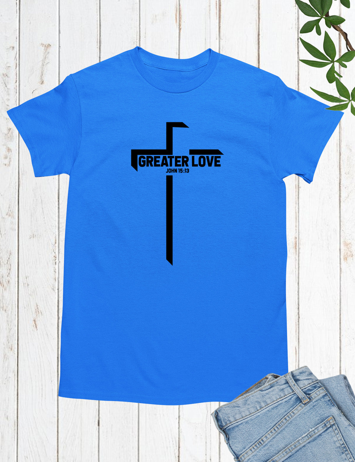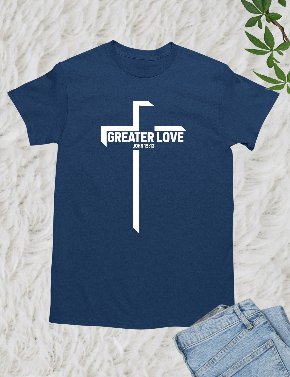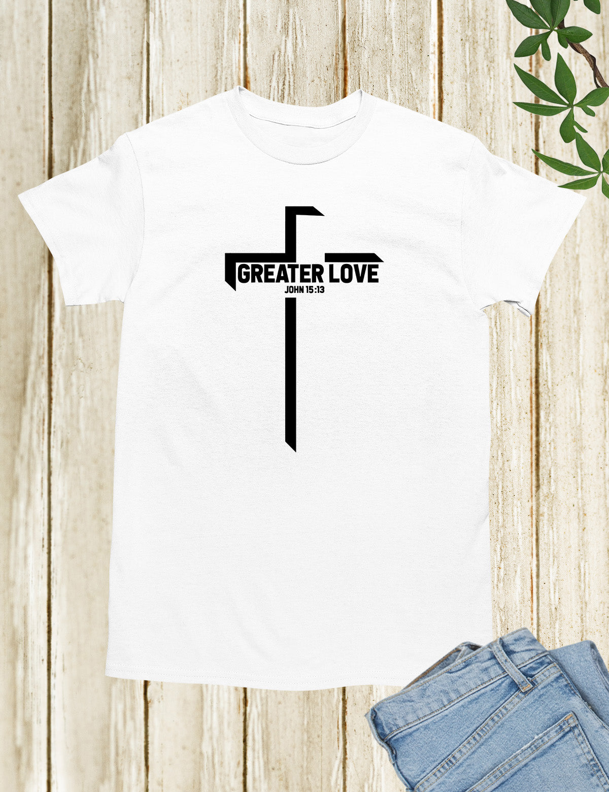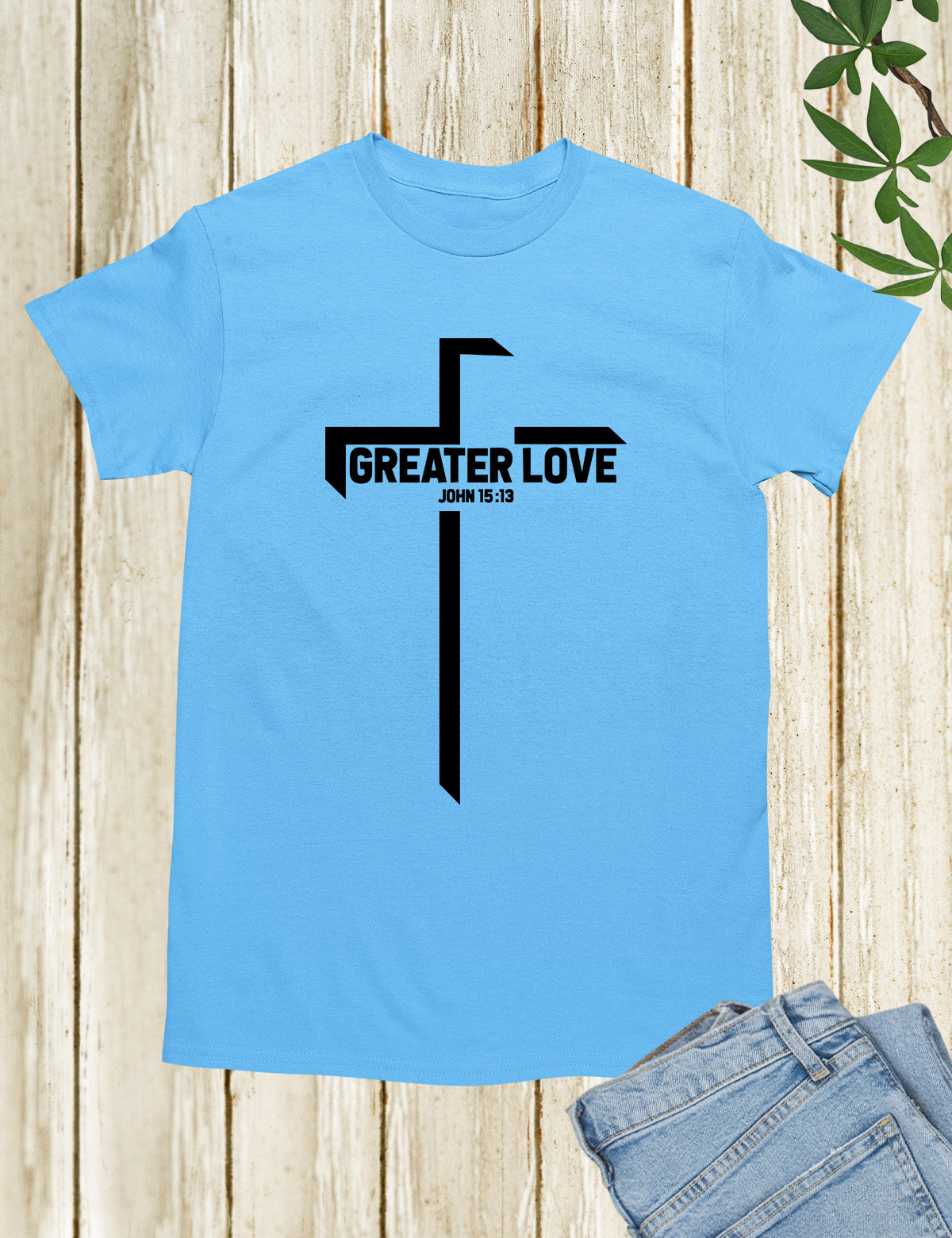 Show your faith and love with our No Greater Love John 15 13 Bible verse shirt. Made with high-quality materials, this shirt features the powerful message of John 15:13. Wear it as a reminder to love others as Christ loved us.