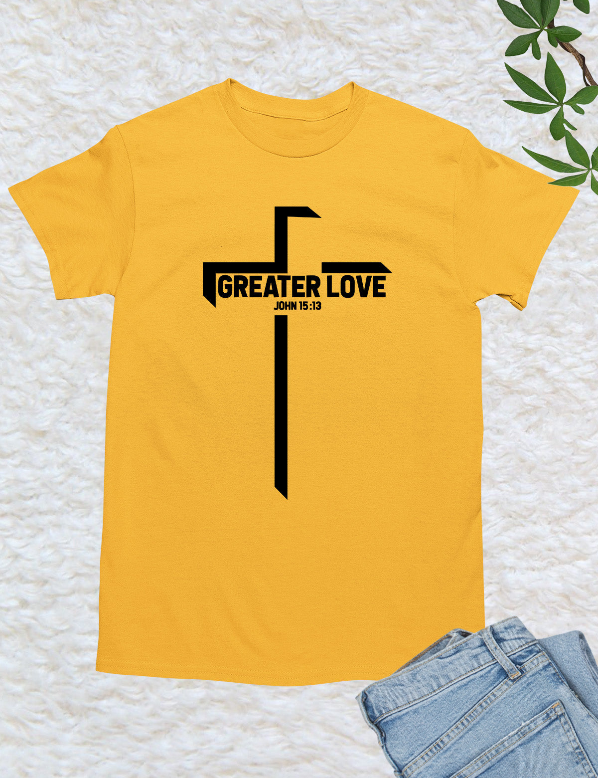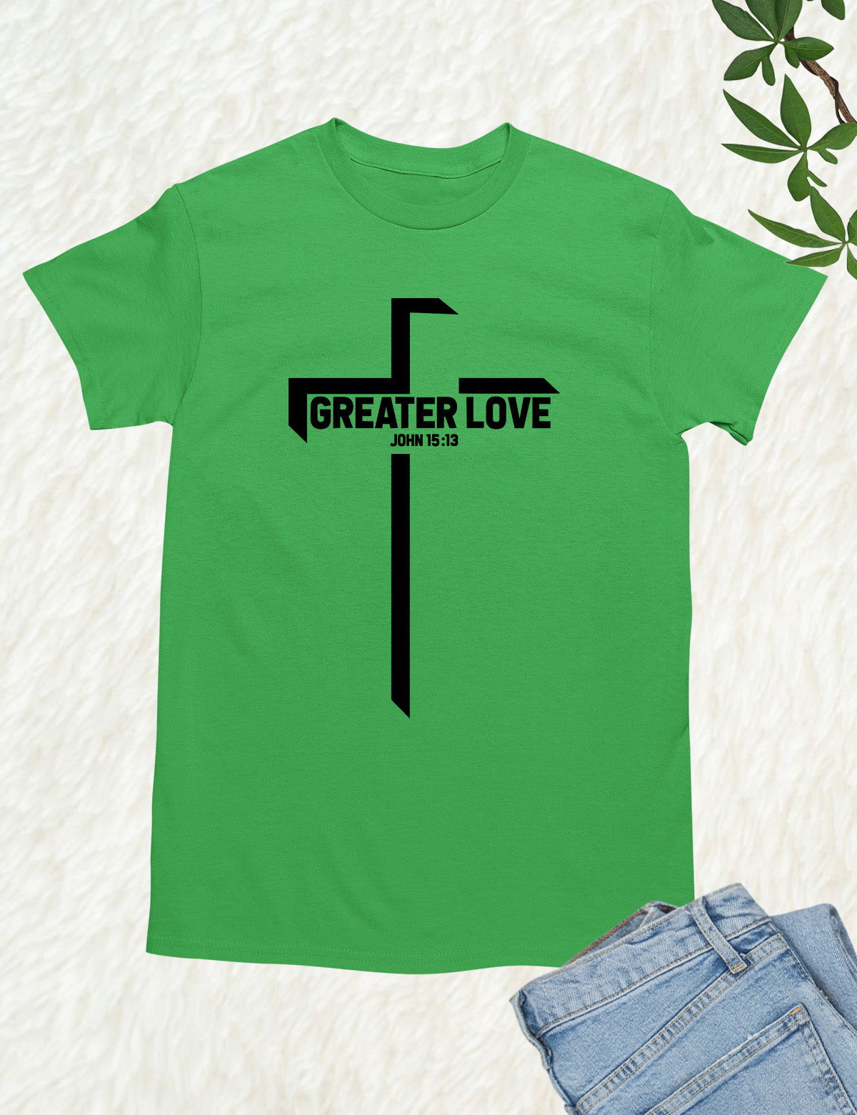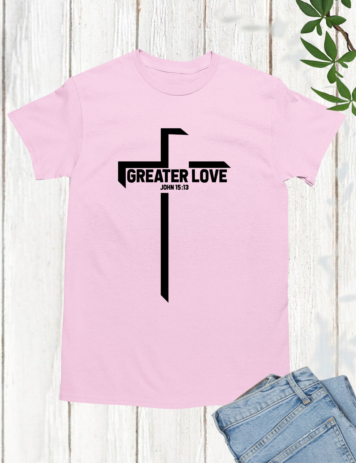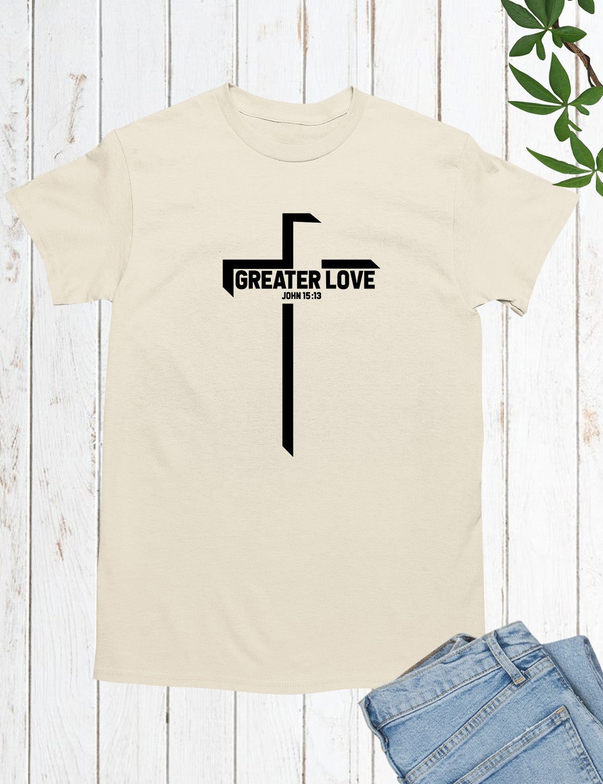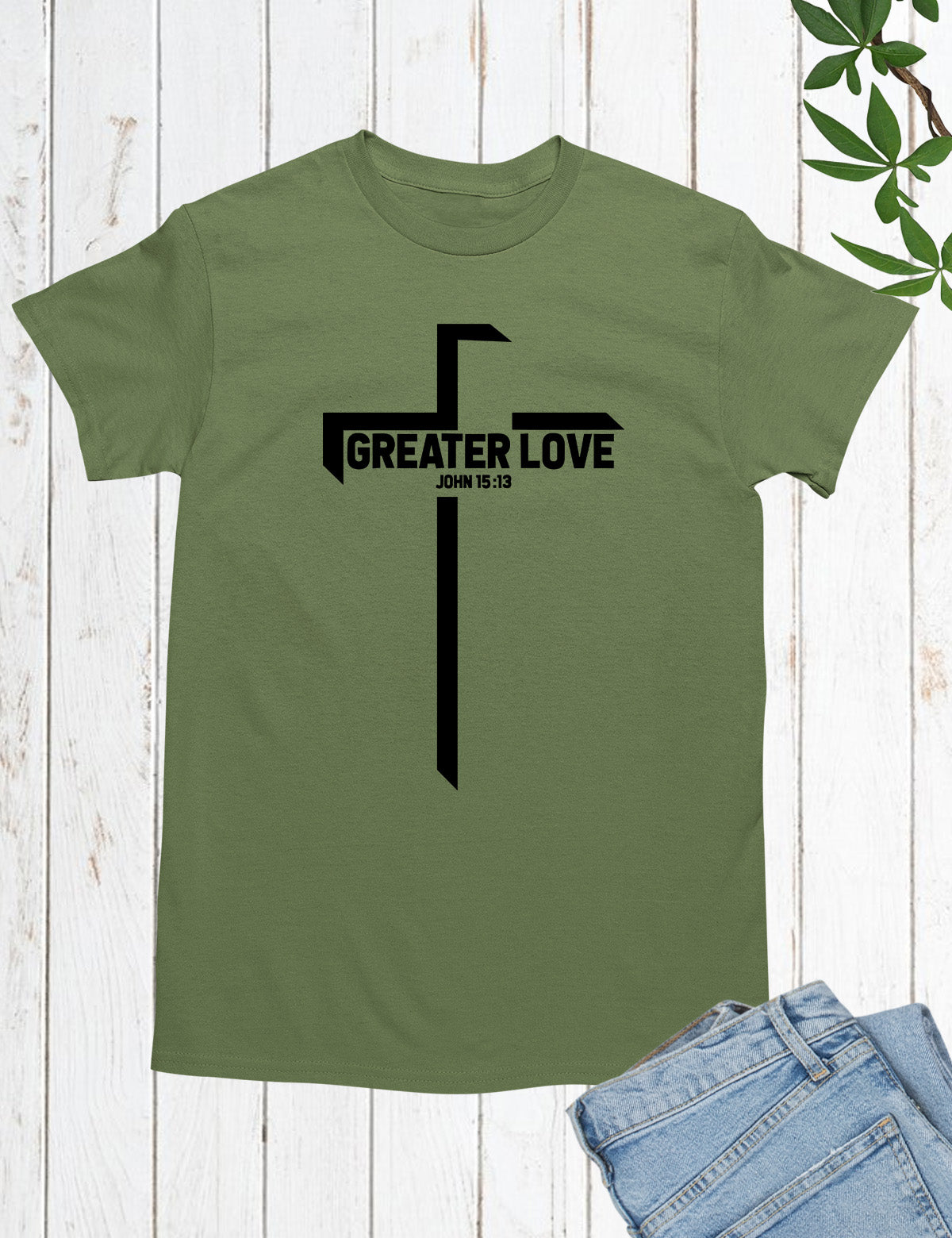 Show your faith and love with our No Greater Love John 15 13 Bible verse shirt. Made with high-quality materials, this shirt features the powerful message of John 15:13. Wear it as a reminder to love others as Christ loved us.