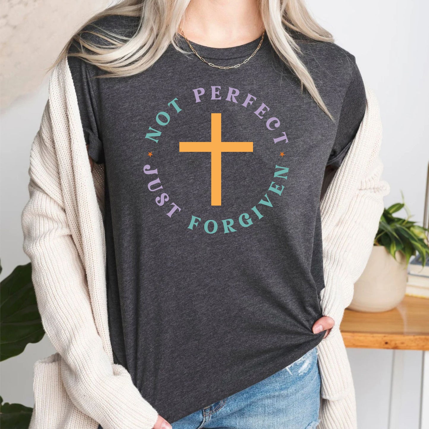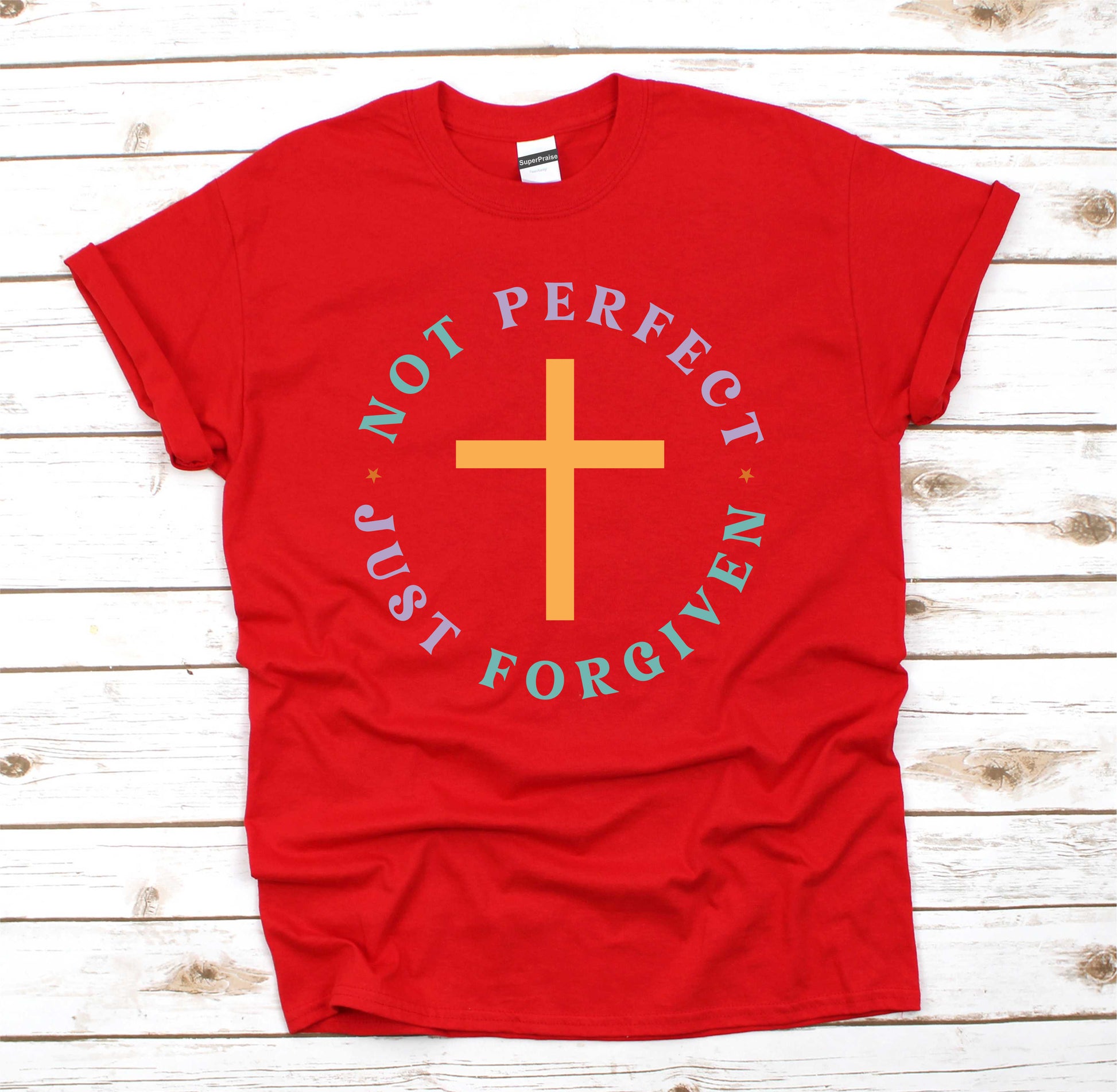 Discover the power of forgiveness with our "Not Perfect Just Forgiven" t-shirt. Featuring inspiring Bible verse quotes, this faith-based shirt will remind you of the unconditional love and grace of Jesus. Embrace imperfection and spread the message of forgiveness with this comfortable and stylish tee.