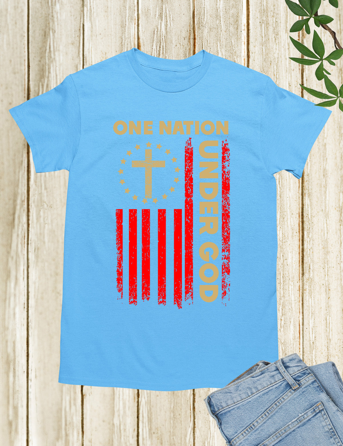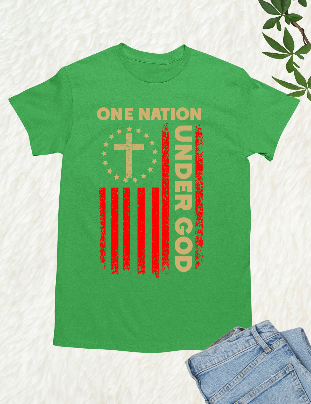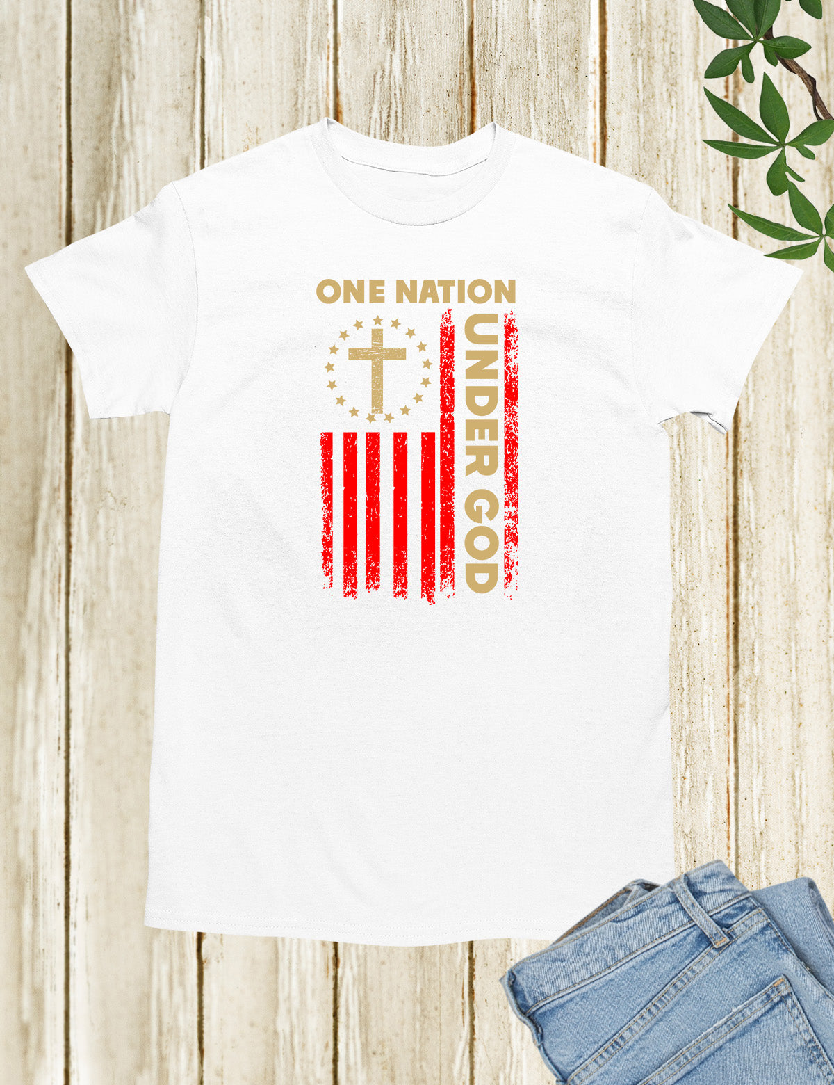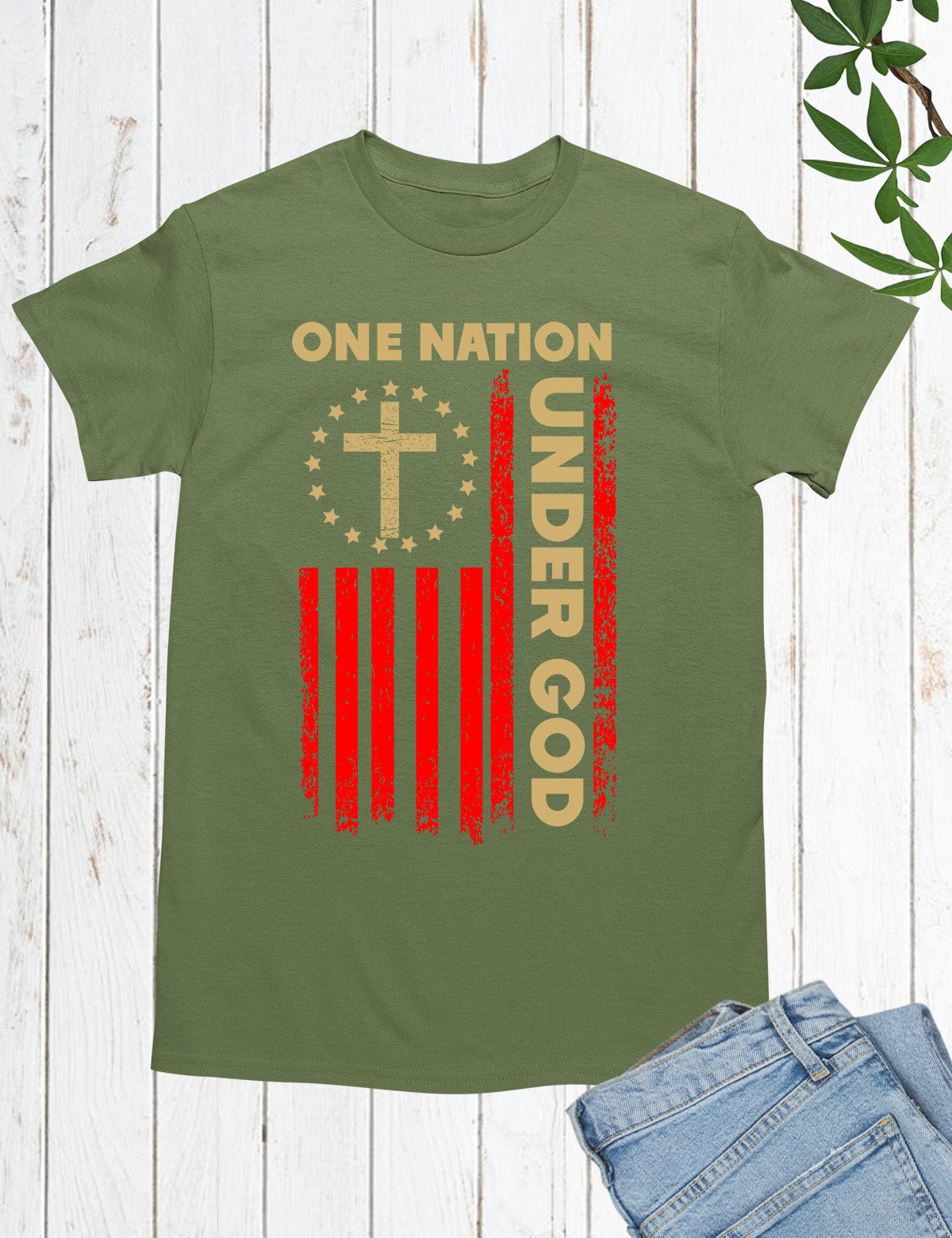 Represent your faith and patriotism with the One Nation Under God Flag Christian T-Shirt. This classic tee features a striking design that proudly displays your love for God and country. Made with high-quality materials, it offers both style and comfort. Perfect for any occasion, wear it with pride and spread the message of unity and faith.