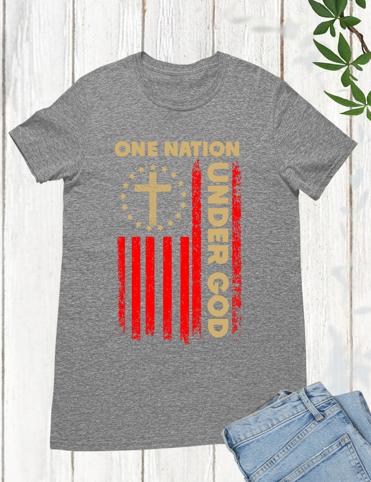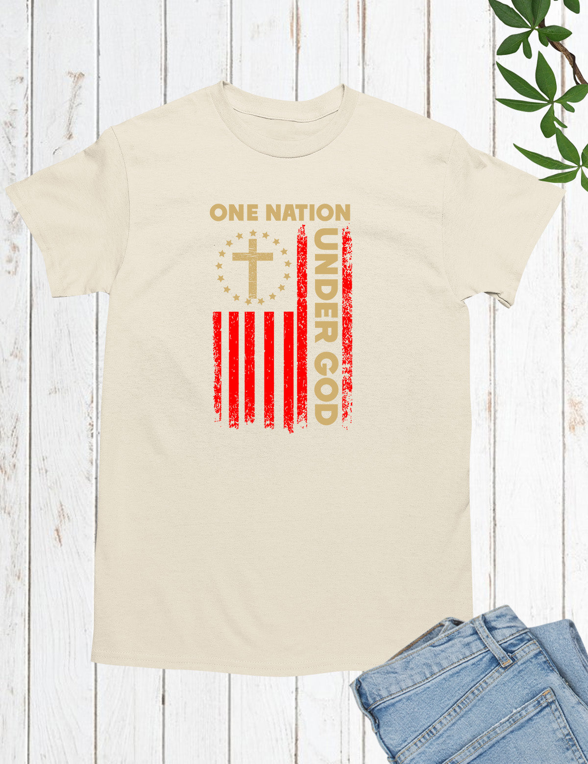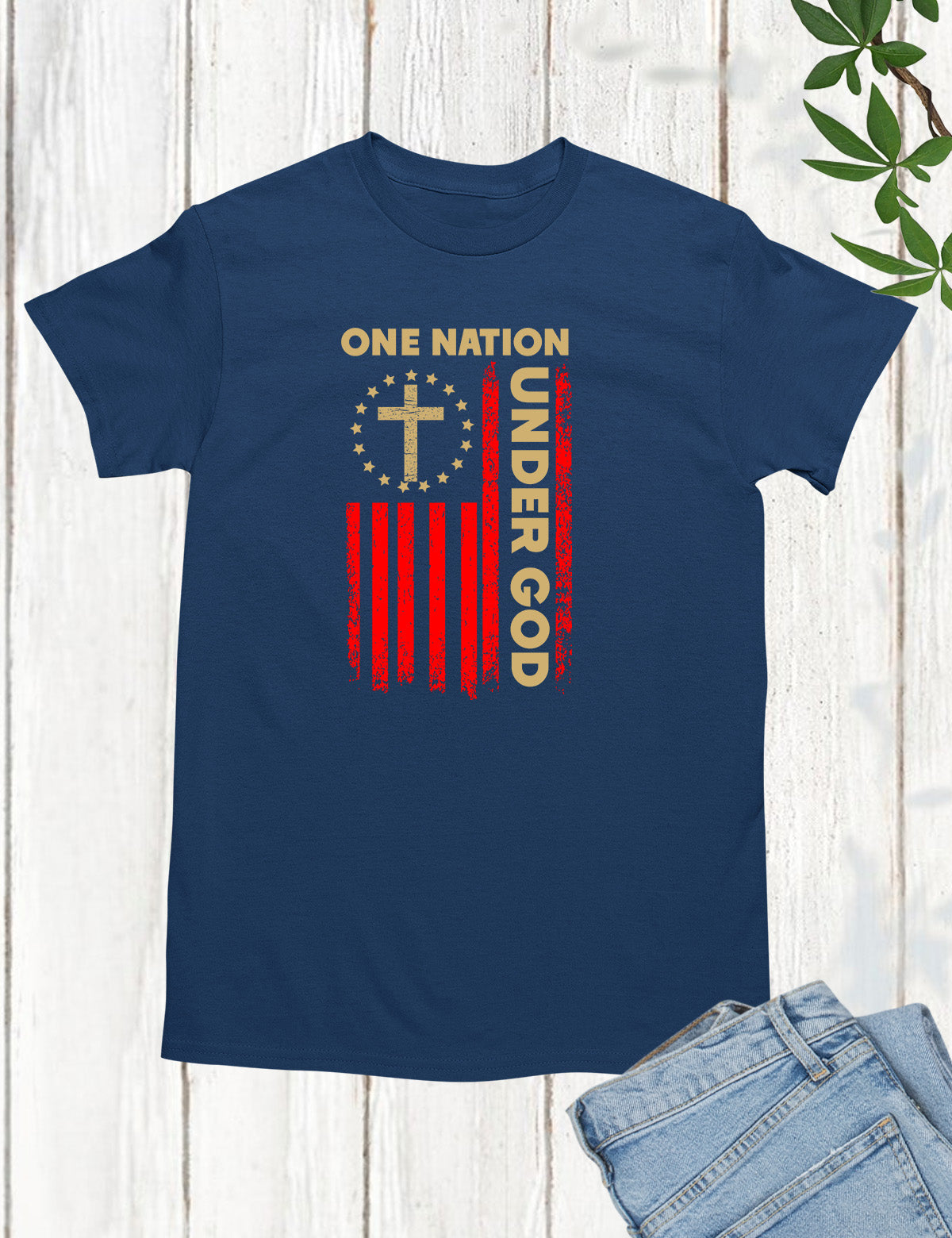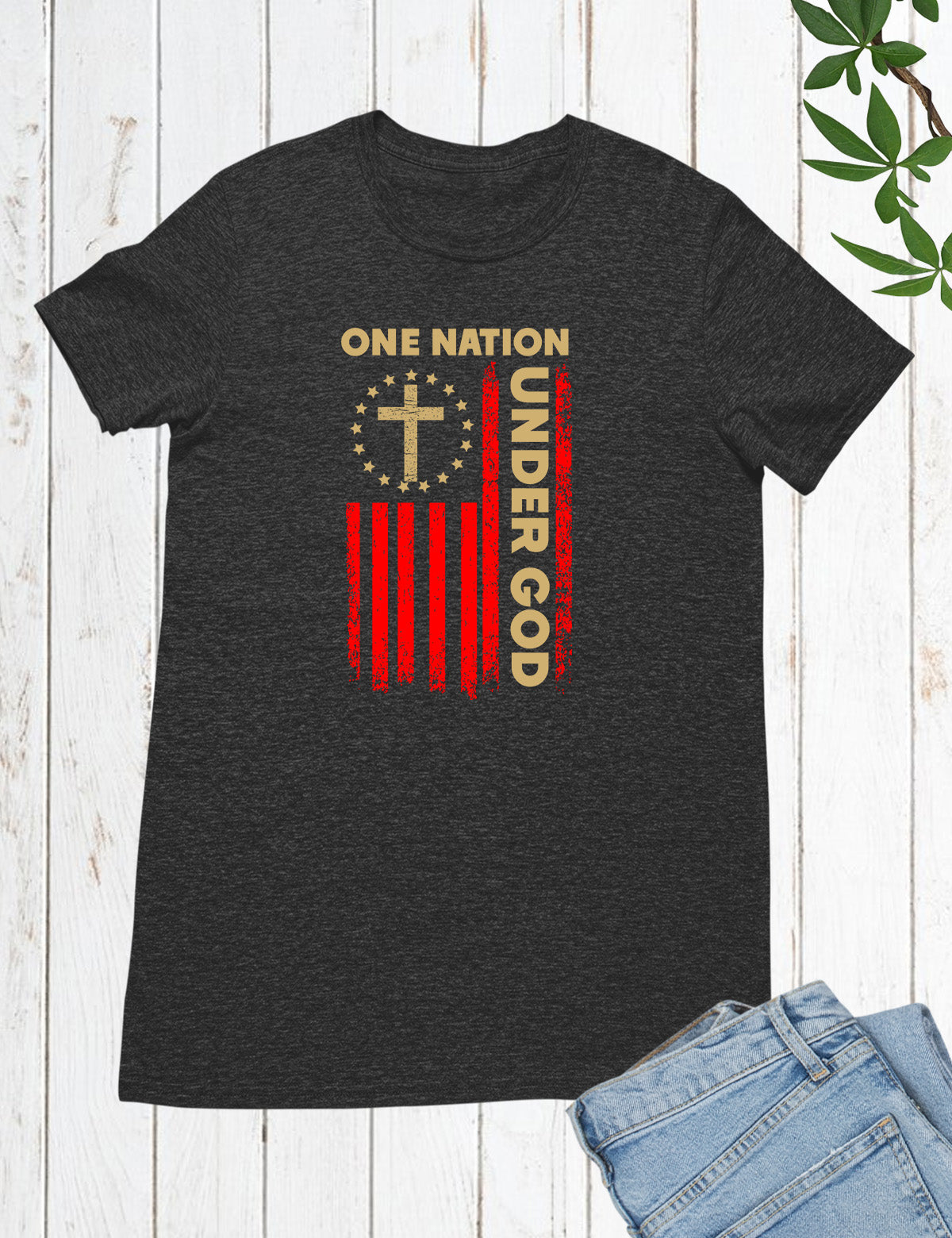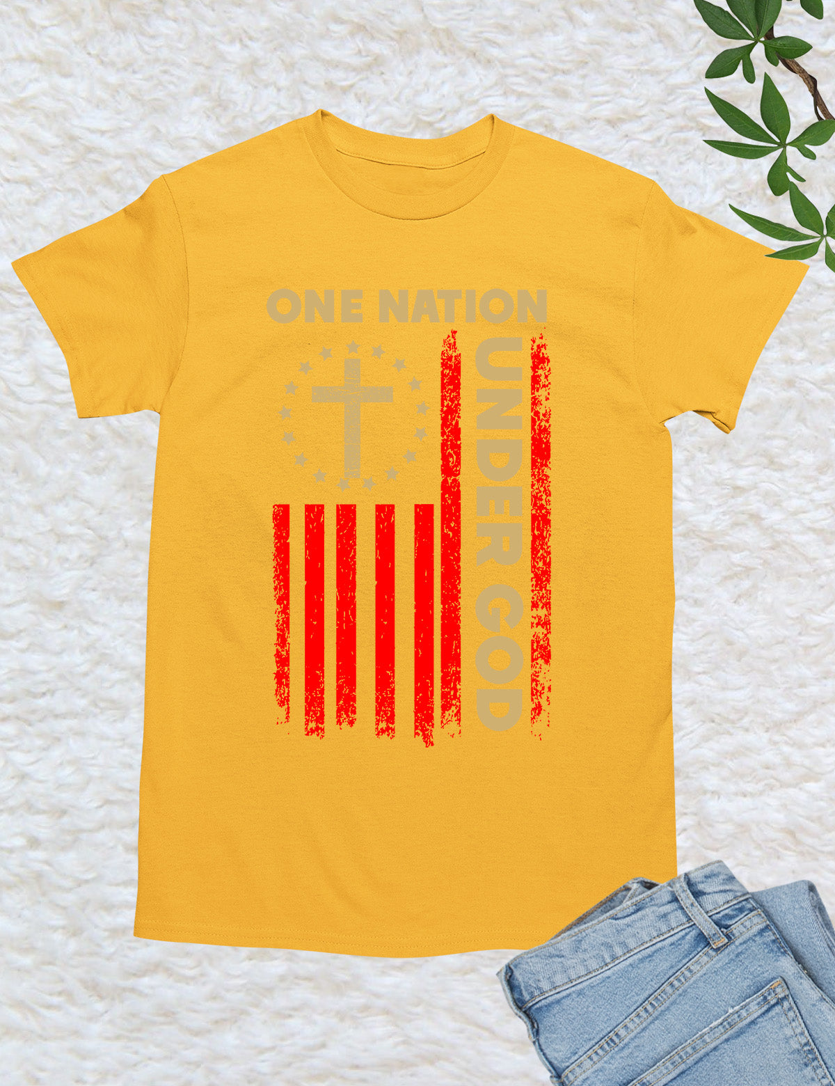 Represent your faith and patriotism with the One Nation Under God Flag Christian T-Shirt. This classic tee features a striking design that proudly displays your love for God and country. Made with high-quality materials, it offers both style and comfort. Perfect for any occasion, wear it with pride and spread the message of unity and faith.