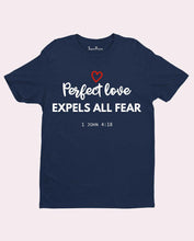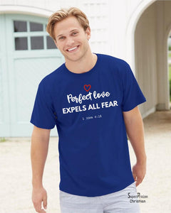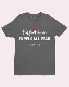 Experience the power of perfect love with our Perfect Love Expels All fear Bible Verse T Shirt. Made with high-quality material, this shirt features a powerful message that will inspire and uplift your faith. Spread love and conquer fear with every wear.