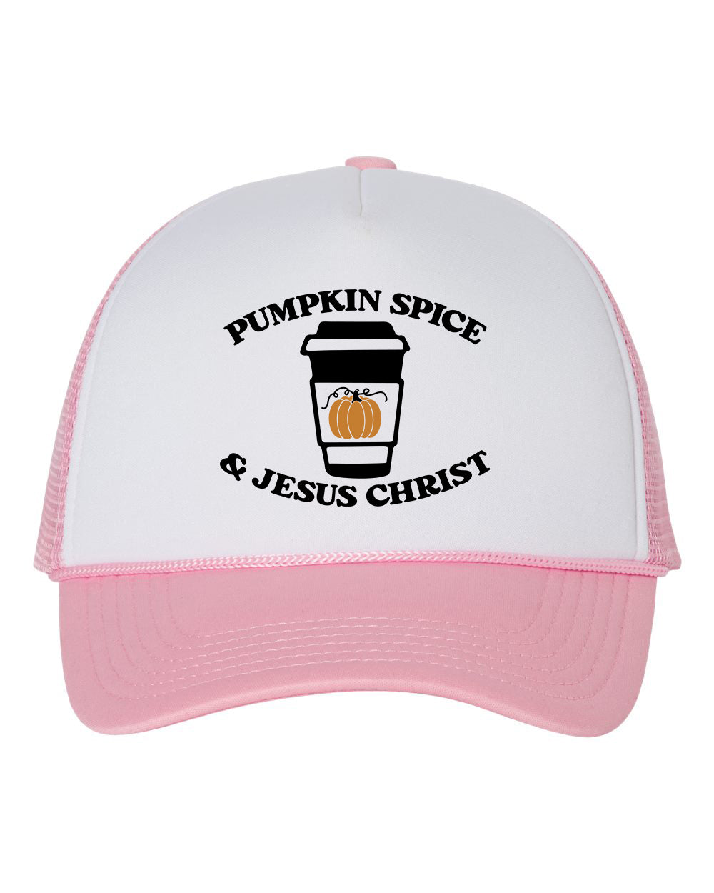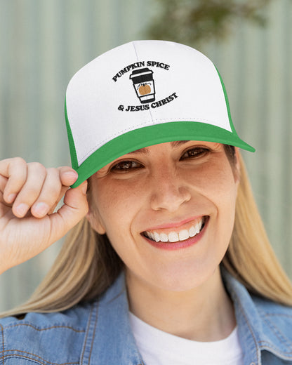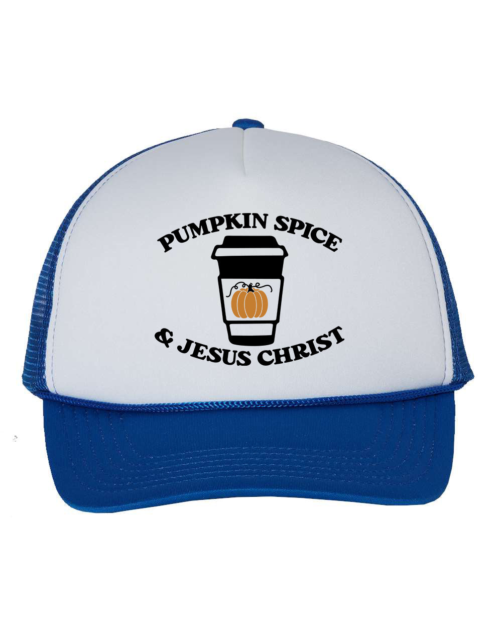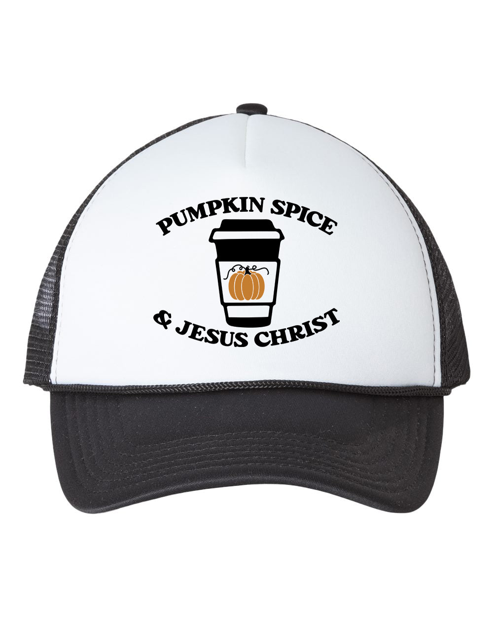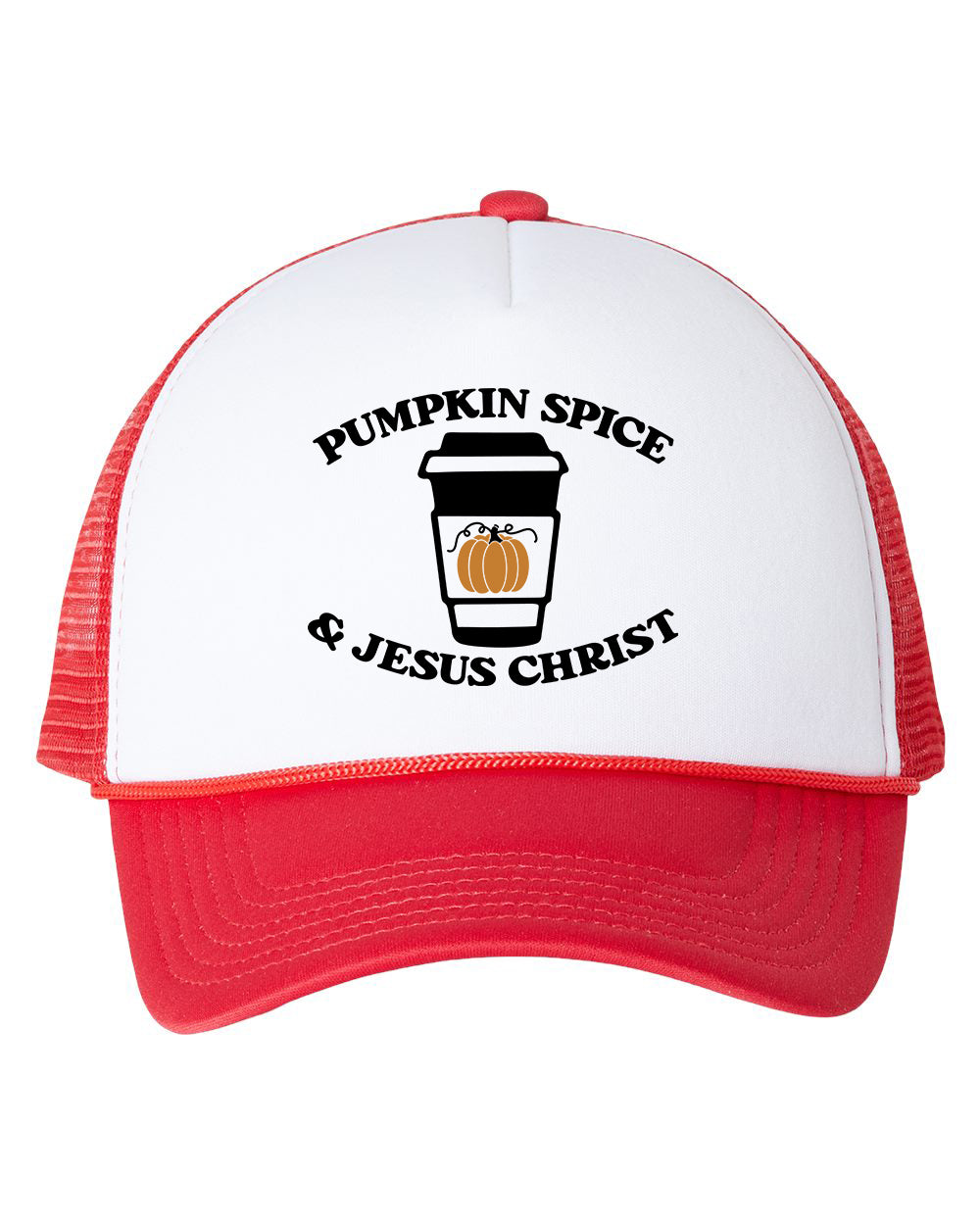 Introducing the Pumpkin Spice Jesus Christ Cap - a stylish and unique trucker hat! Made with warm and comforting pumpkin spice colors, this cap is perfect for any occasion. Show off your love for Jesus Christ while staying trendy and comfortable.