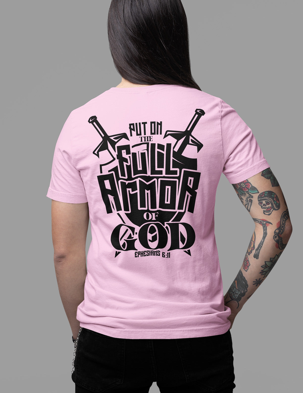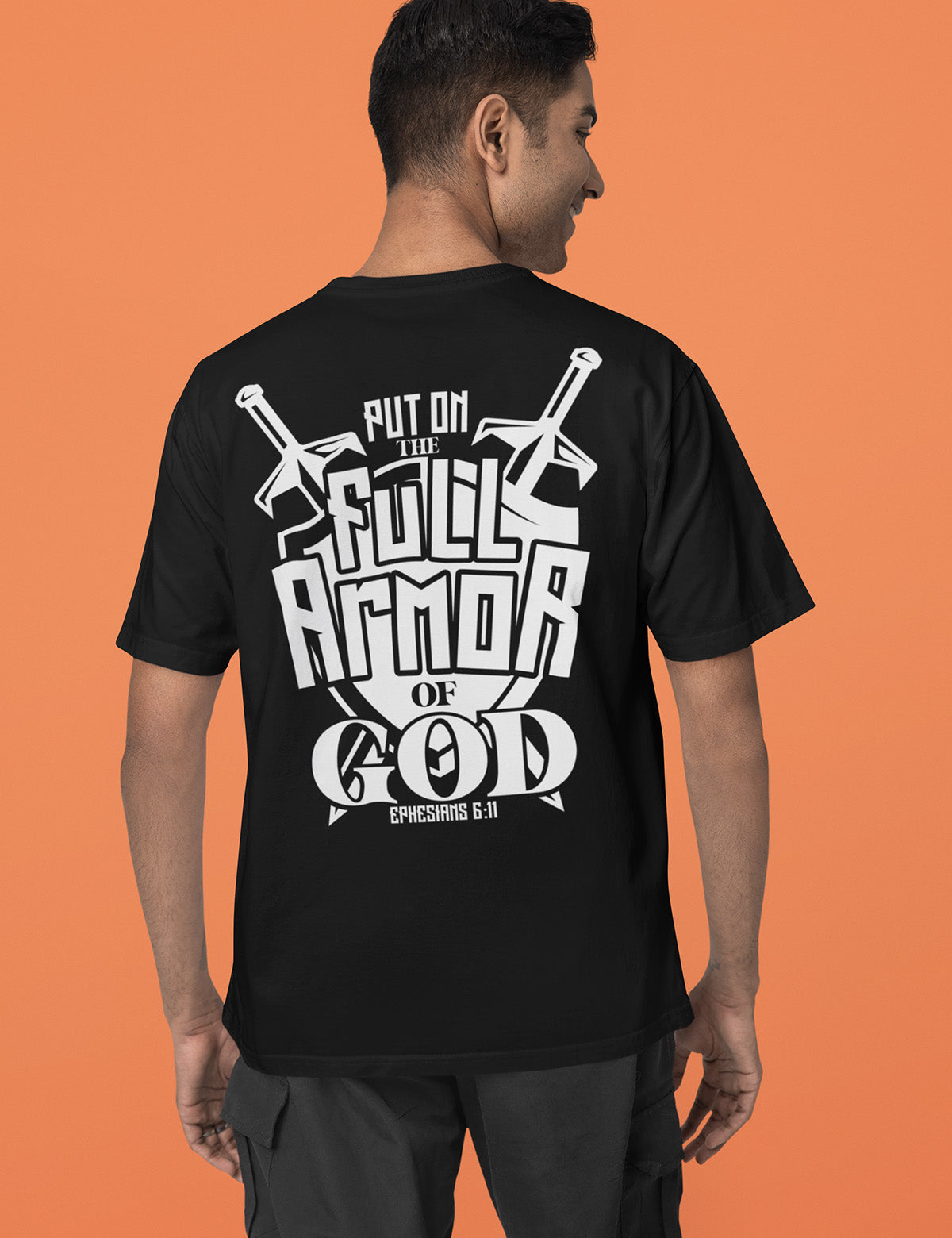 This expertly designed shirt is a tangible reminder to "put on the full armour of God" from Ephesians. Made with quality material, this back print shirt offers both comfort and style. Be equipped with faith while representing your beliefs with this impactful piece.