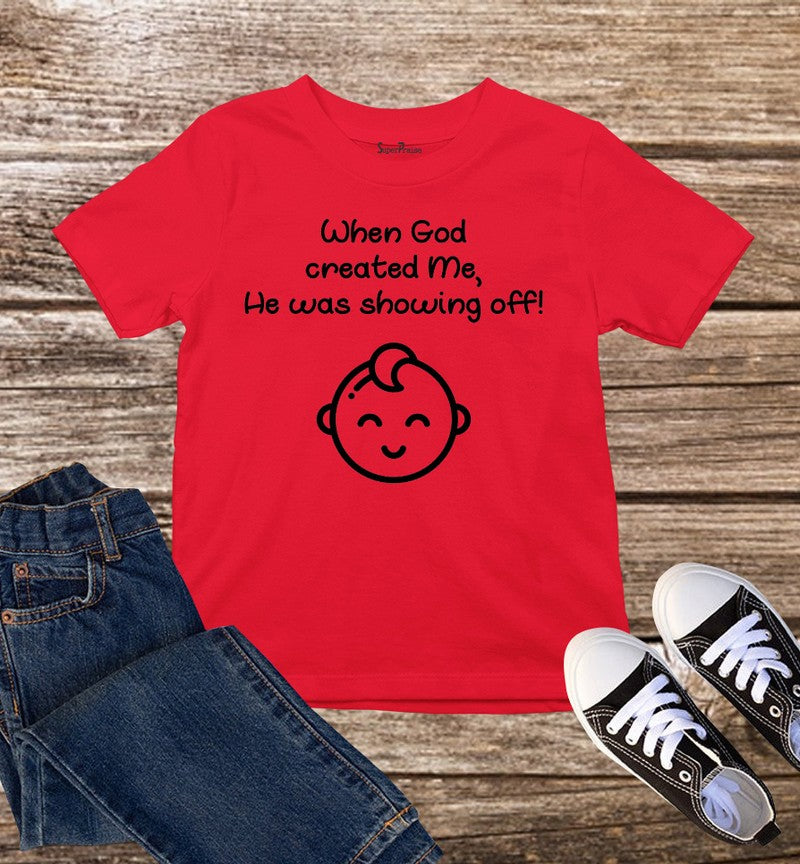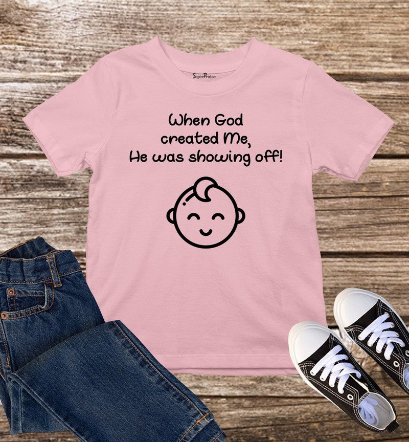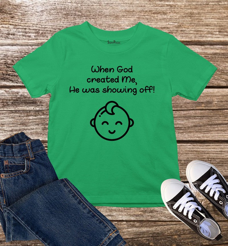 Showing Off God Kids T Shirt is cool stylish and comfy to wear while proclaiming the gospel of Christ. This Christian children t shirts come in unisex style for boys and girls.