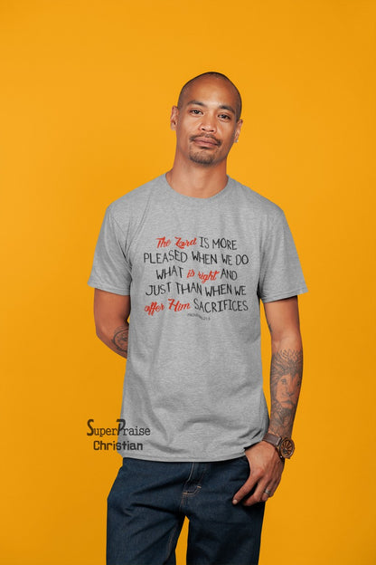 This Christian t-shirt features the phrase "The Lord Is More Pleased" as a reminder to prioritize God's approval above all else. With a sleek design and comfortable fit, it is perfect for believers looking to spread a message of faith and devotion.