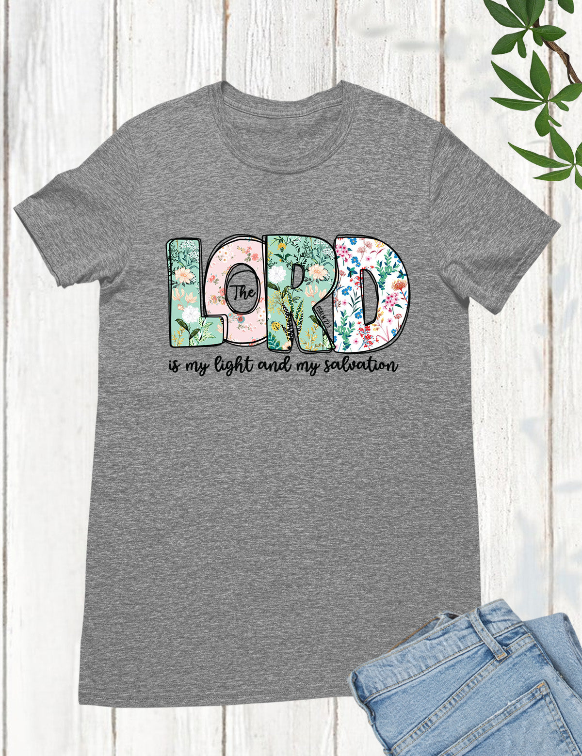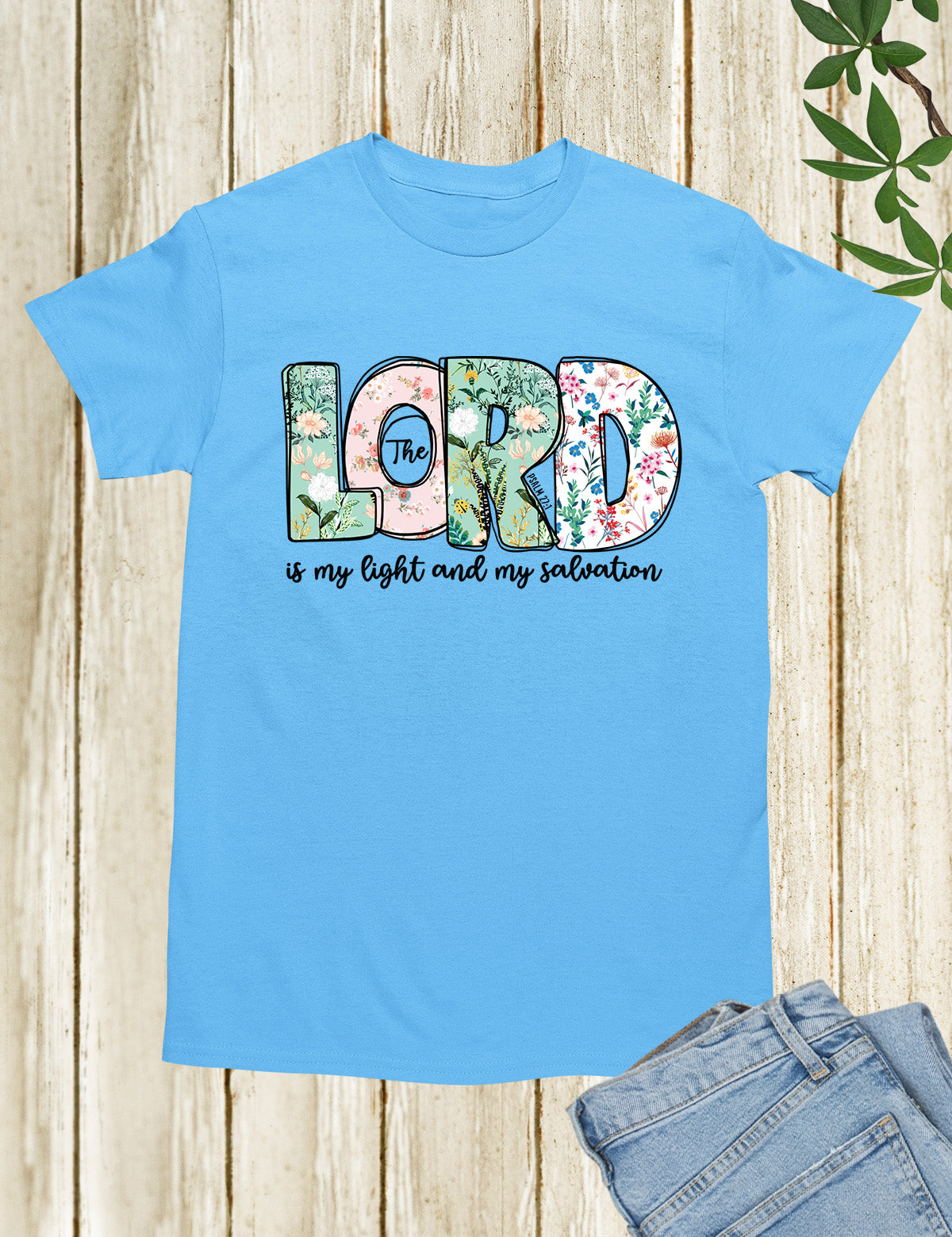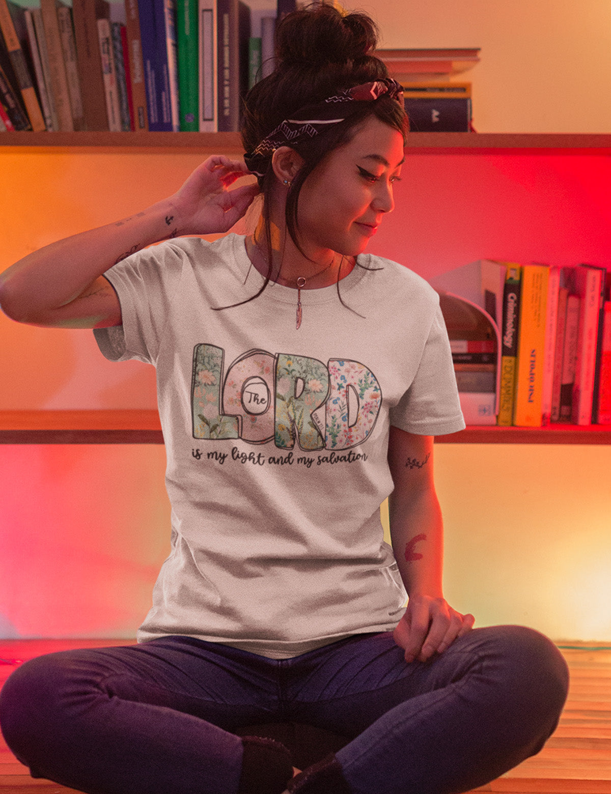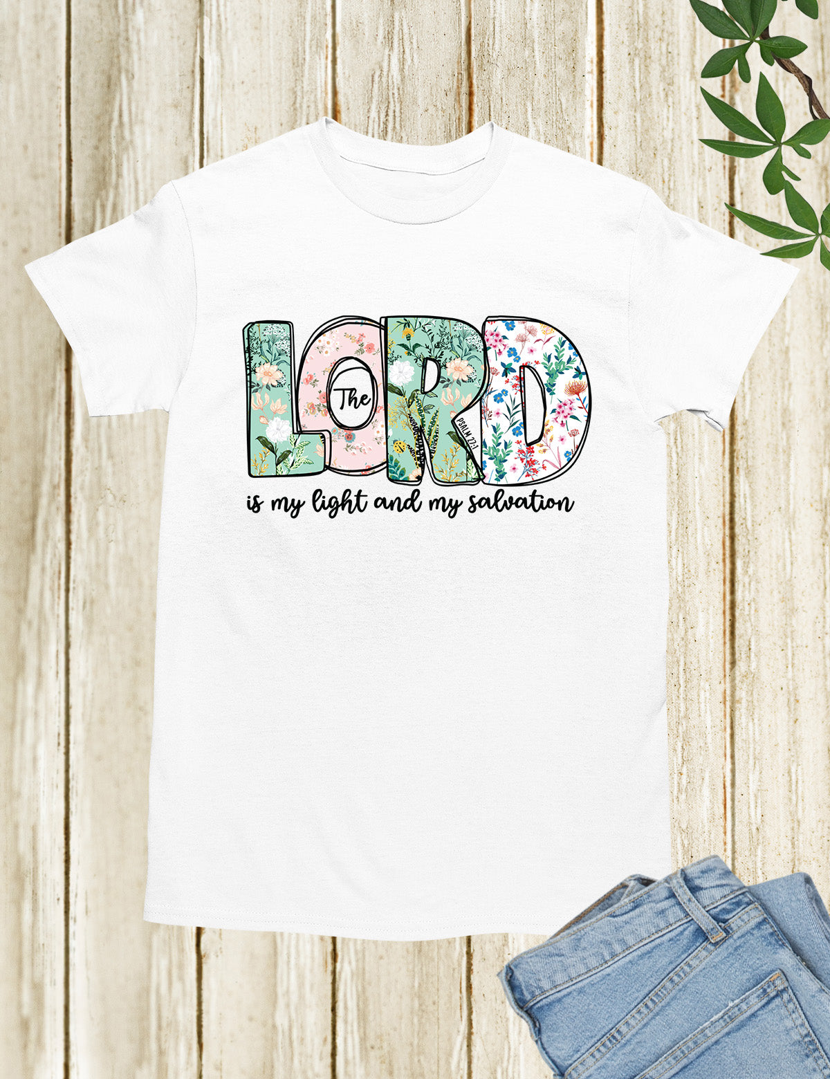This shirt features the powerful message "The Lord is My Light and Salvation" written in a beautiful floral design. Perfect for sharing your faith and reminding others of the hope and strength found in the Lord. Made with high-quality materials for comfort and durability.