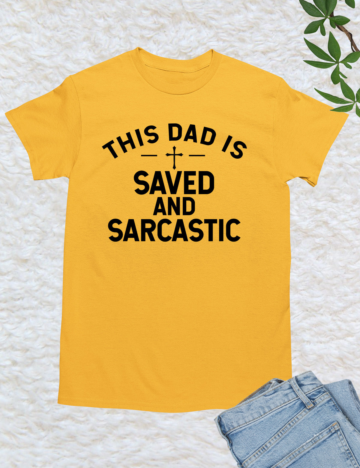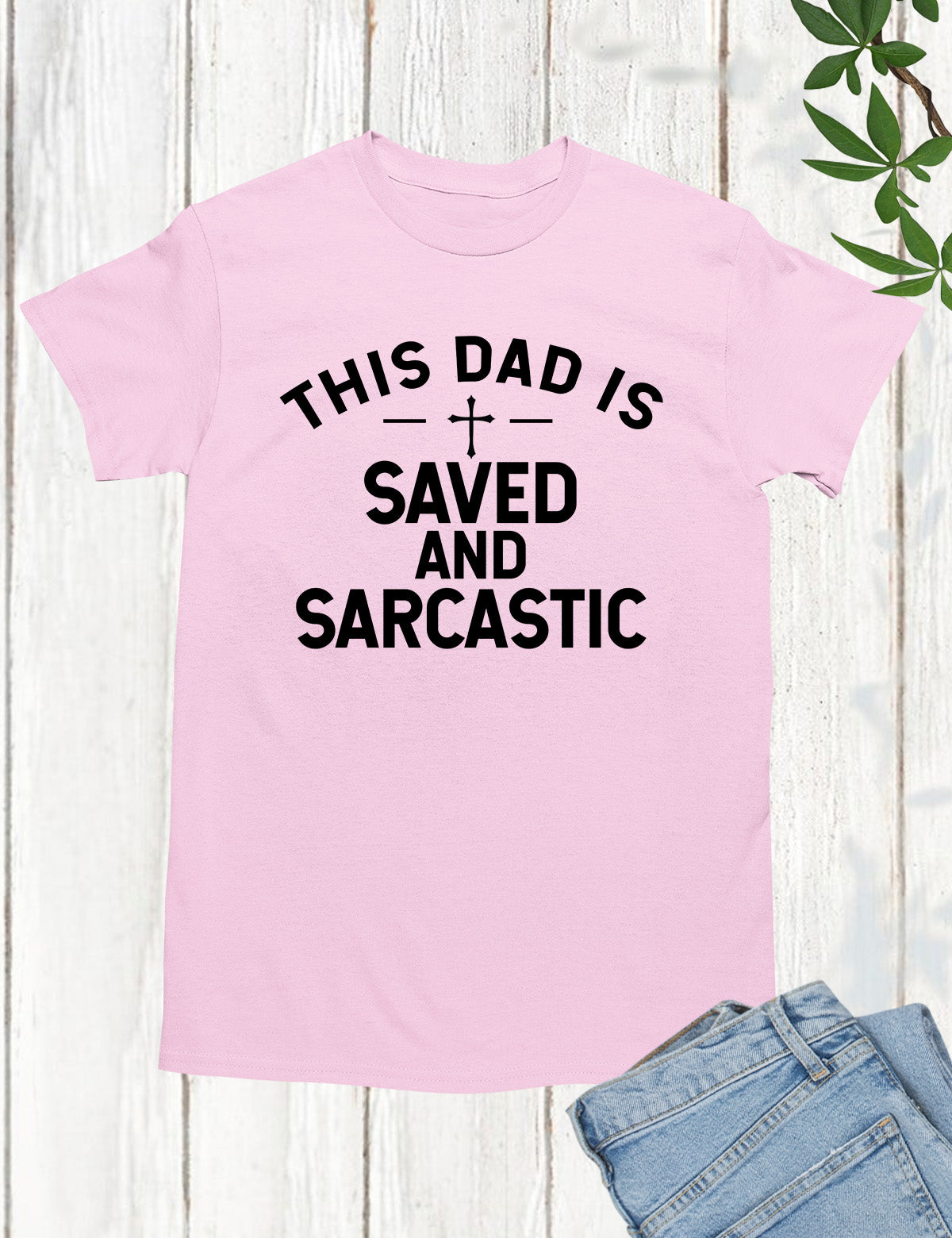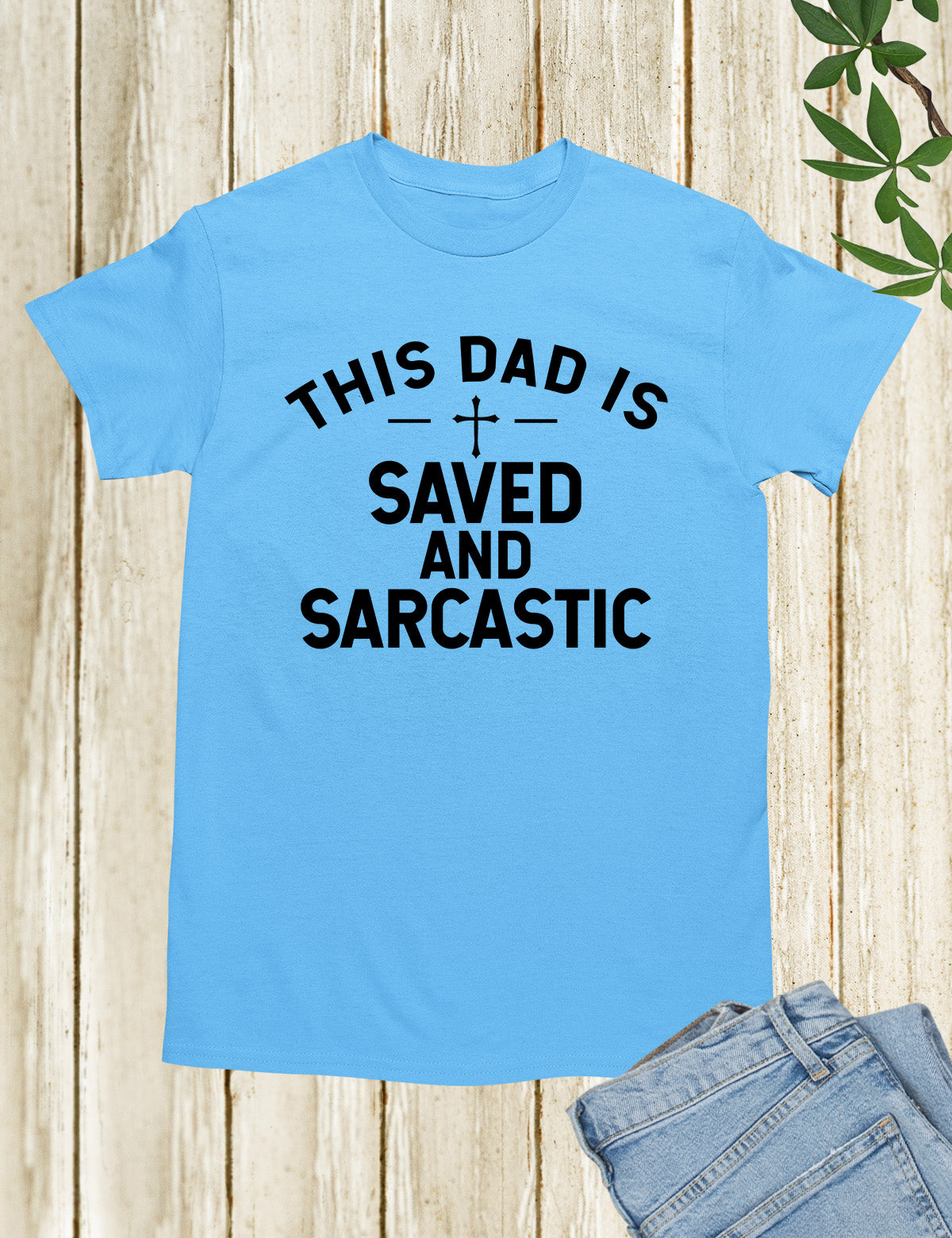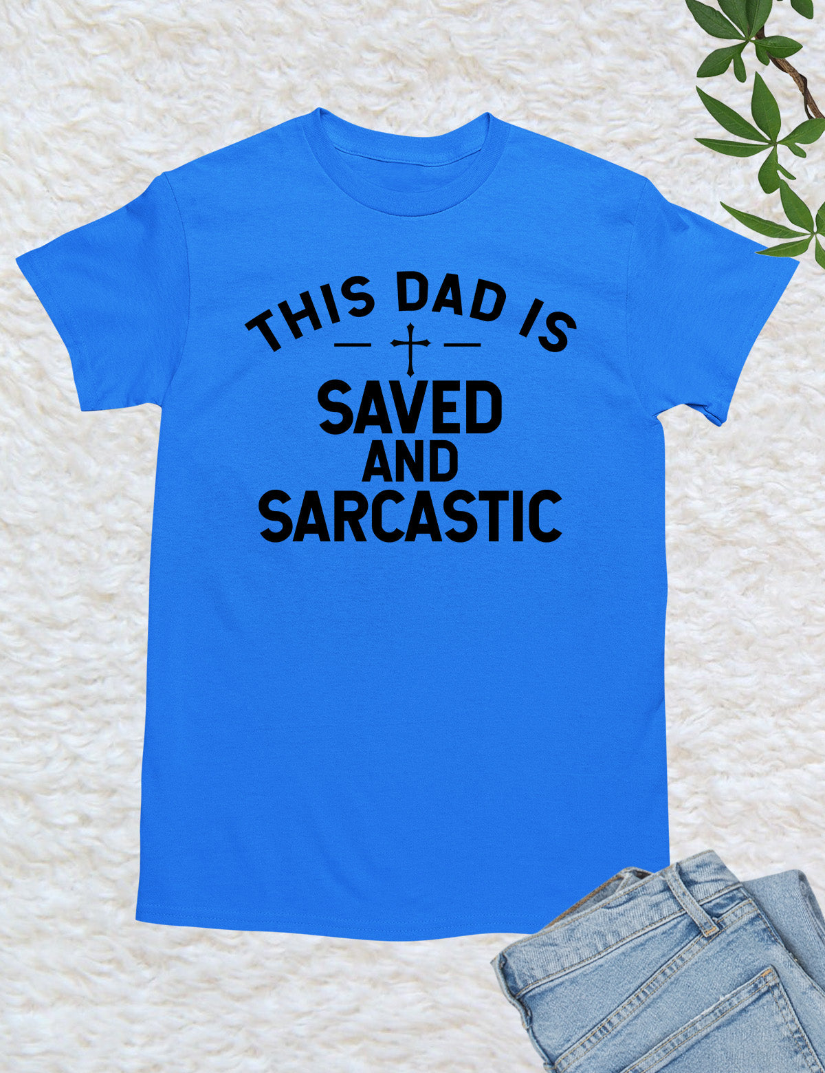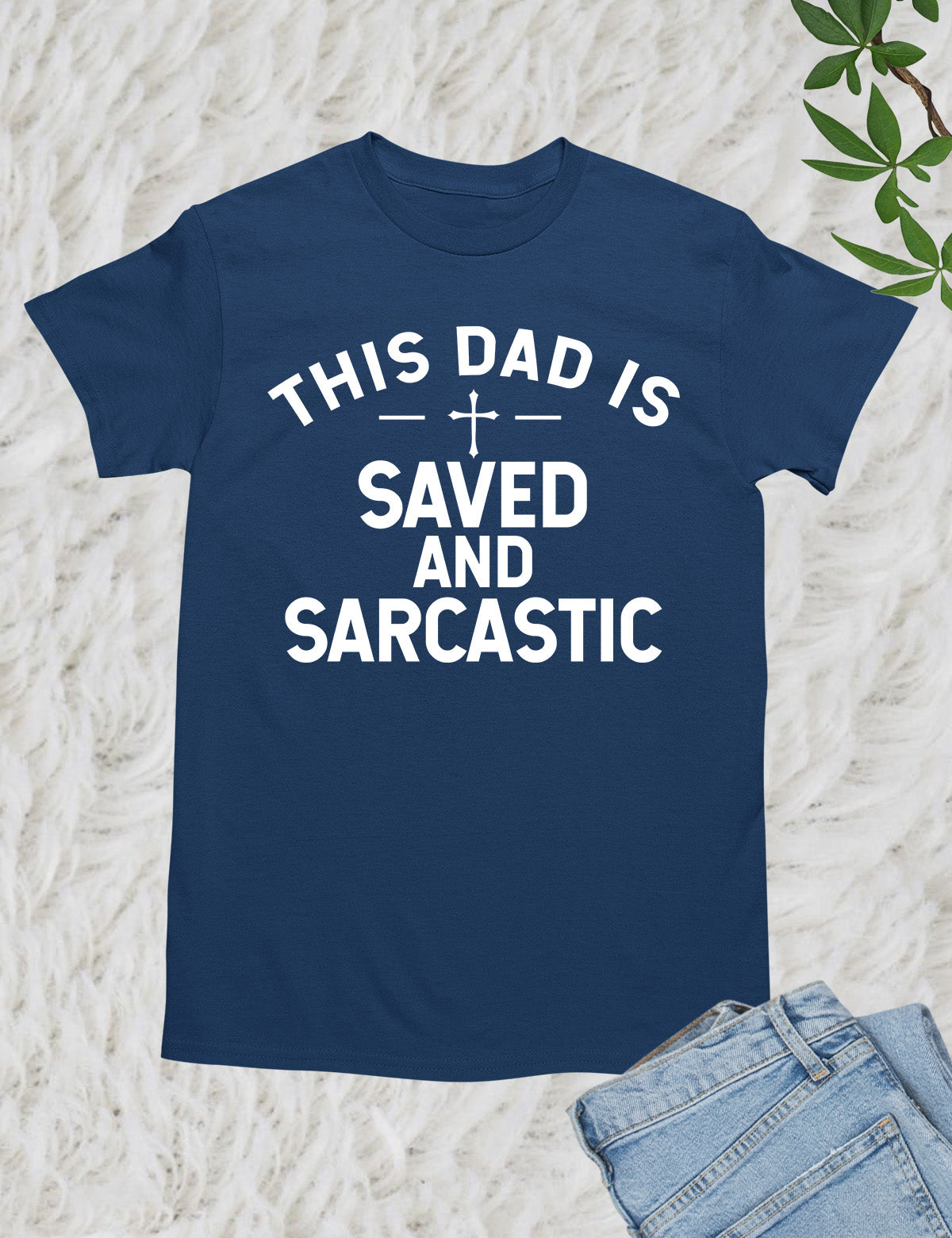Showcase your humor and faith with the This Dad is Saved and Sarcastic Shirt. Made with high-quality material, this shirt features a bold graphic of a father holding a cross with the words "This Dad is Saved and Sarcastic." Perfect for any dad who loves to make people laugh and spread the message of salvation.
