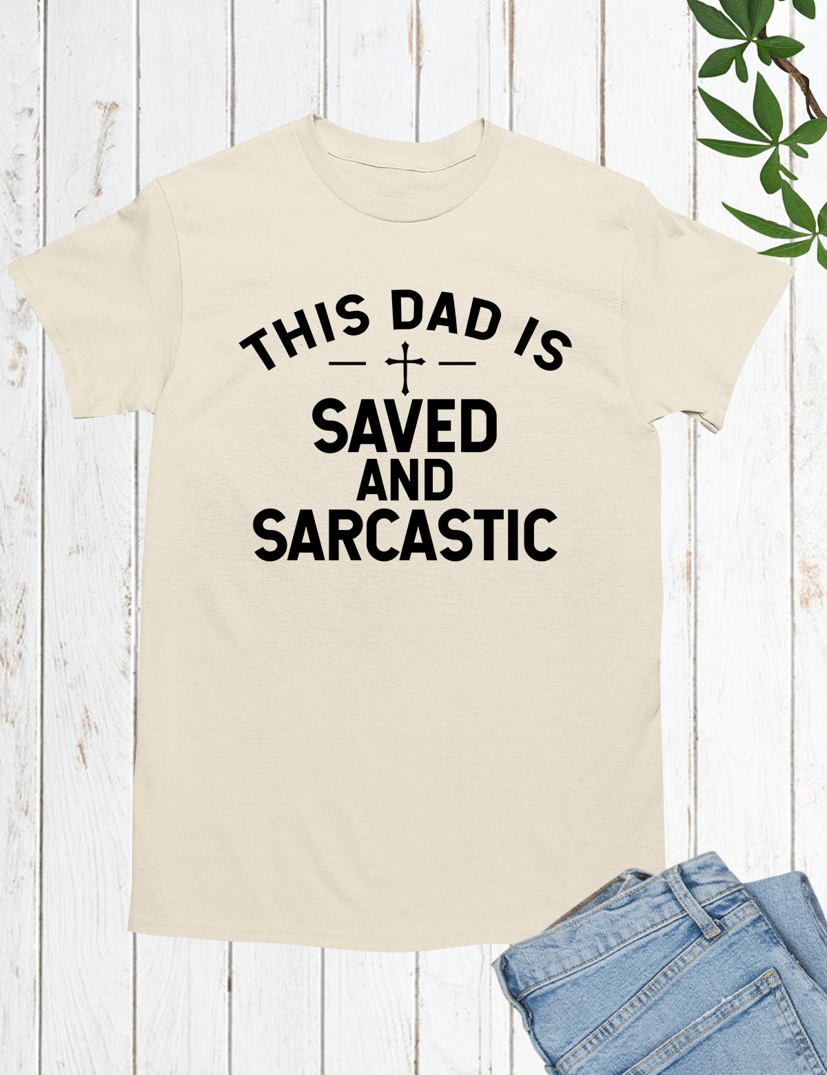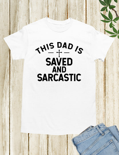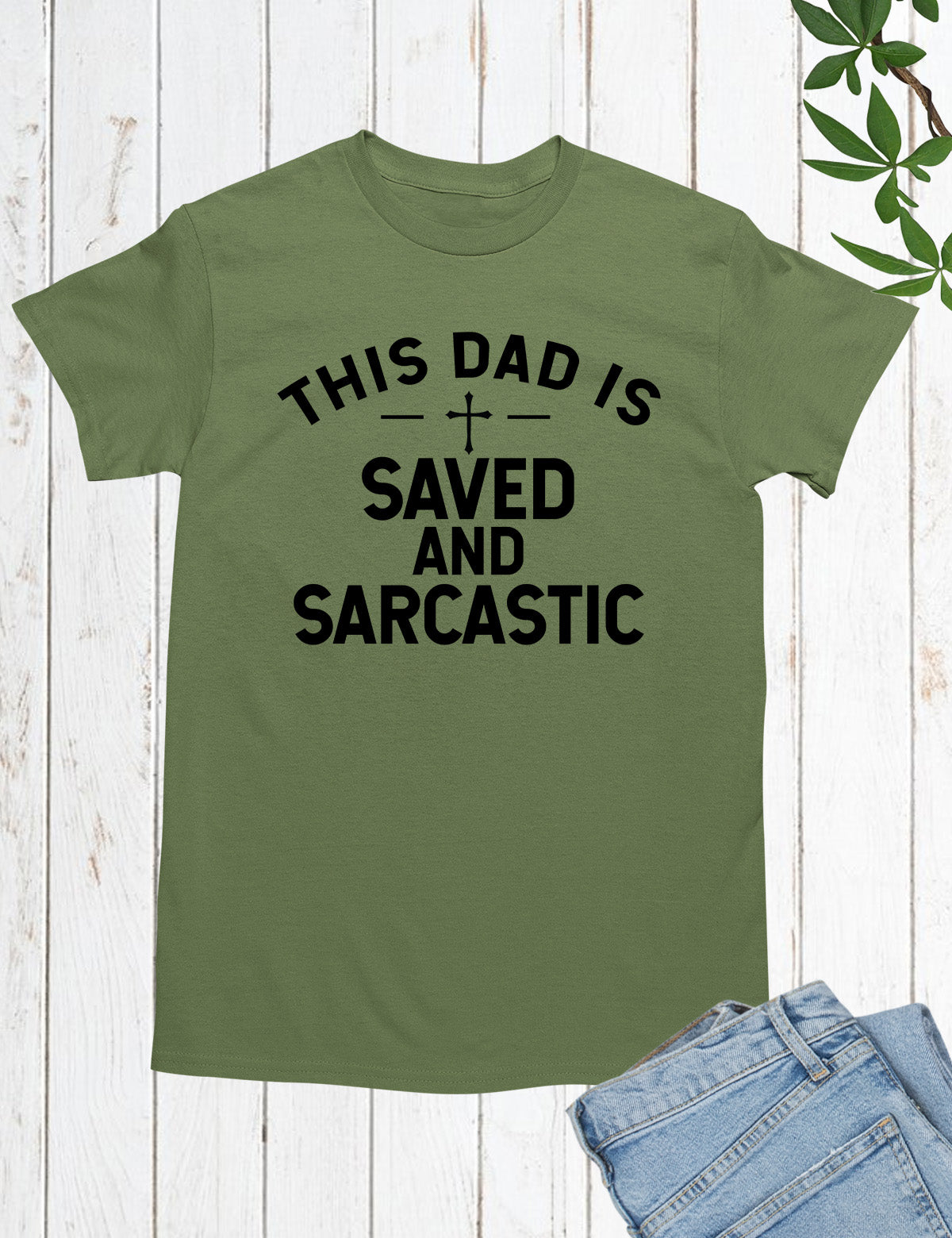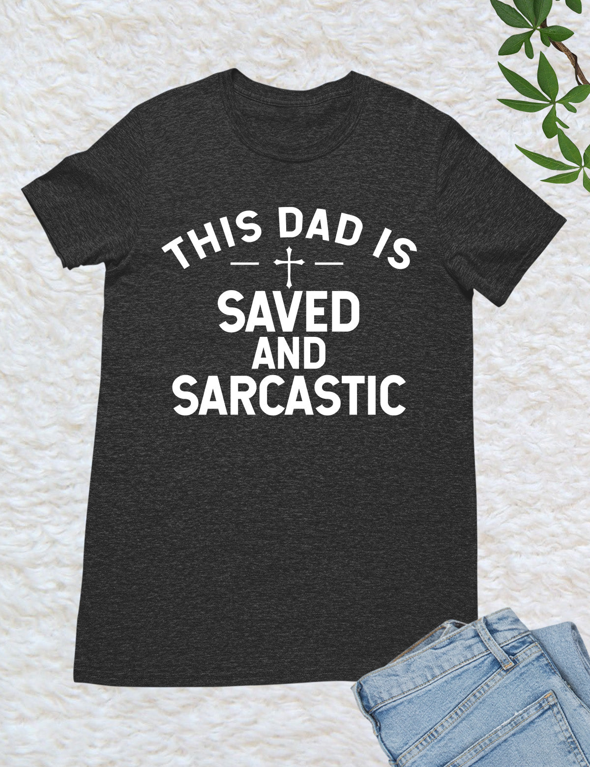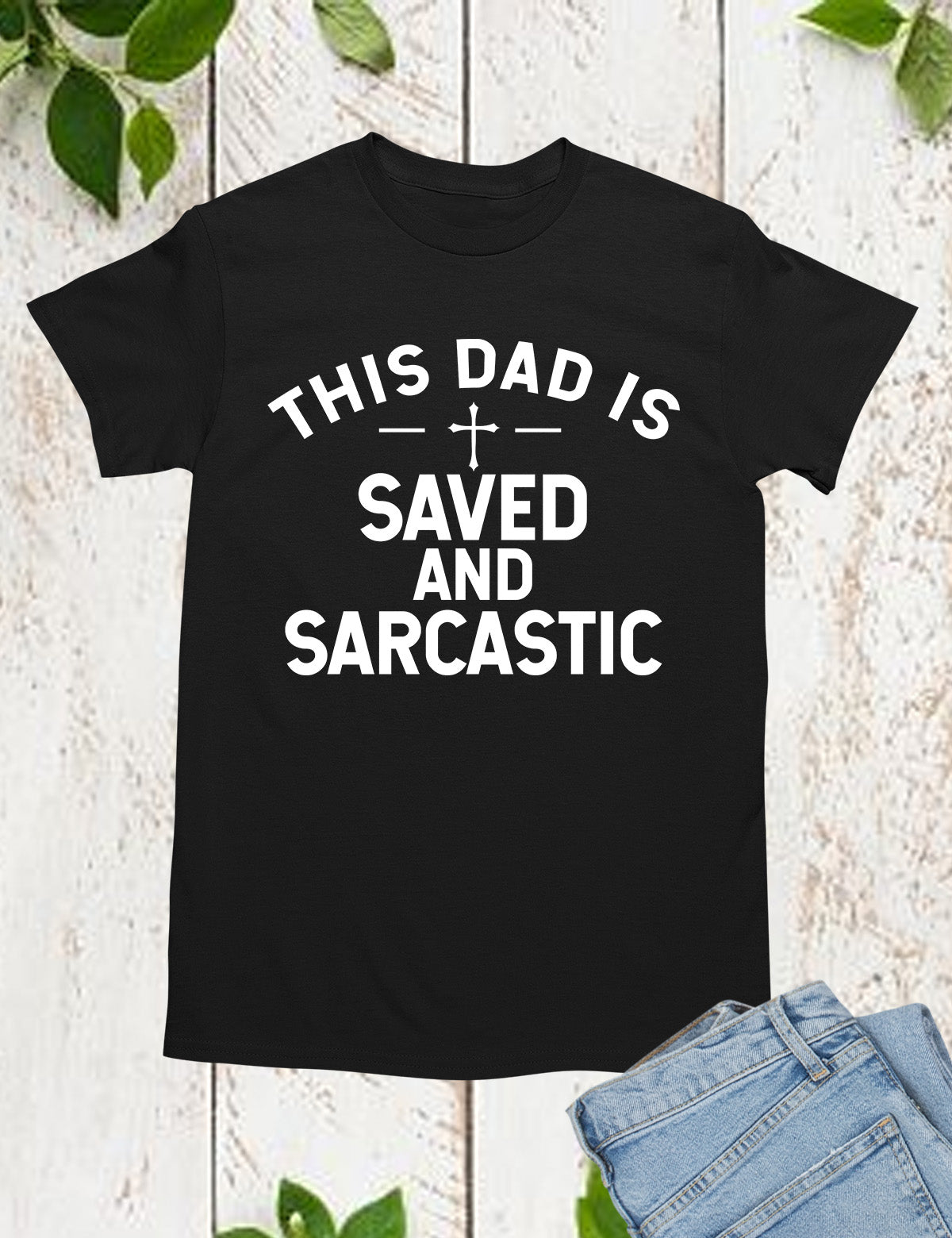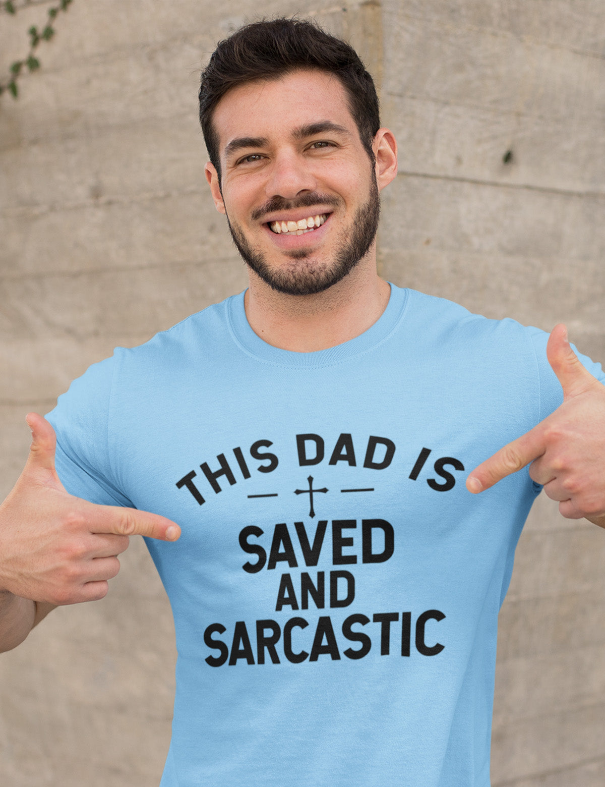 Showcase your humor and faith with the This Dad is Saved and Sarcastic Shirt. Made with high-quality material, this shirt features a bold graphic of a father holding a cross with the words "This Dad is Saved and Sarcastic." Perfect for any dad who loves to make people laugh and spread the message of salvation.