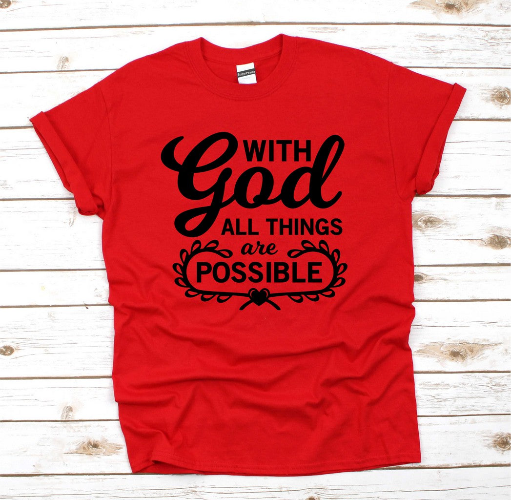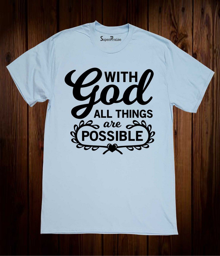 Unlock the limitless potential of your faith with our With God All Things Are Possible T Shirt. Made with high-quality materials, this shirt proudly displays a powerful statement of Christian devotion. Embrace the strength and inspiration of your beliefs with this expertly crafted garment.