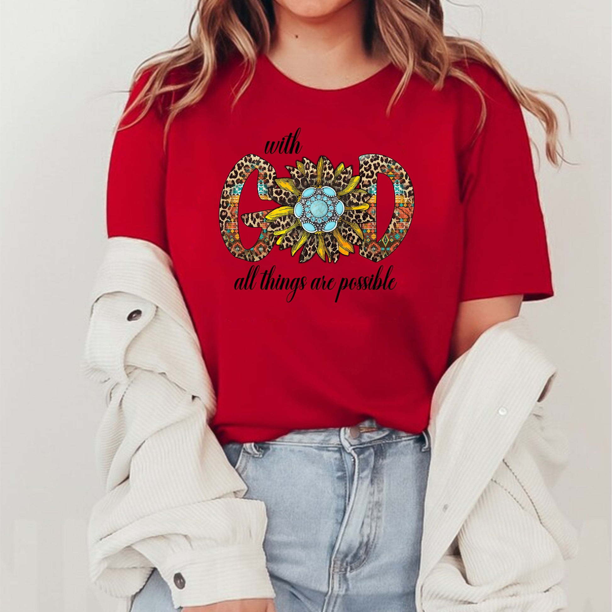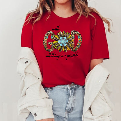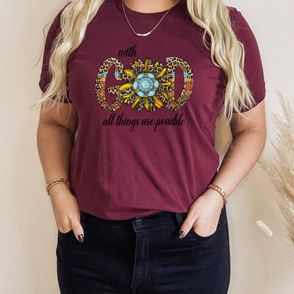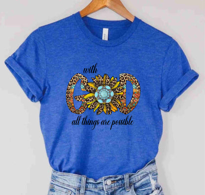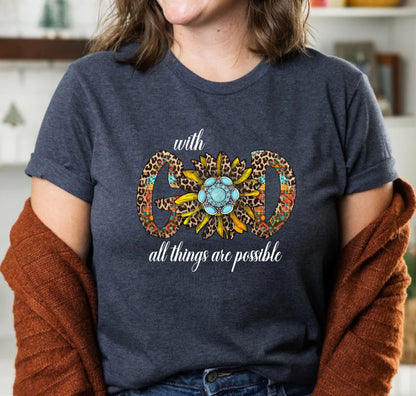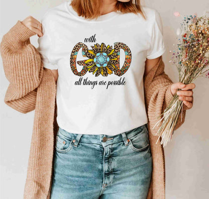 Embrace the power of faith with our "With God All Things Are Possible" religious t-shirt. Made for those who love and follow God, this shirt reminds us of the limitless possibilities that come with faith. Made with high-quality materials, this shirt is perfect for any devout Christian.